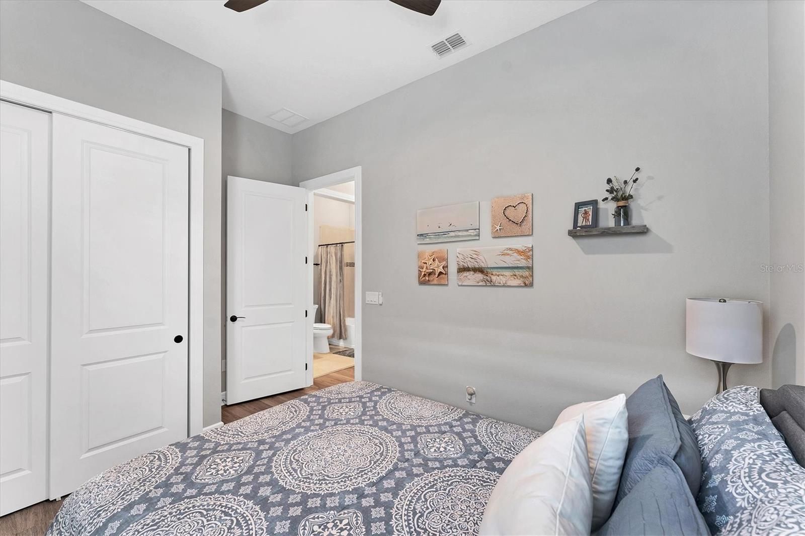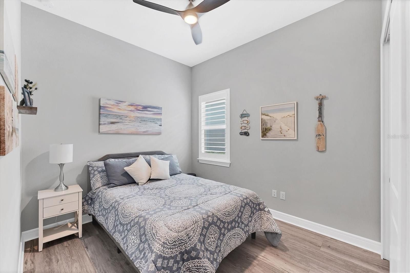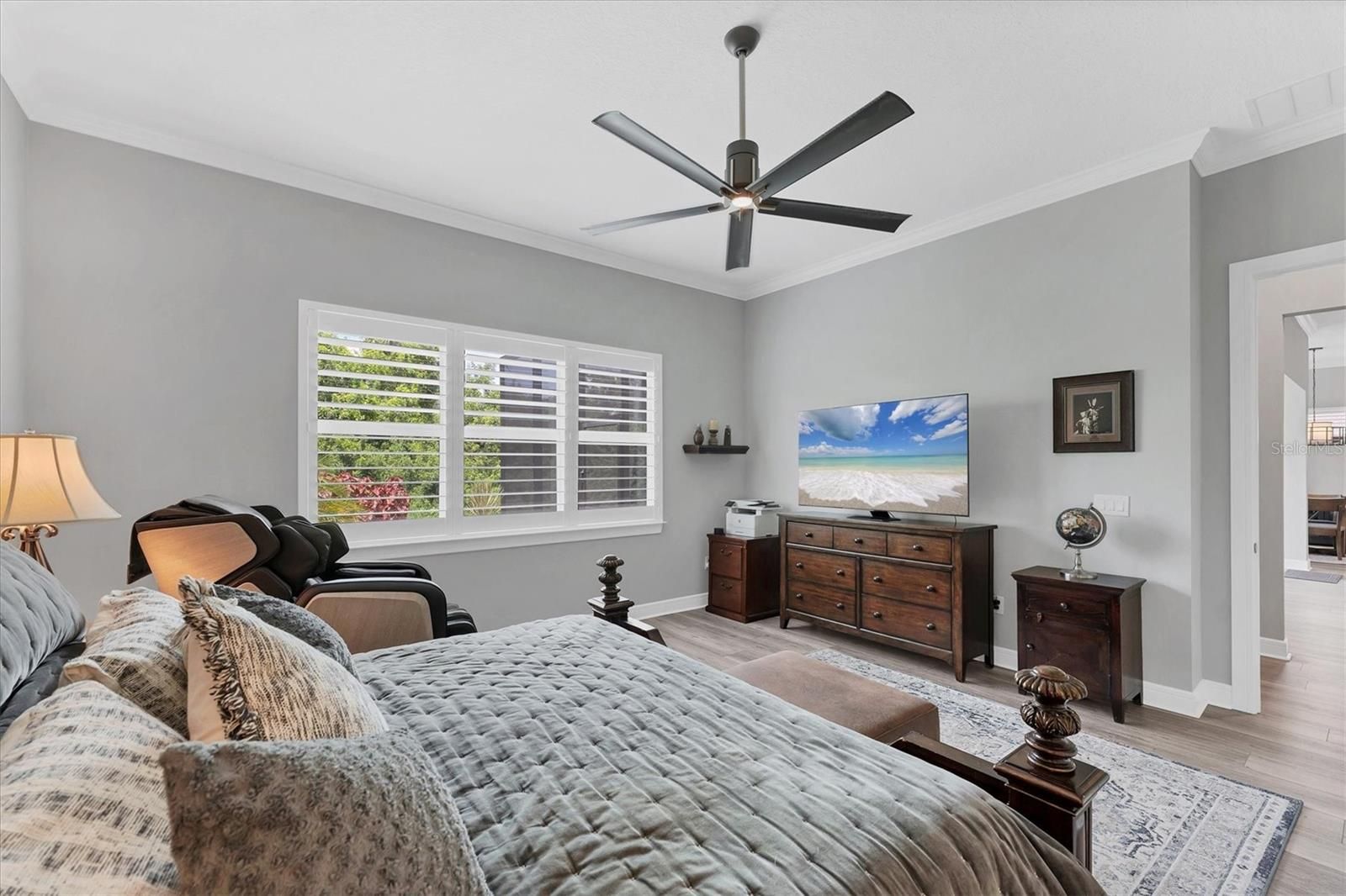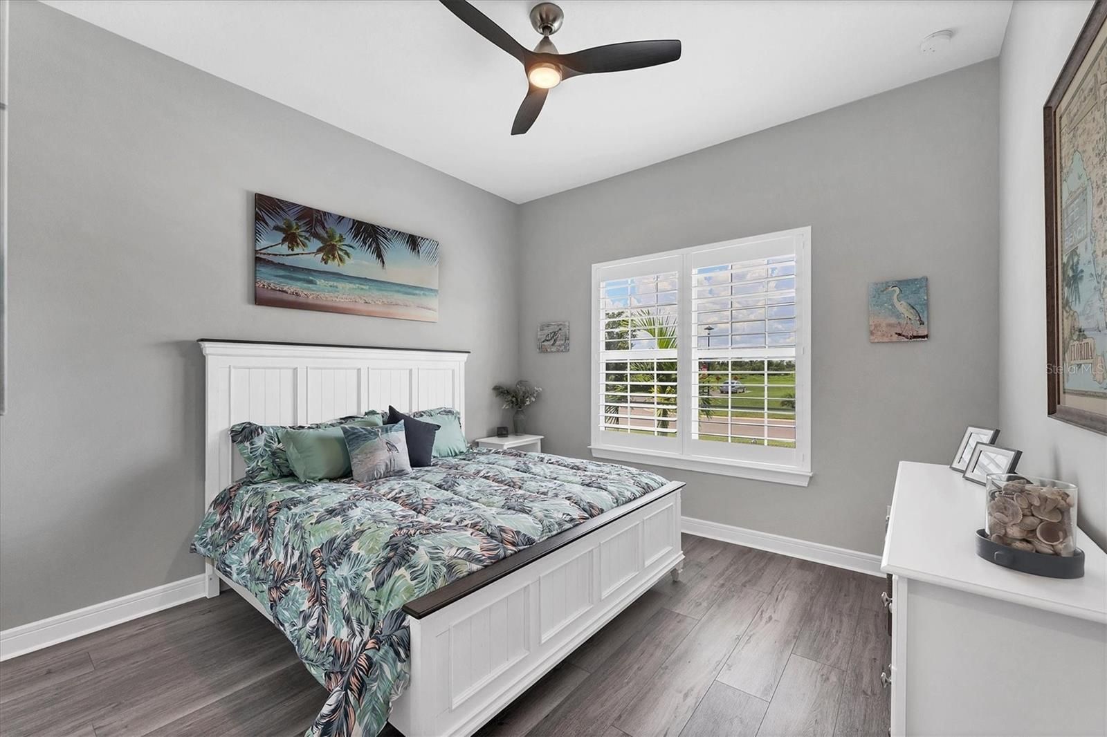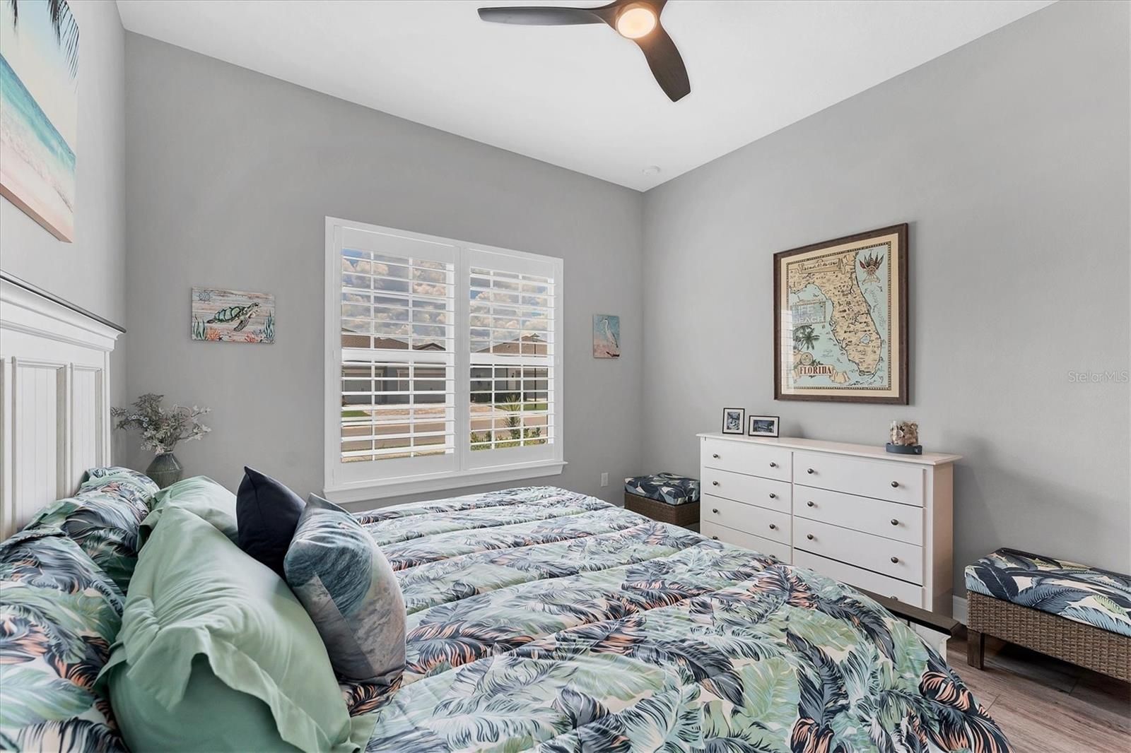 - Ceiling Fan(s), High Ceilings, In-Wall Pest Control, Open Floorplan, Main Level Primary, Solid Surface Counters, Solid-Wood Cabinets, Split Bedrooms, Thermostat, Walk-In Closet(s), Window Treatments