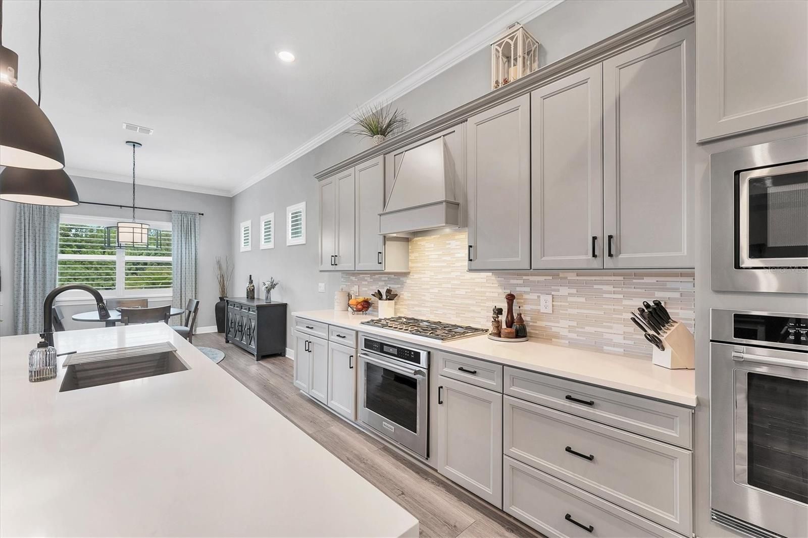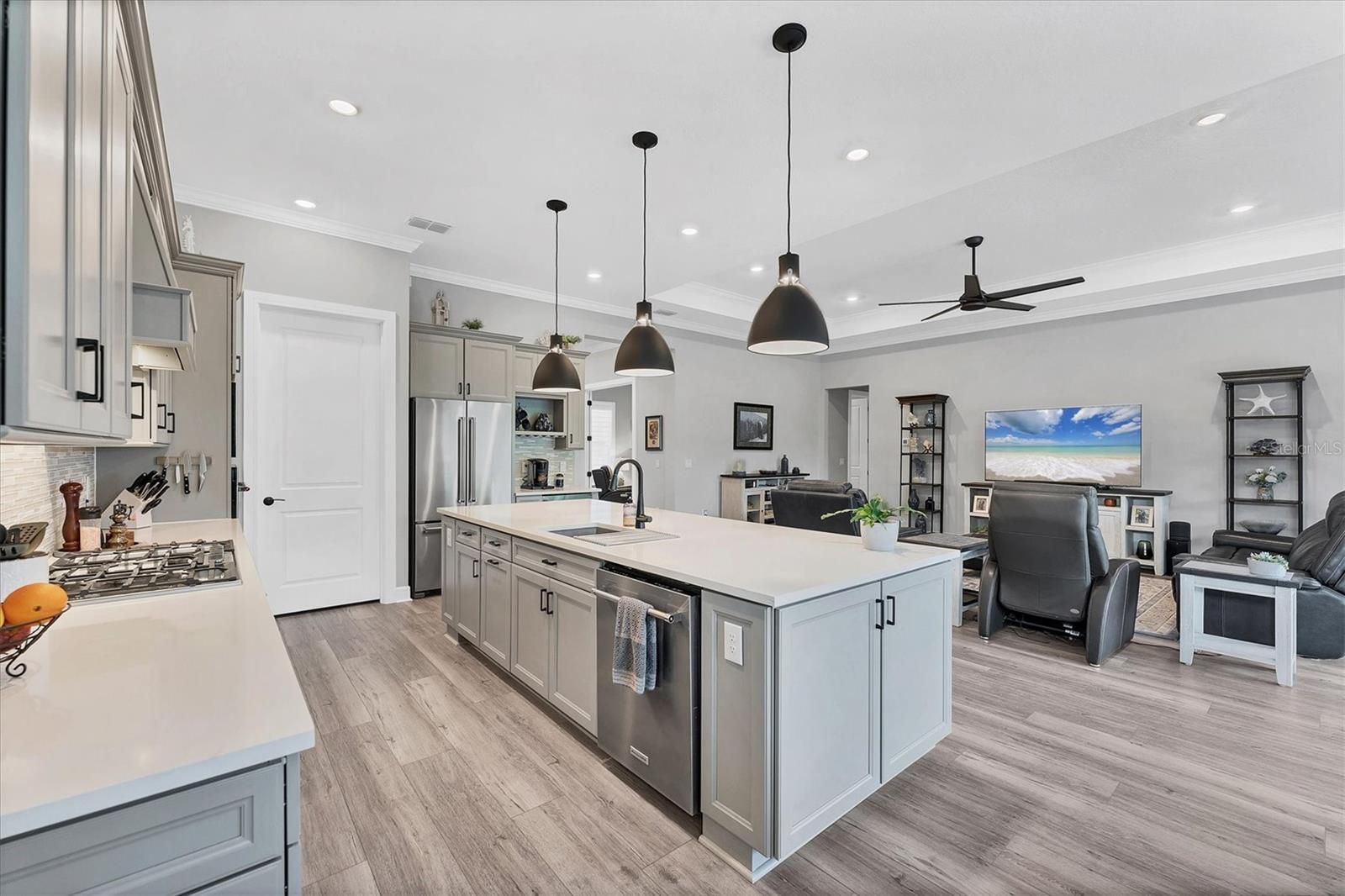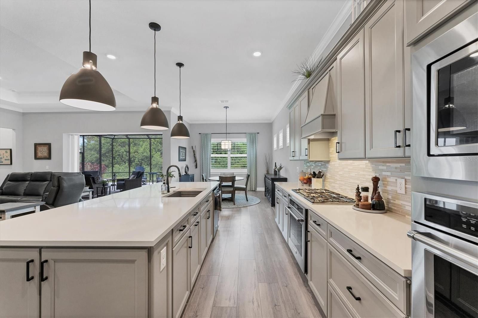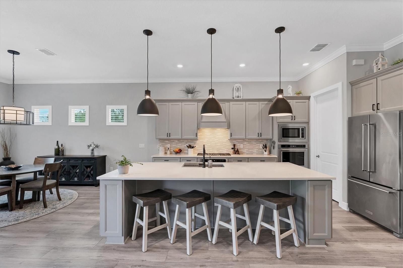 Sellers have moved and want this delightfully finished home sold! This Stellar floorplan delivers it all. The kitchen boasts TWO KitchenAid ovens (PERFECT FOR HOSTING HOLIDAY GATHERINGS), a new Thermador cooktop, and Café series wine and home refrigerators, along with a fully finished walk-in pantry. Sited on a corner lot with conservation views, the sellers have enhanced the landscaping, widened the front walkway, screened the entry, and extended the paver lanai. The lanai is pre-plumbed for an outdoor kitchen and features a remote-controlled hurricane screen. Inside, there is no carpeting—only gorgeous luxury vinyl plank flooring. The home includes three bedrooms, three baths, a spacious den with doors, an inside laundry, and a three-car garage. One guest room offers an ensuite for visitors. The primary bath features custom mirrors, a double sink vanity, and pre-wiring for a bidet in the water closet. Conveniently located near the Driftwood Club amenity center, this home offers easy access to a vibrant 55+ lifestyle. With golf cart-friendly streets, an on-site restaurant, and close proximity to I-75 and 275, you will enjoy the best of Florida living with cultural, music, and beach attractions nearby. Plus, the CDD is included in the taxes. Now vacant, easy to show, and available for a quick close!