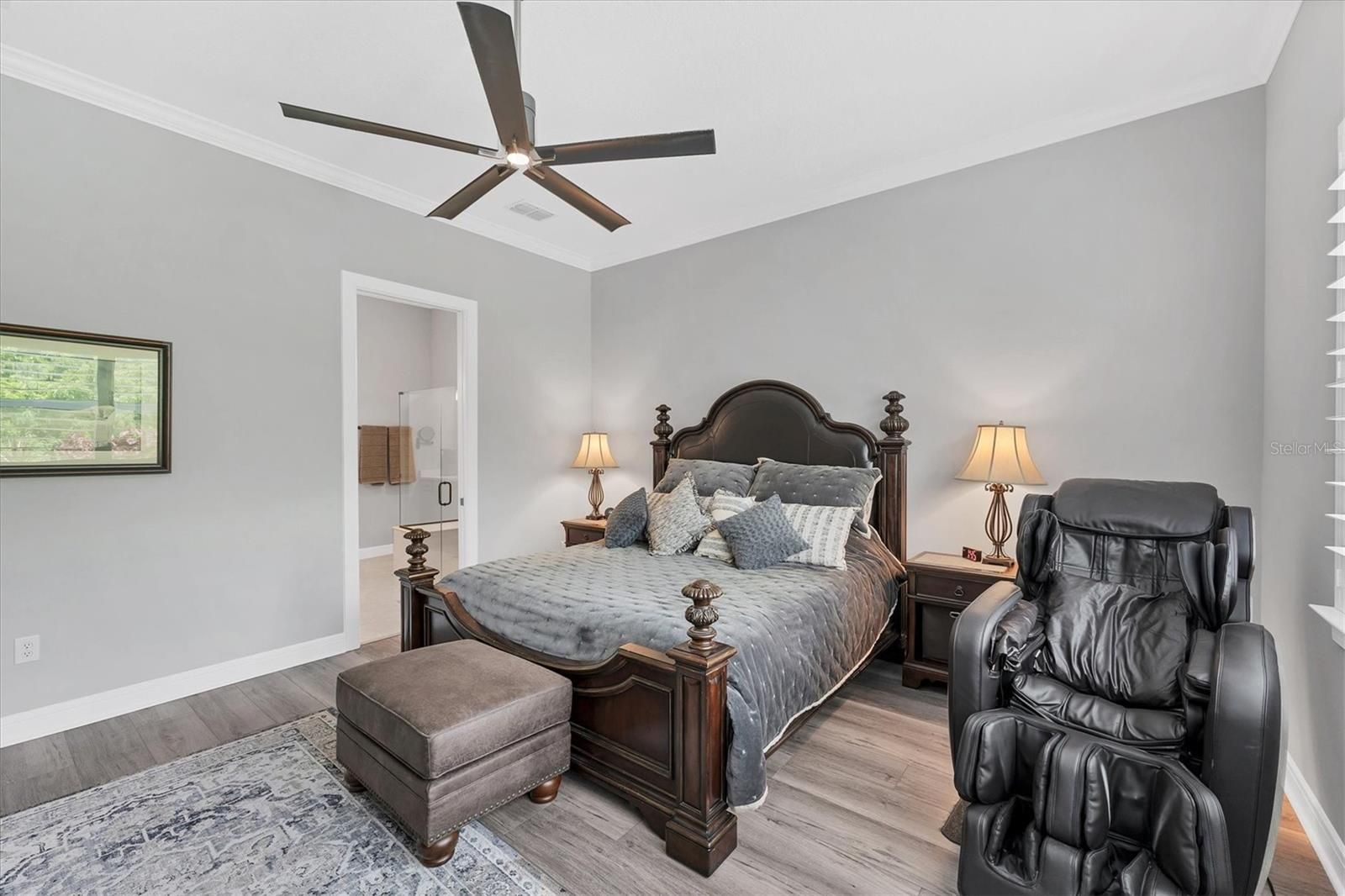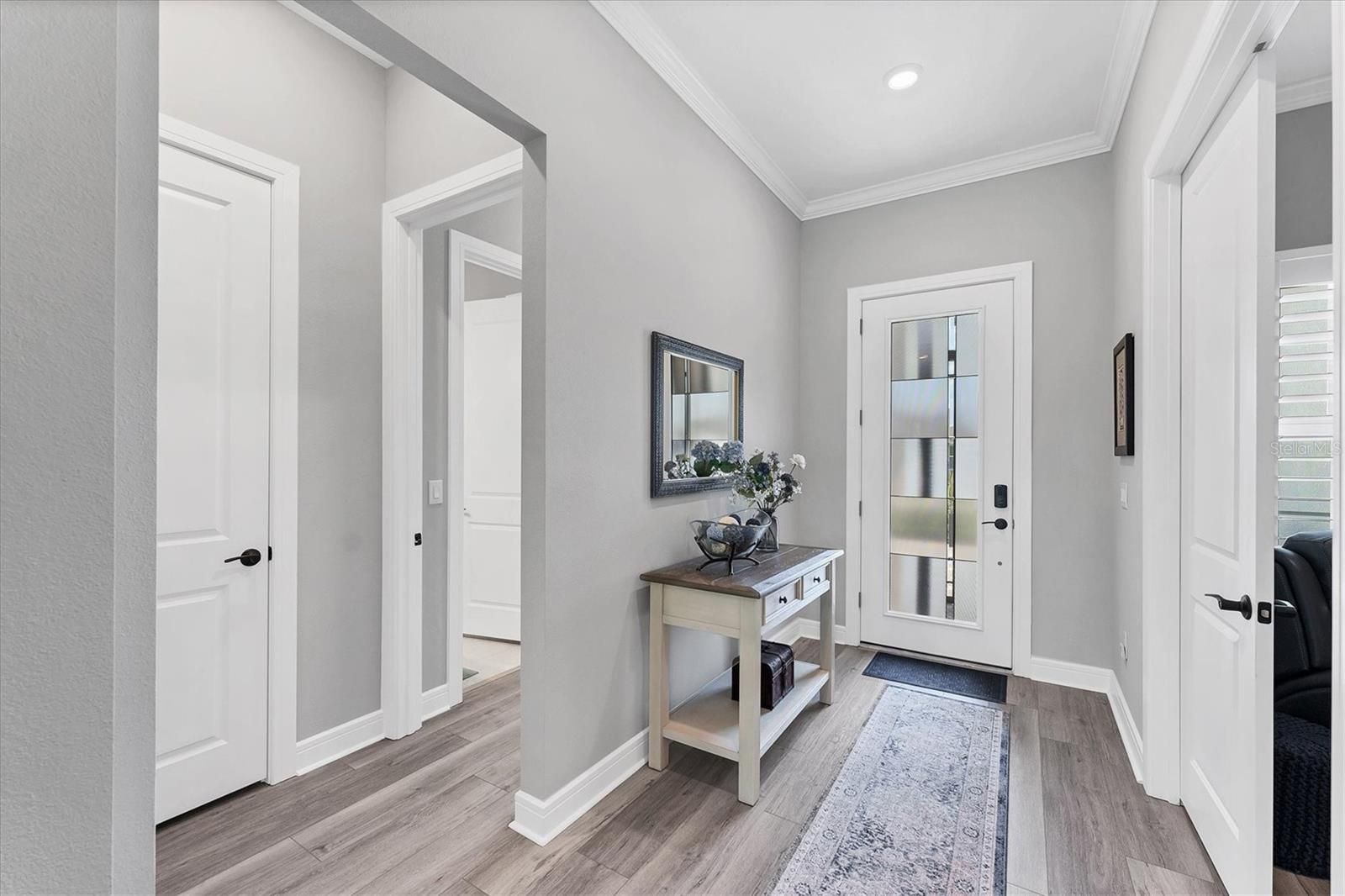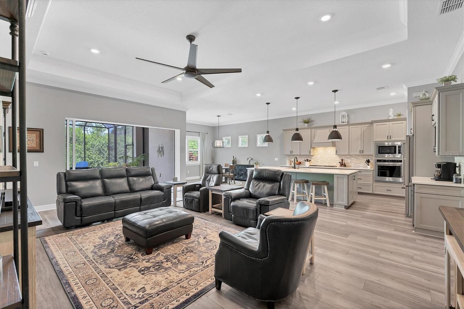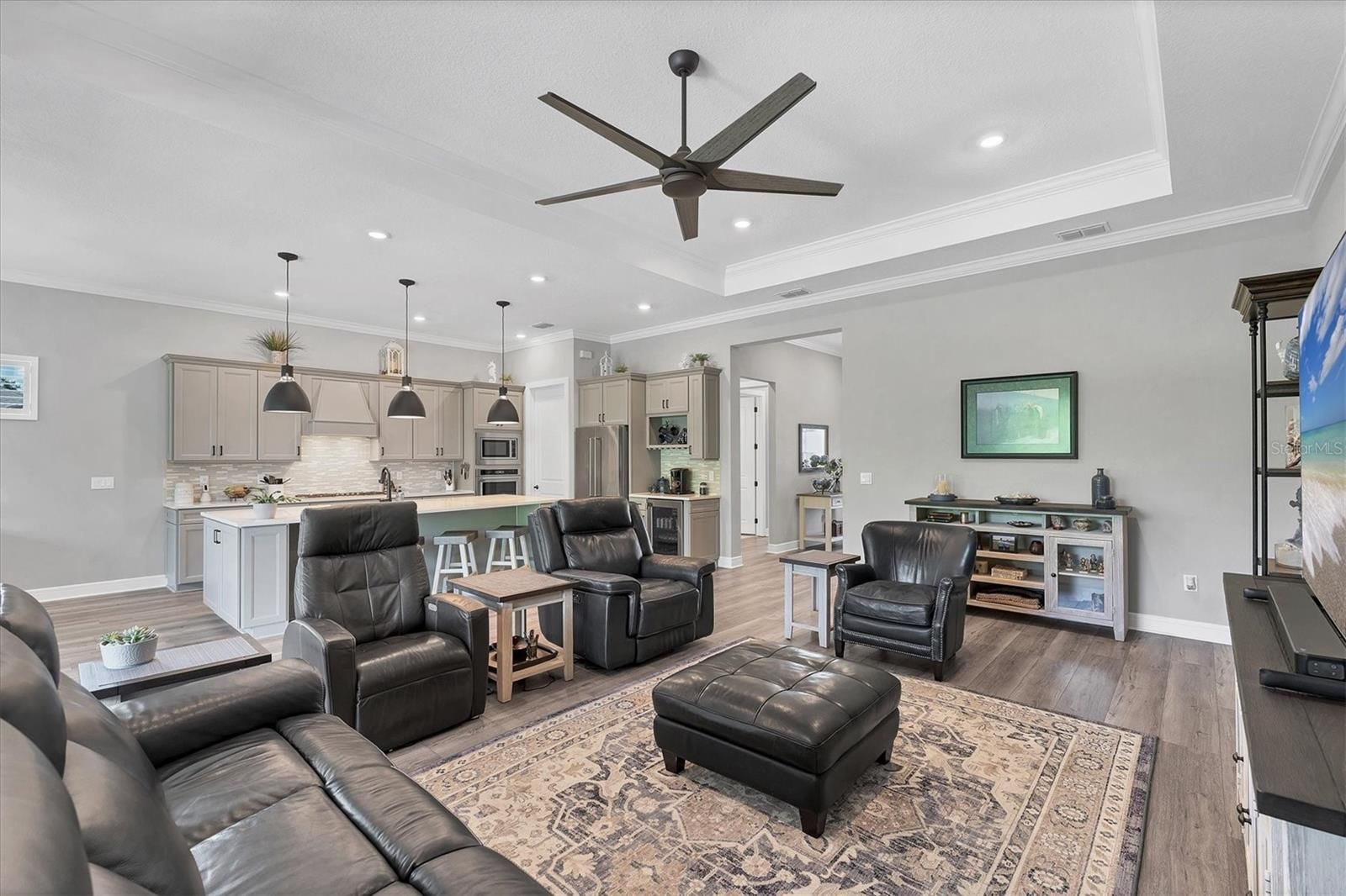 Sellers have moved and want this delightfully finished home sold! This Stellar floorplan delivers it all. The kitchen boasts TWO KitchenAid ovens (PERFECT FOR HOSTING HOLIDAY GATHERINGS), a new Thermador cooktop, and Café series wine and home refrigerators, along with a fully finished walk-in pantry. Sited on a corner lot with conservation views, the sellers have enhanced the landscaping, widened the front walkway, screened the entry, and extended the paver lanai. The lanai is pre-plumbed for an outdoor kitchen and features a remote-controlled hurricane screen. Inside, there is no carpeting—only gorgeous luxury vinyl plank flooring. The home includes three bedrooms, three baths, a spacious den with doors, an inside laundry, and a three-car garage. One guest room offers an ensuite for visitors. The primary bath features custom mirrors, a double sink vanity, and pre-wiring for a bidet in the water closet. Conveniently located near the Driftwood Club amenity center, this home offers easy access to a vibrant 55+ lifestyle. With golf cart-friendly streets, an on-site restaurant, and close proximity to I-75 and 275, you will enjoy the best of Florida living with cultural, music, and beach attractions nearby. Plus, the CDD is included in the taxes. Now vacant, easy to show, and available for a quick close!