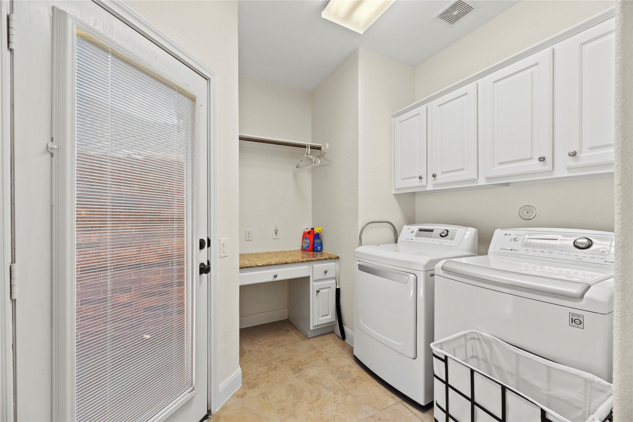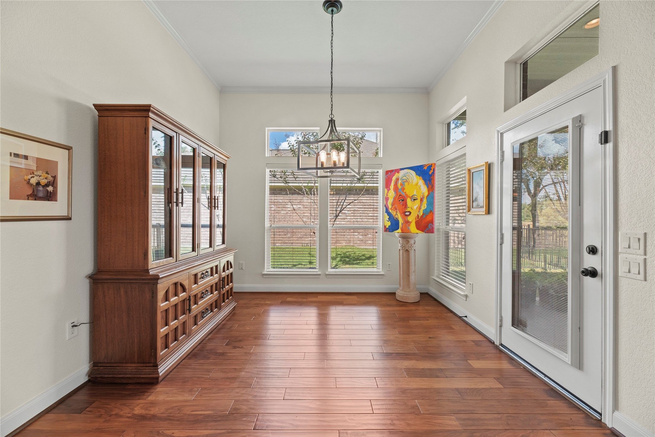 - Breakfast Bar, Crown Molding, Double Vanity, Granite Counters, High Ceilings, Jetted Tub, Kitchen Island, Kitchen/Family Room Combo, Bath in Primary Bedroom, Pantry, Separate Shower, Makeup/Vanity Space, Window Treatments, Ceiling Fan(s), Programmable Thermostat