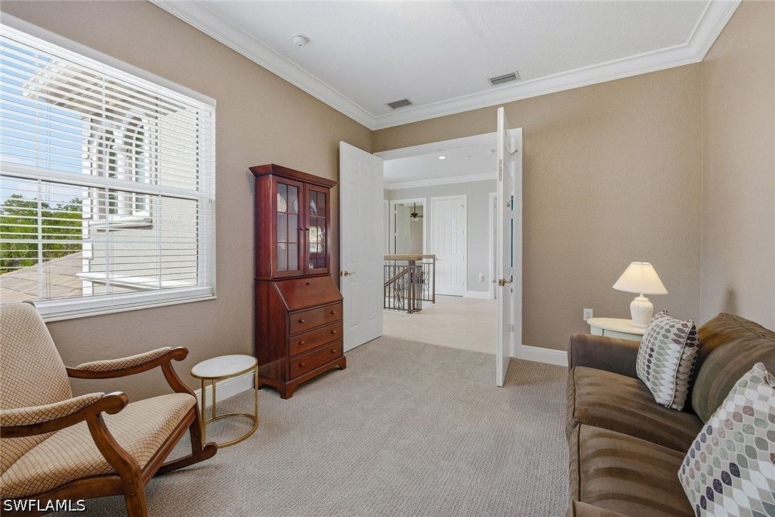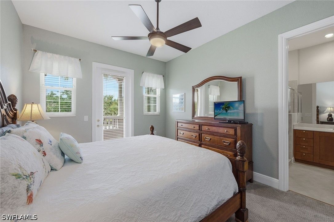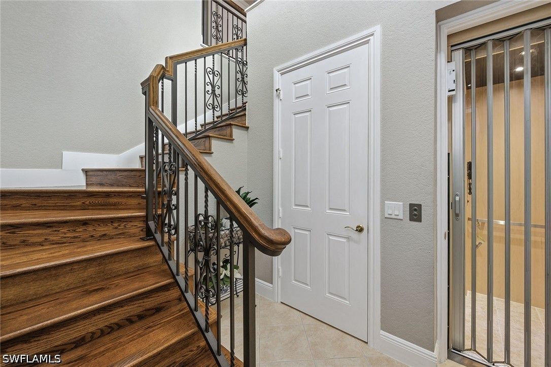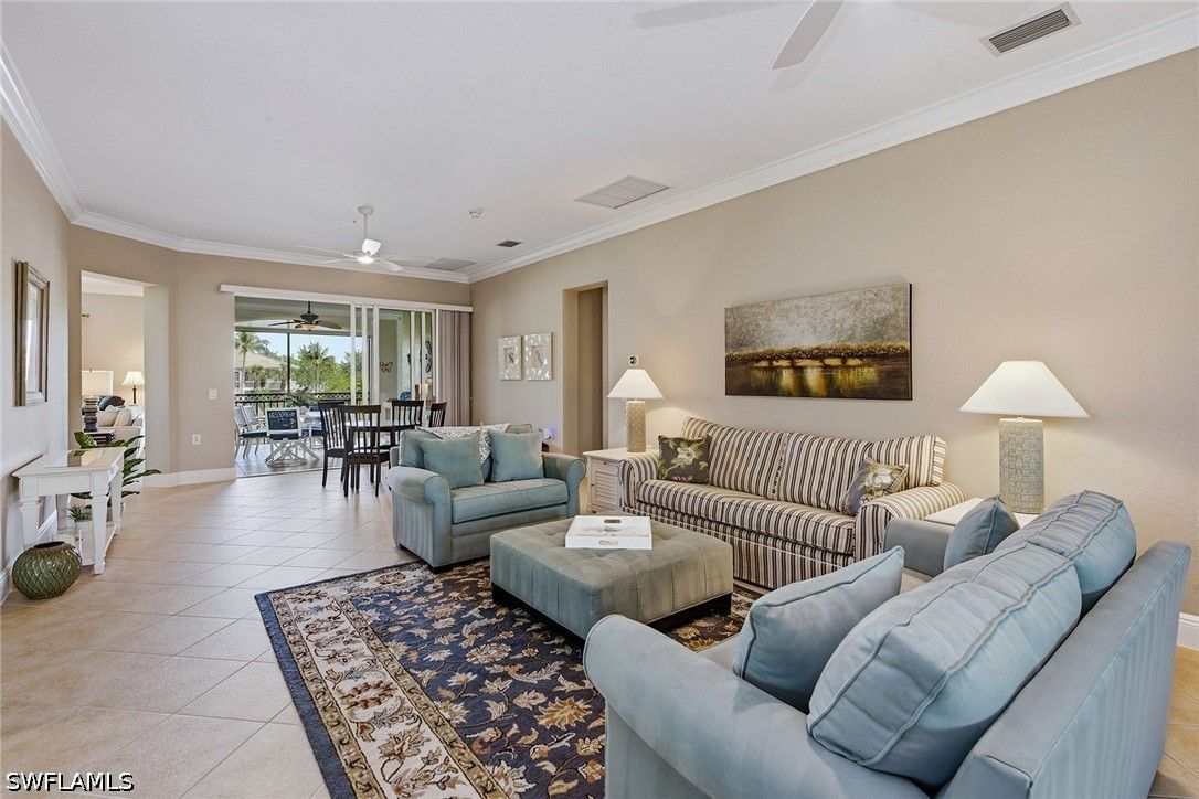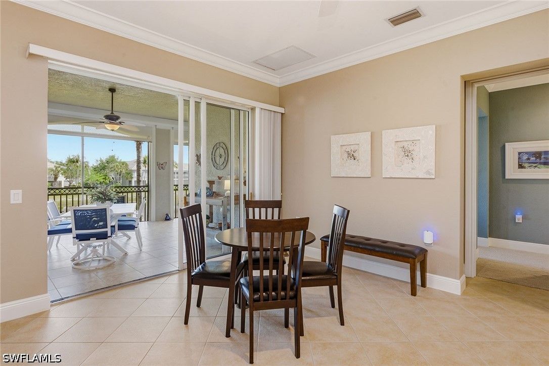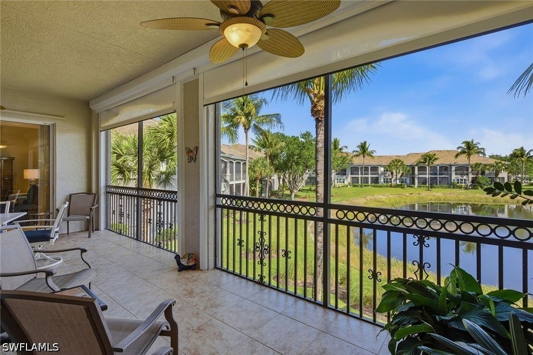 Enjoy tranquil lake views and an abundance of natural light from this beautifully appointed two-story residence in the sought-after Verenna enclave of Fiddler’s Creek. Designed to capture the beauty of its serene setting, this spacious home offers three bedrooms plus a den, three full baths, a private elevator, and a two-car garage, blending comfort, privacy and refined Florida living. An expansive screened and covered balcony creates an ideal outdoor retreat, complete with ceiling fans for year-round enjoyment and peaceful water vistas. Storm protection is thoughtfully integrated with electric and manual shutters, offering added peace of mind. Inside, a harmonious combination of tile flooring in the main living areas and soft carpet in the bedrooms enhances style and comfort. The formal dining room provides an elegant setting for entertaining, while the bright living room features tile flooring, a ceiling fan and glass sliders that open seamlessly to the balcony, filling the space with natural light. A separate family room with tile flooring and a ceiling fan offers additional space for relaxation or gathering. The kitchen is functional and inviting, showcasing recessed lighting, custom cabinetry, a breakfast bar counter and a charming eat-in area. A full appliance package includes a microwave, electric range, dishwasher, and refrigerator with freezer and icemaker, making it ideal for everyday living and hosting. The primary suite is a private haven with sliding doors to the balcony, a ceiling fan and plush carpet flooring. The en-suite bath is thoughtfully designed with a separate soaking tub, enclosed walk-in glass shower, dual sinks with custom mirrors, an enclosed toilet and dual walk-in closets. One guest bedroom offers its retreat with carpet flooring, a closet, private balcony access through glass doors, and an en-suite bath with a glass walk-in shower. The second guest bedroom features a closet, ceiling fan and carpet flooring, with access to a full Jack-and-Jill bath connecting to the dining area, complete with a shower/tub combination. Additional highlights include a well-equipped laundry room with washer and dryer, laundry tub, and extra custom cabinetry for ample storage. Residents enjoy access to exceptional amenities within the 54,000-square-foot club and spa, including poolside and fine dining, a state-of-the-art fitness center with personal training and classes, resort-style pools with waterfalls and slides, full-service spa, sauna, steam room, and active tennis, pickleball and bocce programs, along with a vibrant social calendar. Optional memberships are available for beach and marina access as well as a newly renovated golf course and spectacular clubhouse. Ideally near Marco Island and Naples, this fully furnished residence presents an exceptional opportunity to enjoy a luxurious, move-in-ready lifestyle in one of Southwest Florida’s premier gated communities.