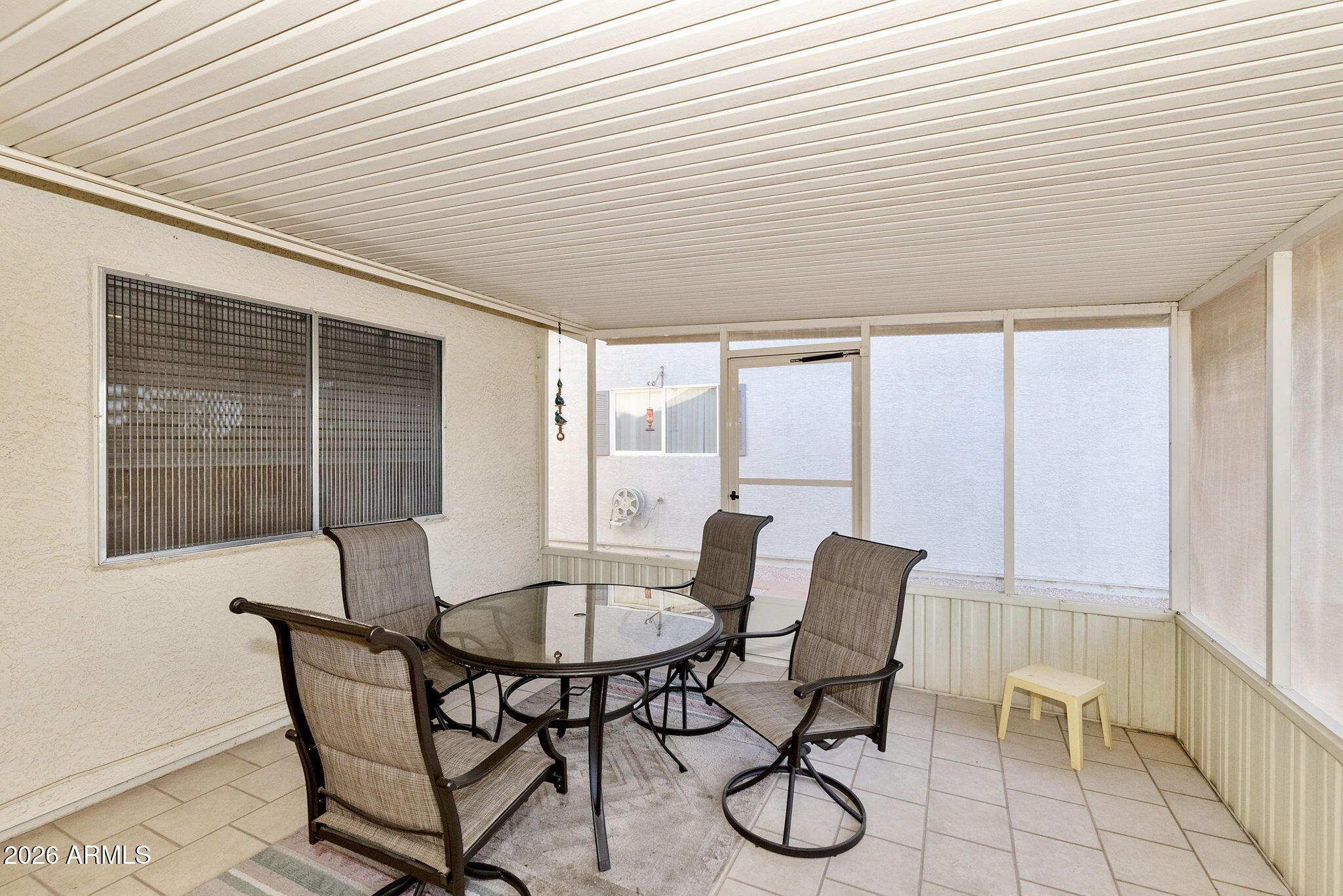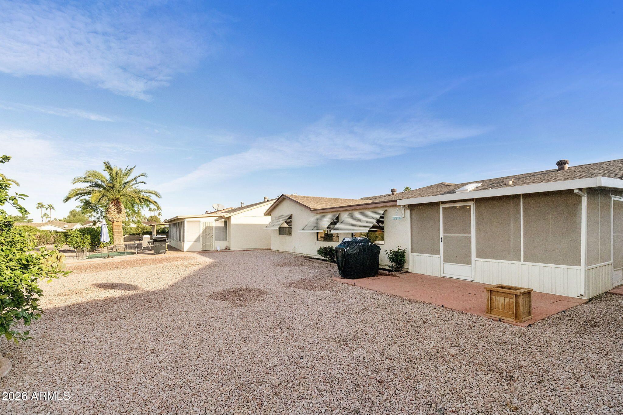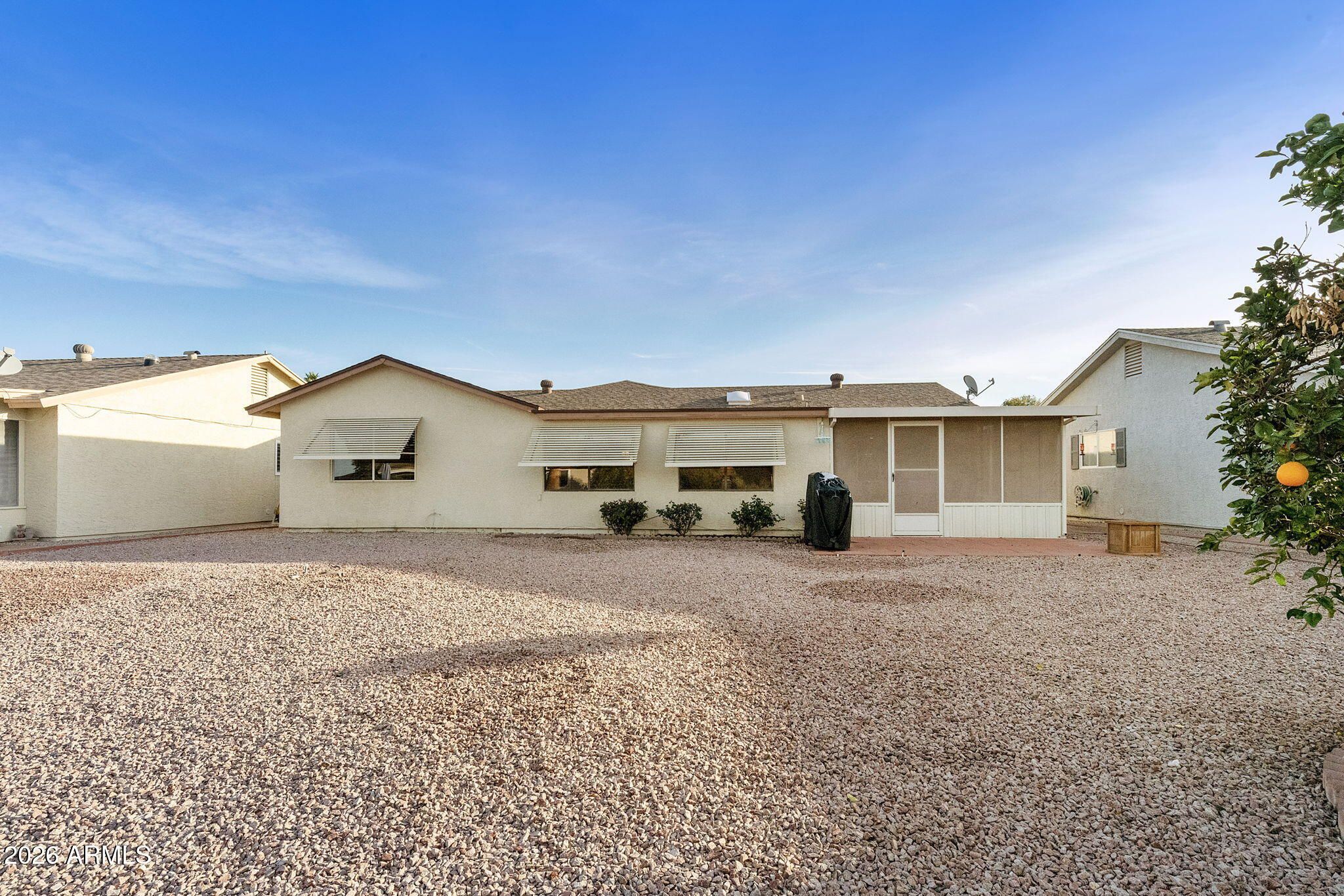 A beautifully maintained single‑level home in the highly desirable, gated 55+ community of Fountain of the Sun, Welcome to this inviting 2‑bed, 2‑bath residence featuring an open, functional layout and thoughtful upgrades throughout. The home offers 1,554 sq ft of living space with a bright, comfortable interior and a floorplan designed for easy living. The upgraded kitchen cabinetry adds warmth and style, while the split‑bedroom layout provides privacy for guests. A standout feature is the large finished AZ room, perfect as a hobby space, office, fitness area, or second living room. Step outside to enjoy Screened in Patio and a low‑maintenance lot. 2‑car garage with Built-In Storage Cabinets, Roof (2018) Heat Pump (2022)