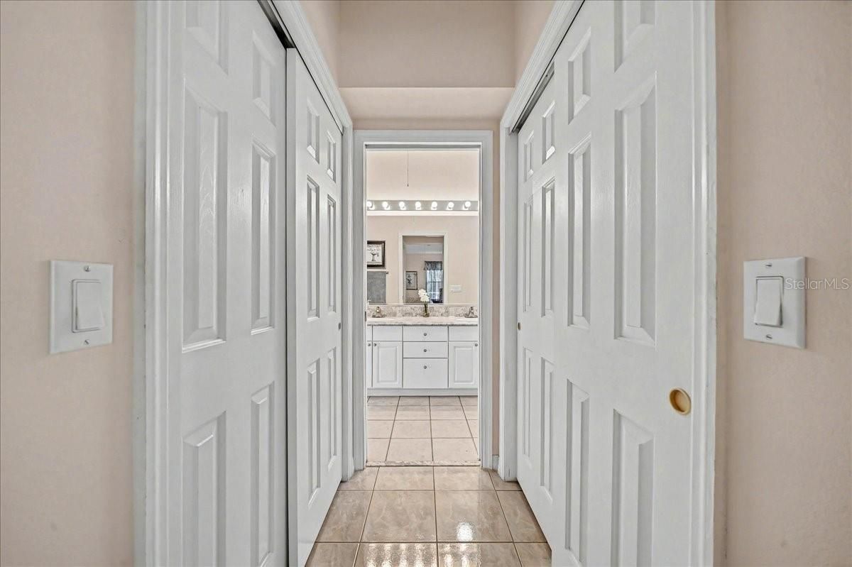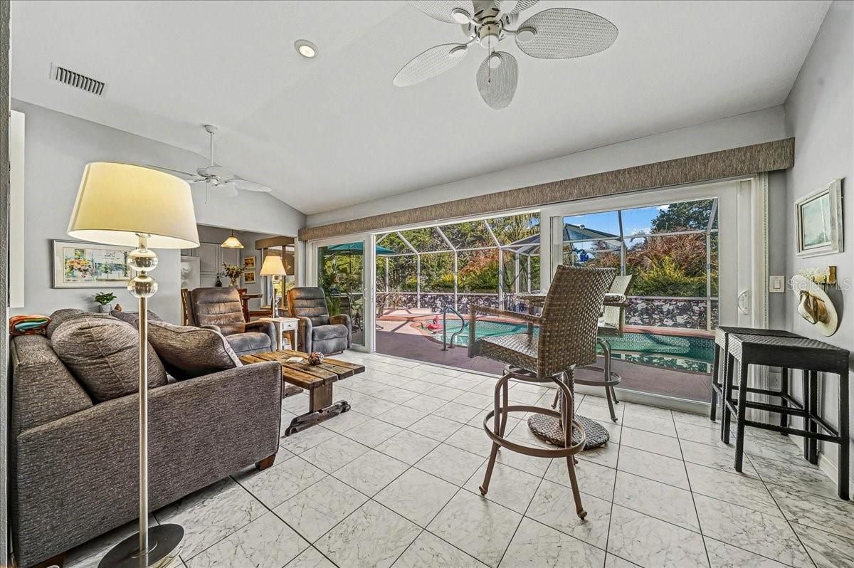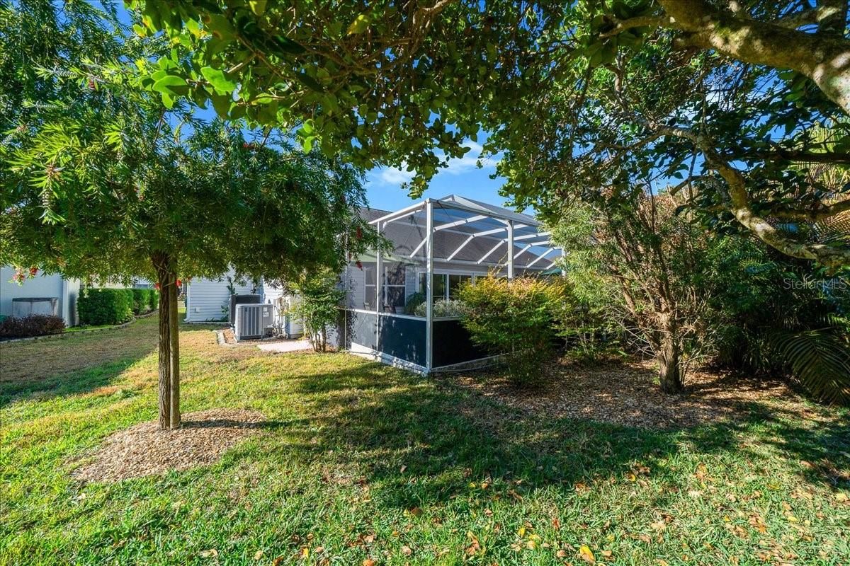 A true tropical oasis awaits in this beautifully customized SAN MARINO model, offered TURNKEY, situated on an OVER-SIZED LOT in The Village of Hacienda — complete with a PRIVATE HEATED SALTWATER POOL & SPA, BONUS DOUBLE GOLF CART GARAGE, and a thoughtfully designed home expansion. From the moment you step inside, you’ll be drawn to the stunning ENCLOSED 45.5' x 28.3' LANAI, 23.10' X 7.7' pool, and separate spa, surrounded by lush tropical landscaping that creates an exceptionally private retreat — perfect for relaxing in the sun or unwinding under the covered outdoor living area. With no neighboring sightlines, this pool area offers rare seclusion — enjoy your own slice of paradise in total comfort and privacy. The private pool is dual heated with SOLAR & ELECTRIC. The interior features a split floor plan, VOLUME CEILINGS, porcelain ITALIAN TILE and soft carpet, and multiple sliding glass doors that flood the home with natural light and provide seamless indoor-outdoor living. The EAT-IN kitchen offers white bay cabinets, a double-door pantry, PULL-OUTS, NEW DISHWAHER (2025) & NEWER MICROWAVE (2023) and generous counter space complete with GRANITE COUNTEROPS & TILE BACKSPLASH, flowing into the bright and open dining and living areas. The spacious primary suite features sliding doors to the lanai, DUAL CLOSETS, VOLUME CEILINGS, and a private ensuite with dual cultured marble vanities and a WALK-IN SHOWER with a BUILT-IN BENCH. A standout upgrade is the LAUNDRY ROOM addition, conveniently located just off the primary bedroom — offering ample cabinetry, a folding counter, and generous space. Guest bedrooms are well-sized each with a built-in closet, with the guest bathroom conveniently located in between featuring a tub/shower combo and solar tube, plus additional hallway storage including a large linen closet and coat closet. The 2-car 19' X 24' garage includes built-in storage cabinets, pull-down attic access, and a remote-controlled screen door, PLUS a NEWLY ADDED GOLF CART GARAGE that can accommodate TWO golf carts! * BOND PAID * GOLF CART INCLUDED * Oversized Lot * Extra Attic Storage Space * ROOF 2018 This home offers the perfect blend of privacy, functionality, and Villages lifestyle living — ideal for full-time residents or a luxury seasonal retreat. Close to the SAVANNAH CENTER, CORDOBA REC CENTER, TIERRA DEL SOL, HACIENDA HILLS GOLF & COUNTRY CLUB, DE LA VIST EXECUTIVE COURSE, and SPANISH SPRINGS TOWN SQUARE. Offered TURNKEY, just bring your suitcase and come home today!