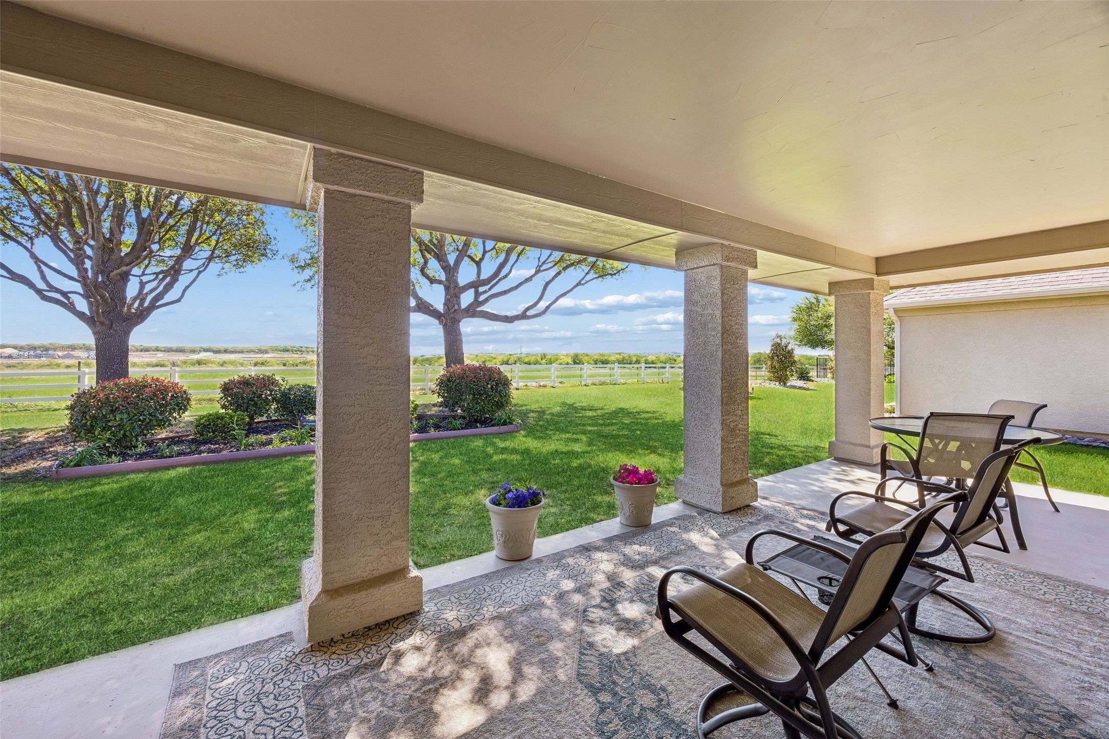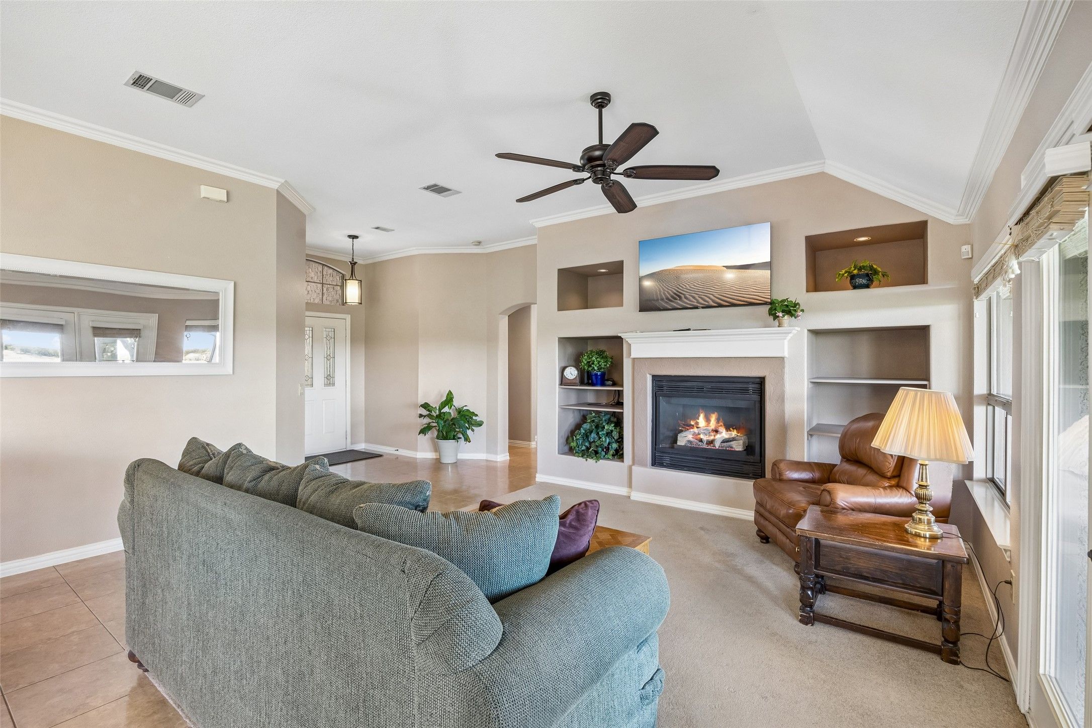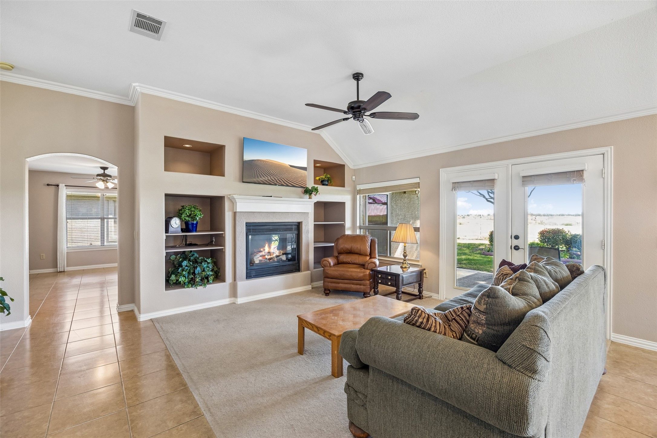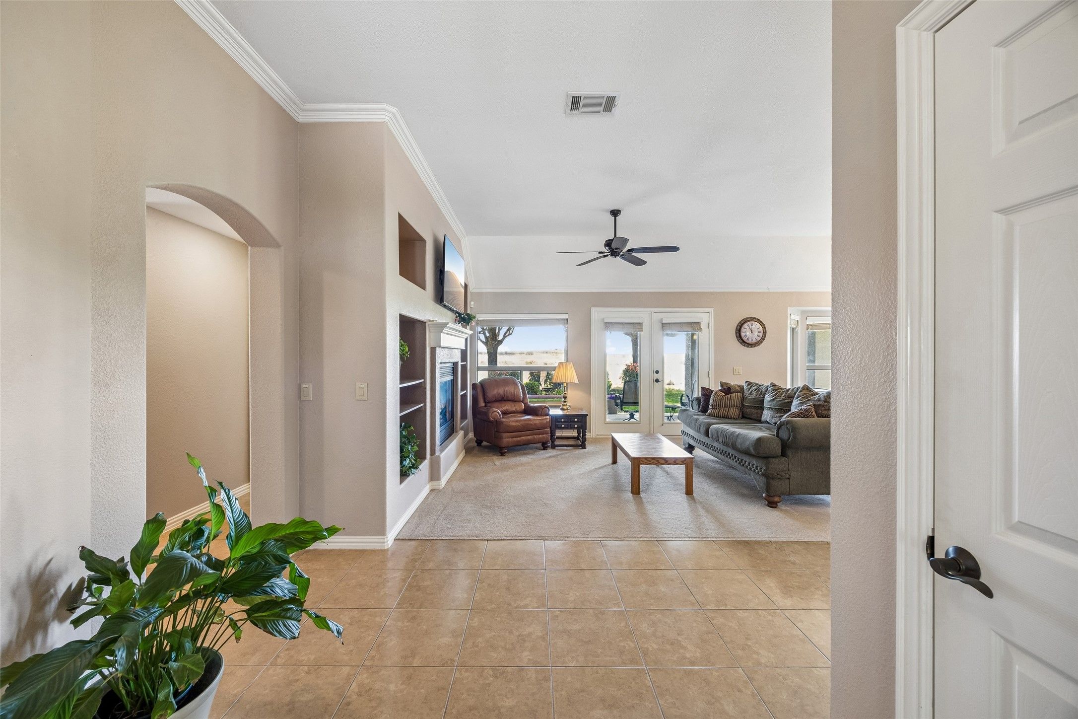 Welcome to this beautifully maintained Augusta floor plan in the sought-after Robson Ranch community, designed for adults 55 and over. Ideally positioned within the neighborhood, this home offers a desirable setting backing to open green space with no rear neighbors, creating a peaceful and private outdoor experience. Inside, you’ll find a light-filled layout enhanced by decorative lighting and crown molding, adding warmth and character throughout. The welcoming living room features a striking fireplace, built-in shelves, and large windows that frame peaceful pasture views, creating an inviting space for both relaxing and entertaining. The modern kitchen is thoughtfully designed with granite countertops, an island with seating, built-in appliances, and ample prep and storage space. A charming breakfast nook with a bay window provides the perfect spot to enjoy morning coffee while taking in the natural surroundings. The primary bedroom offers a serene retreat, complete with an ensuite bath featuring dual sinks, a large shower, and a spacious walk-in closet. Additional bedroom and full bath that is perfect for guests. Bonus room that can be used as a office or cozy den. Enjoy the outdoors from the covered back patio overlooking open green space, offering a quiet setting with no rear neighbors. This home combines comfort, convenience, and a prime location within a welcoming 55+ community. 3D tour available online!