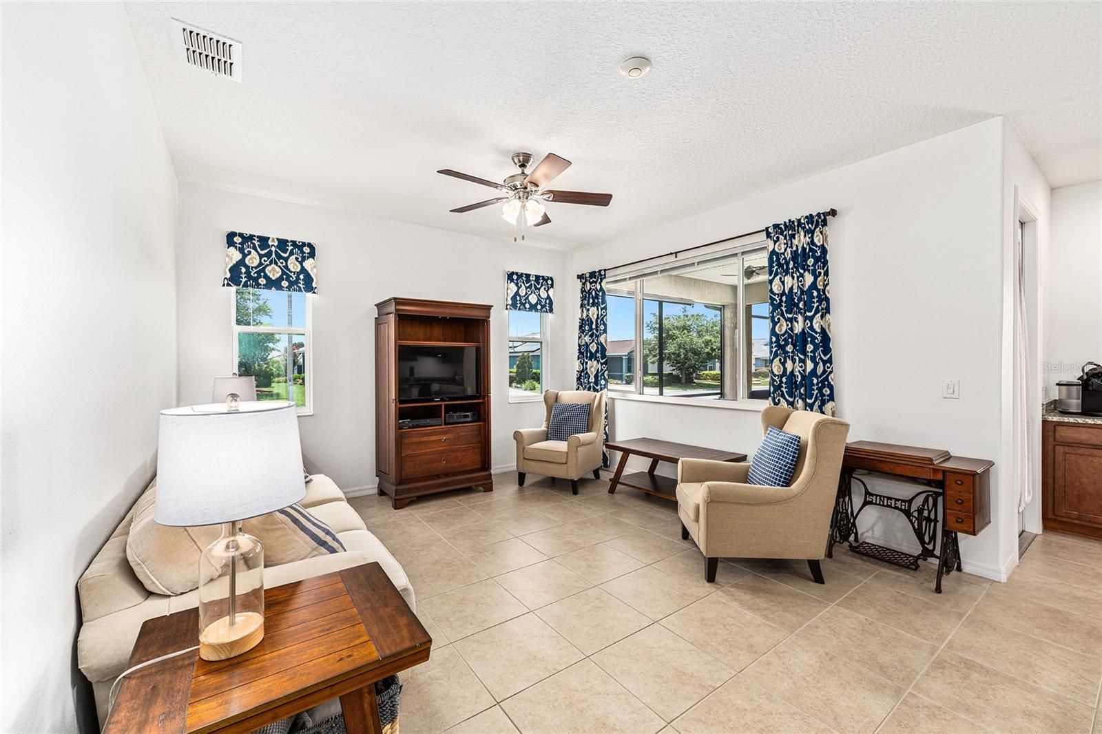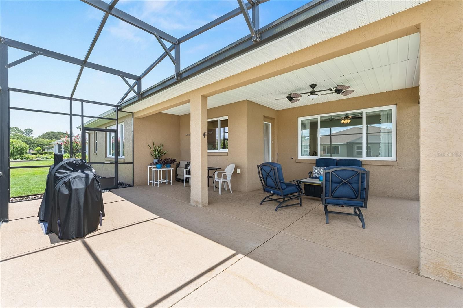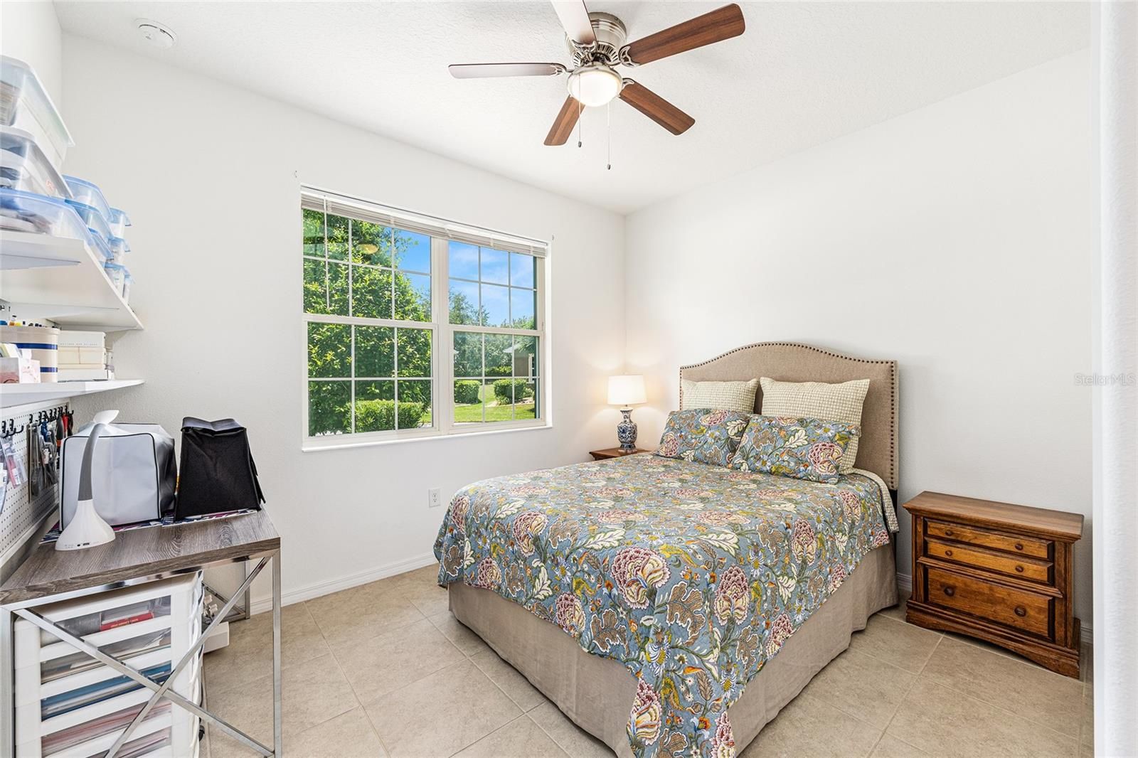 Welcome to this immaculate Yvette Floorplan located in Providence at On Top of the World where the beautiful Tortoise & The Hare Golf Course is located. Beautifully landscaped with mature trees gives this home great curb appeal. This Yvette is located on a corner lot near the Arbors recreation center. This meticulously maintained split 2 bedroom, 2 bathroom, with a flex room and 2 car garage home boasts a wealth of features designed for both elegance and functionality. This open concept home features a gourmet kitchen, tile floors throughout and rounded corners add elegant architectural style. The kitchen has a huge picture window overlooking the peaceful extended lanai, featuring quartz counters, center island, and beautiful staggered cabinets with crown molding. Solid wood cabinets, a large pantry, tons of countertop space and cabinets for maximum storage. The main bedroom has an oversized closet and an en suite with separate vanity sinks and a large walk-in shower. This home features a peaceful lanai which has been extended by 10' to allow lots of space for entertaining and is the perfect spot for relaxing year-round. This home is so thoughtfully planned that even the laundry room and garage are designed with space for extra storage. The garage features an extra large utility sink. On Top of the World is Ocala's premier active adult community featuring golf cart access to 3 shopping centers.
