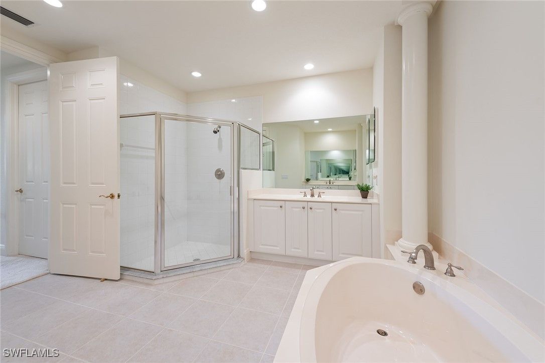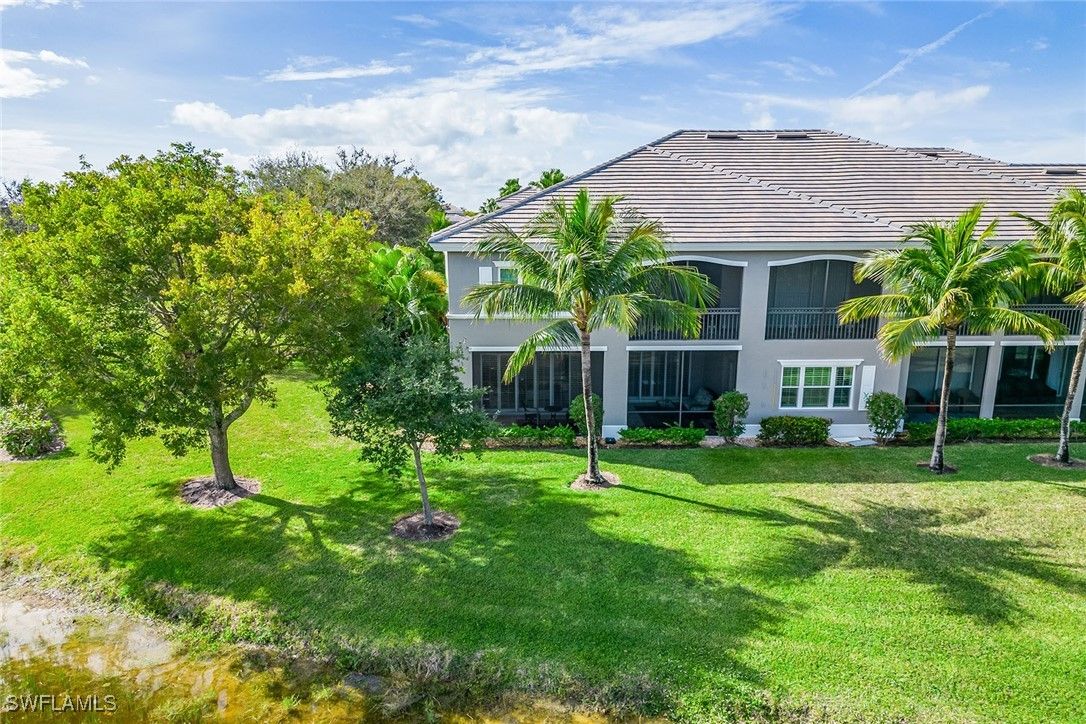 Enjoy serene lake views and a bright, inviting interior in this beautifully maintained three-bedroom, three-full bath end-unit coach home with a private two-car garage. Designed with a thoughtful split-bedroom floor plan, this residence is on the first floor on a quiet cul-de-sac, lives like a single-family home, and is filled with natural light throughout. The exceptional location is peaceful and offers privacy with no building directly next door. Eastern exposure fills the covered, screened lanai with soft morning sun, an ideal spot to enjoy your coffee while overlooking the tranquil lake and lush tropical landscaping. Impact windows and shutters provide storm protection. Recent exterior upgrades include a newer tile roof and fresh exterior paint, offering peace of mind and enhanced curb appeal. Inside, white plantation shutters in every room add charm and functionality, southern windows provide exceptional light throughout the day, and the layout offers the balance of privacy and flow. The kitchen features white cabinetry, recessed lighting, and a window over the sink that frames a garden view. A full suite of white appliances, including a gas range with five burners, microwave, dishwasher, and refrigerator with icemaker, completes this bright and efficient space. Adjacent to the kitchen, the breakfast area is wrapped in three large bay windows showcasing tropical palm trees. The nearby living room opens directly to the lanai, blending indoor and outdoor living, while the formal dining space and great room provide an elegant setting for entertaining. The owner’s suite is a peaceful retreat with gorgeous lake views, lanai access, and a luxurious en-suite bath offering a dual-sink vanity with full-width mirrors, a glass-enclosed walk-in shower, separate soaking tub, and spacious walk-in closets. Two additional guest suites are privately in their wing, each with its en-suite bath and walk-in shower, ideal for hosting family or visitors in comfort. A full laundry room includes a GE top-load washer, front-load dryer, and a utility sink for added convenience. A newer HVAC system installed in 2022 ensures year-round comfort. Residents enjoy access to world-class amenities at the 54,000-plus-square-foot club and spa, featuring poolside and fine dining, a state-of-the-art fitness center with personal training and classes, resort-style pools with waterfalls and slides, spa services, sauna, steam room, active tennis and pickleball, bocce and a year-round calendar of social events. Optional memberships are available at The Tarpon Club for beach and marina access, as well as The Golf Club with its newly renovated course and new spectacular clubhouse. Ideally near Marco Island, downtown Naples, the executive airport, and Gulf’s best beaches, dining and shopping, this fully furnished home offers a move-in-ready resort lifestyle in one of the area’s premier gated communities.
