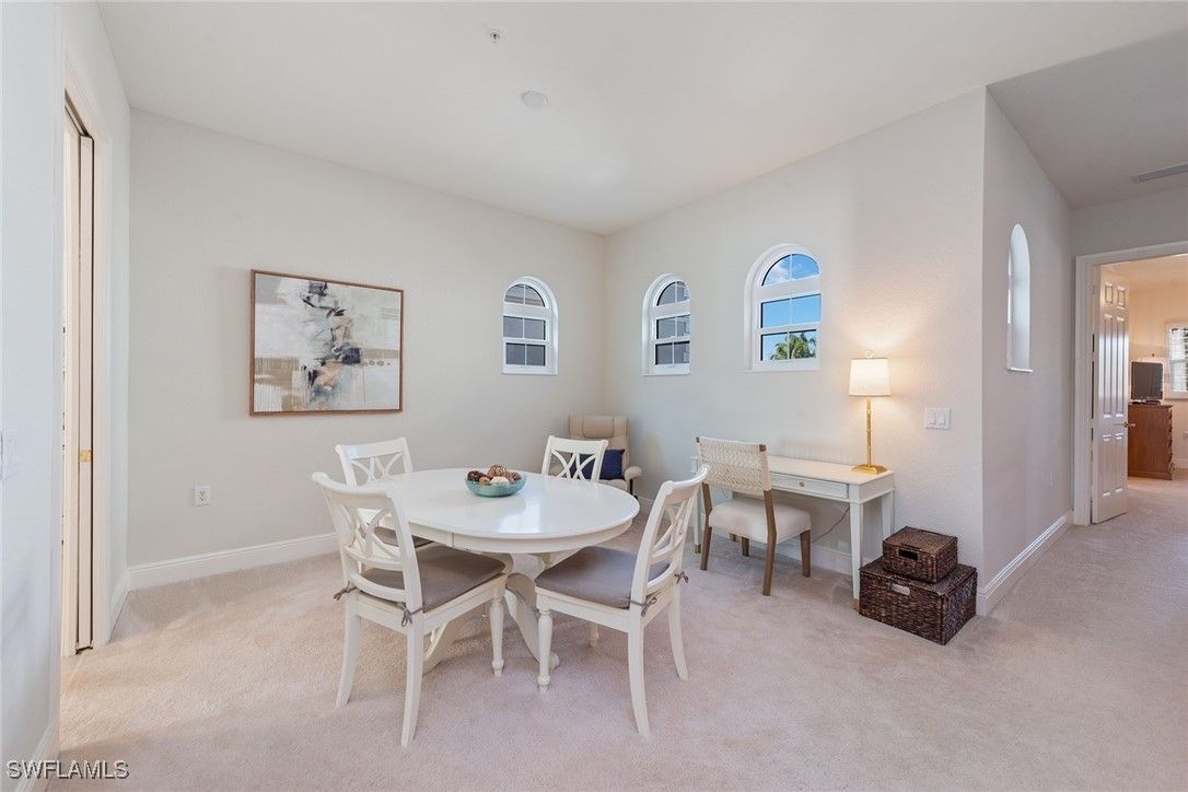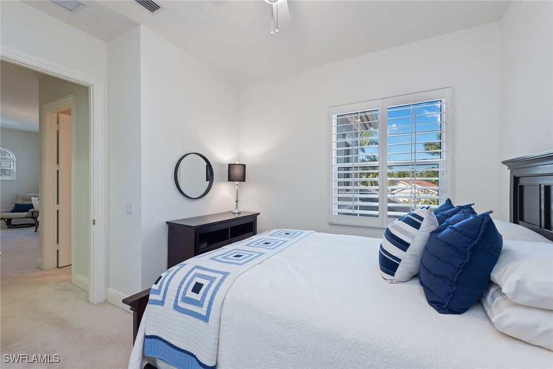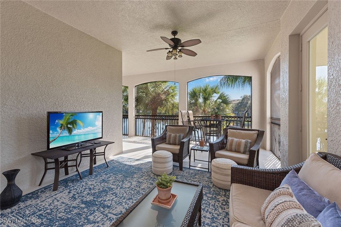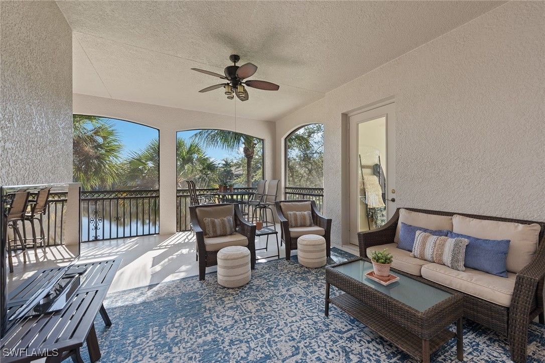 Enjoy tranquil lake views and beautiful morning sunlight from this elegant second-floor residence in the desirable Varenna village of Fiddler’s Creek. With desired eastern exposure, you’ll appreciate peaceful sunrises and comfortably shaded afternoons on the spacious screened lanai, complete with two ceiling fans for year-round enjoyment. A bonus is an additional balcony on the west side of this coach home, where you can enjoy stunning sunsets. This meticulously maintained home offers a private gated courtyard entrance, a paver driveway, and a two-car garage with direct access. Impact glass windows were installed in 2023, a new tile roof was added in 2022, and the exterior has been recently painted, offering peace of mind and lasting value Inside, the spacious split-bedroom floor plan lives like a private home and features three bedrooms, three full baths and 10-foot ceilings throughout. A wood-and-wrought-iron staircase welcomes you into the freshly painted main living area, filled with natural light and timeless finishes. The interior showcases recessed lighting, plantation shutters, and a thoughtfully designed layout that balances comfort and privacy throughout. Additional features include a newer tankless gas water heater and a designated space for a future elevator. The kitchen is stylish and functional, showcasing white cabinetry with abundant storage, a breakfast bar, recessed LED lighting, pantry, natural gas range, dishwasher, above-range microwave and side-by-side refrigerator. A bright breakfast area and formal dining room each provide inviting spaces for casual and elegant dining alike. The family room features direct access to the lanai through a glass door, while the living room offers sliding glass doors that open to the screened outdoor space, where serene lake views create a picturesque backdrop. The owner’s suite is a private retreat with lake views, direct lanai access, ceiling fan and two walk-in closets with wood slatted shelving. The spa-inspired bath features dual white vanities with full-width mirrors, LED lighting, a soaking tub and a walk-in shower with glass enclosure. One guest suite offers a private balcony, full en-suite bath with walk-in shower, and a white vanity, while the second guest bedroom includes two closets, one a walk-in, and access to a nearby full bath with a walk-in shower and white vanity. The laundry room is equipped with a new GE front-load gas dryer and top load washing machine. Ideally close to the village pool, this residence offers an exceptional lifestyle within Fiddler’s Creek. Residents enjoy on-site fine and casual dining, resort-style pools, fitness, spa services, tennis, pickleball, bocce and an active social calendar. Optional memberships are available for the newly renovated golf course, new golf clubhouse, private beach club and marina. Enjoy gorgeous landscaping and a fantastic location convenient to Old Naples and Marco Island.