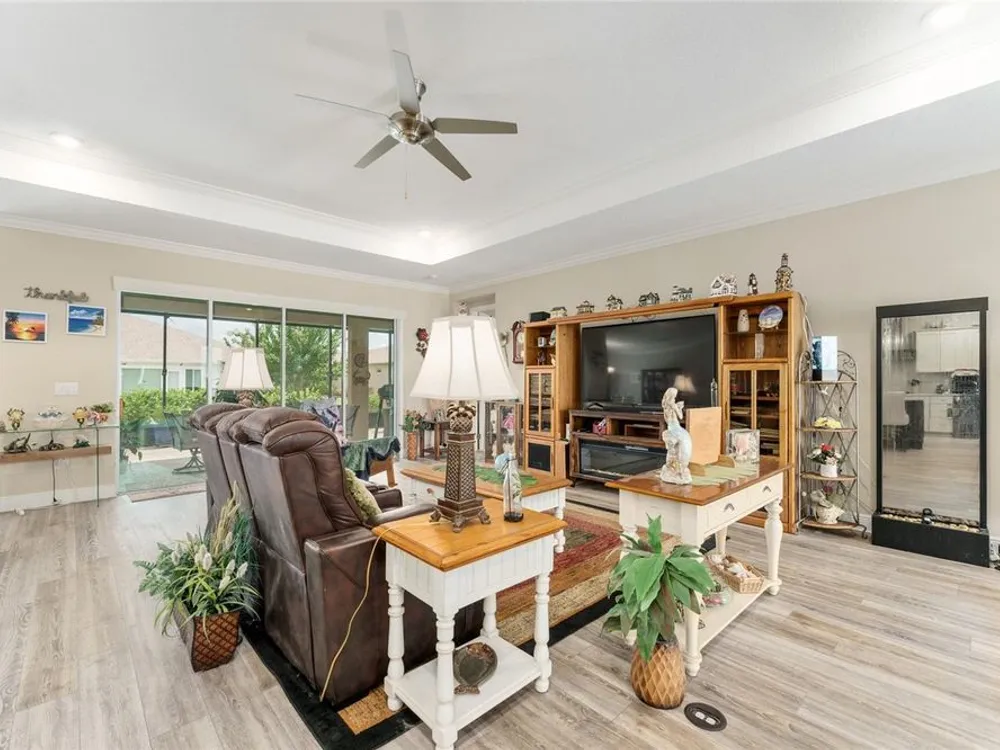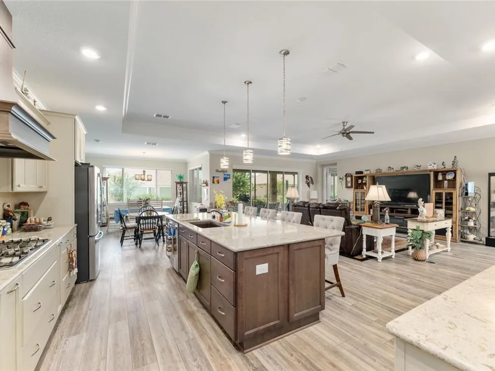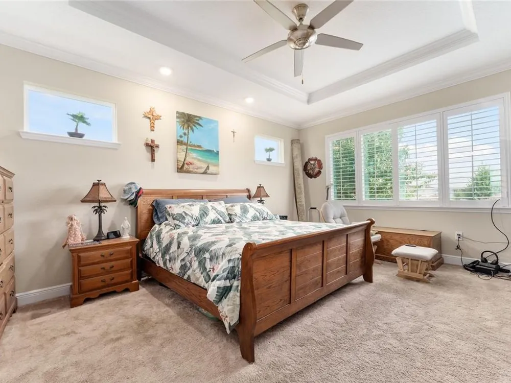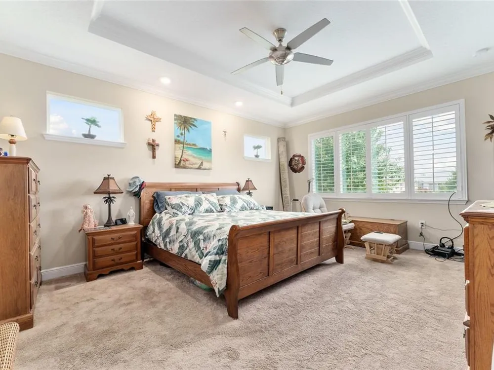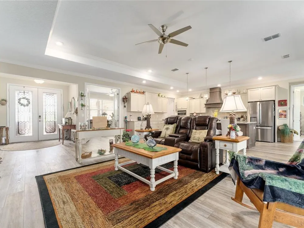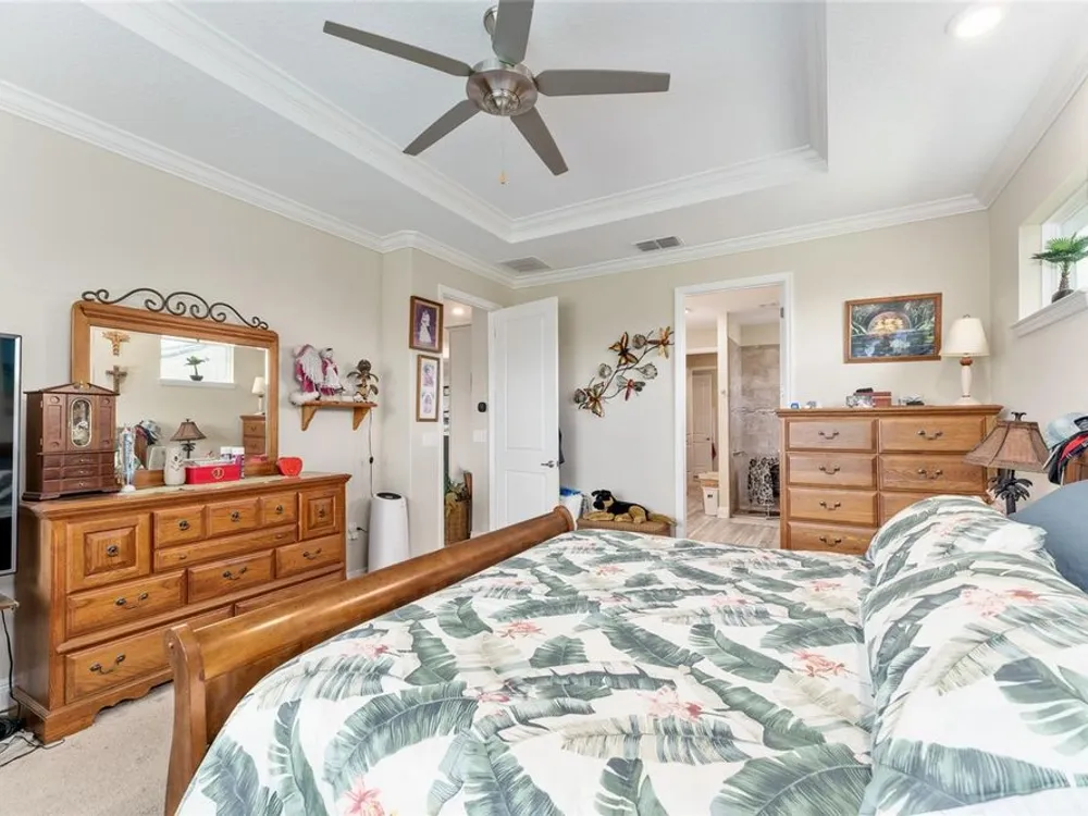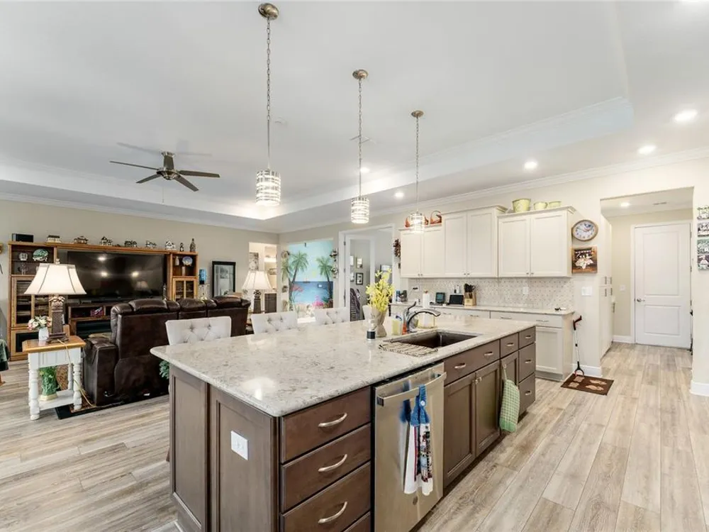 - Ceiling Fan(s), Crown Molding, Kitchen/Family Room Combo, Open Floorplan, Main Level Primary, Split Bedrooms, Stone Counters, Tray Ceiling(s), Walk-In Closet(s)