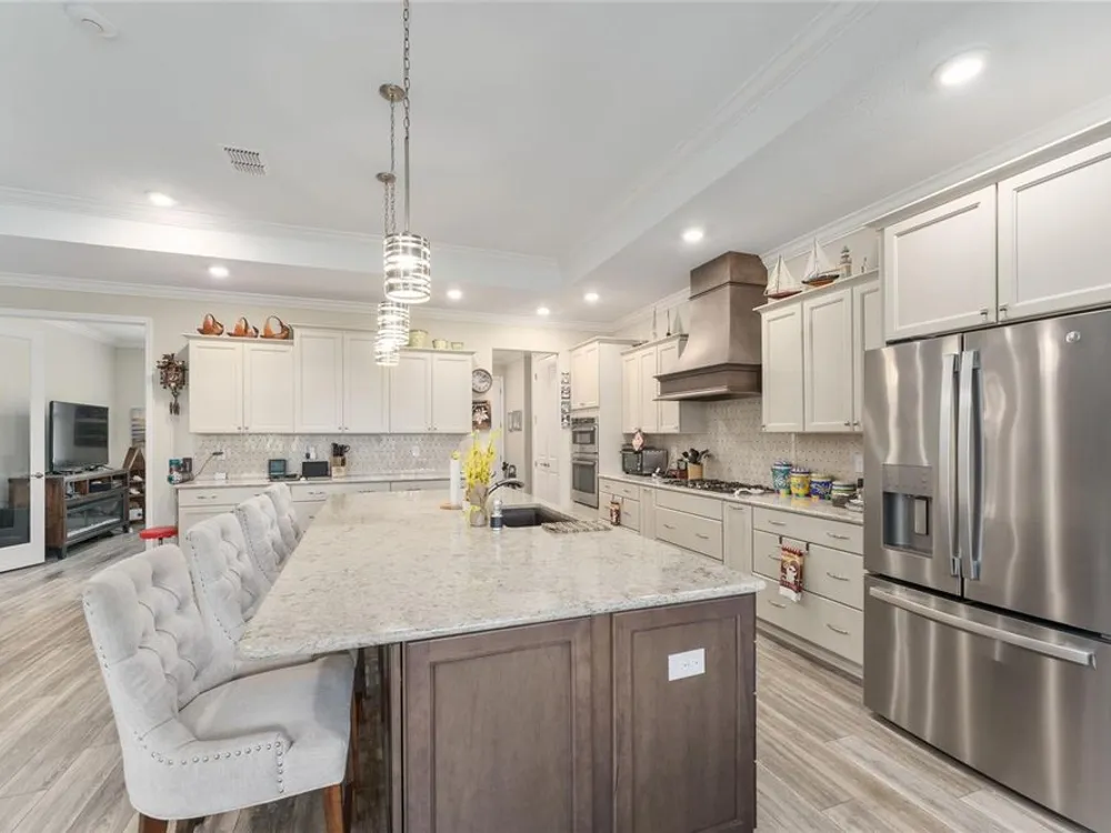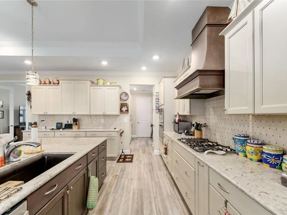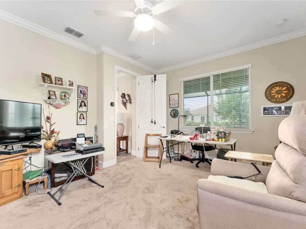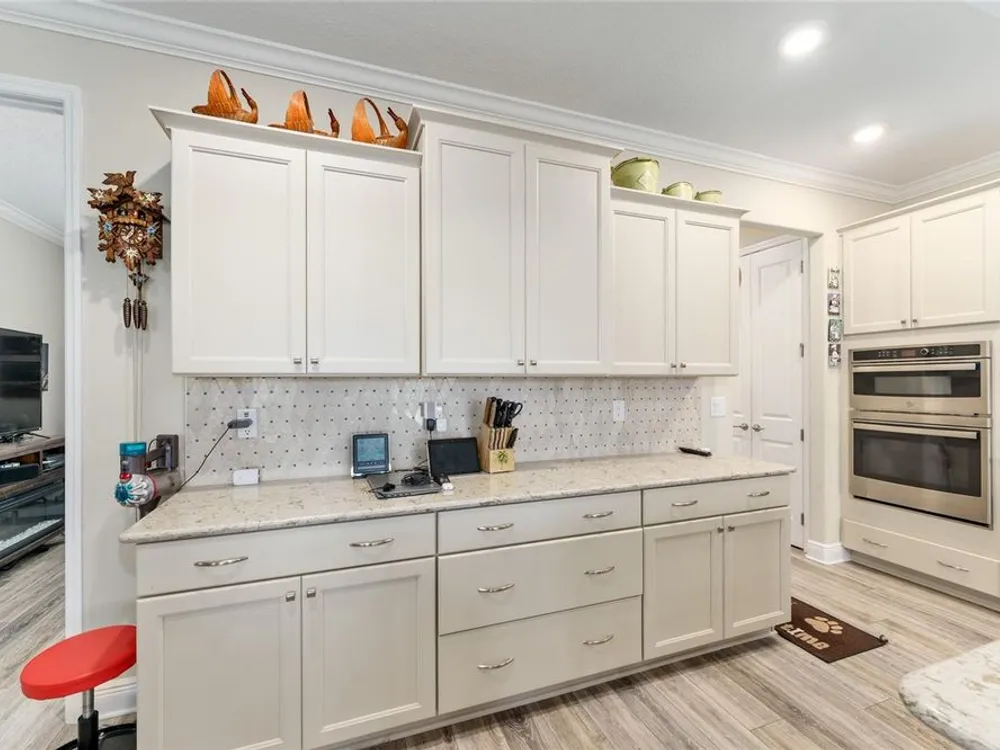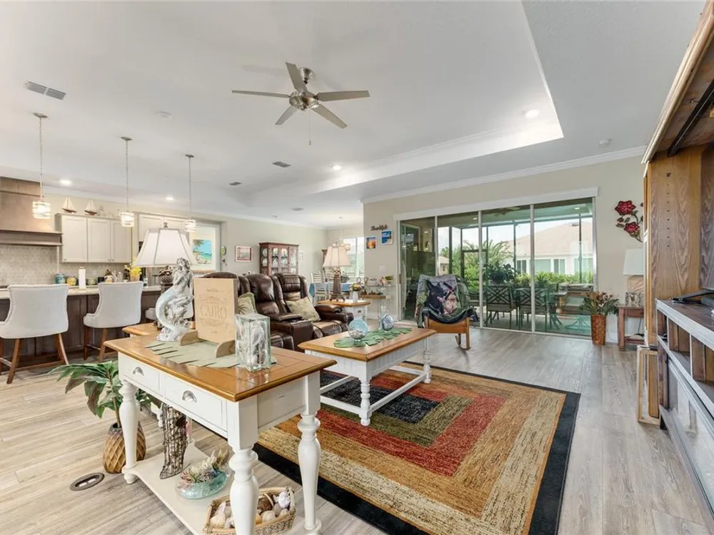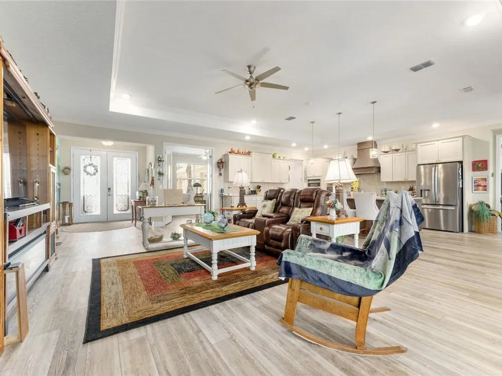 - Ceiling Fan(s), Crown Molding, Kitchen/Family Room Combo, Open Floorplan, Main Level Primary, Split Bedrooms, Stone Counters, Tray Ceiling(s), Walk-In Closet(s)