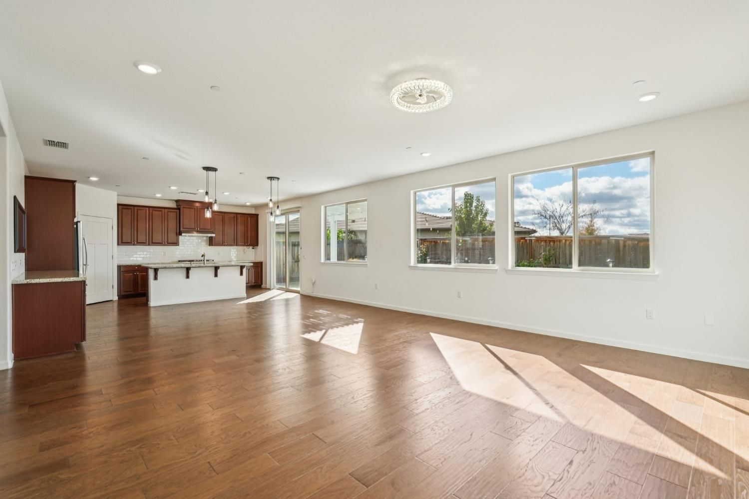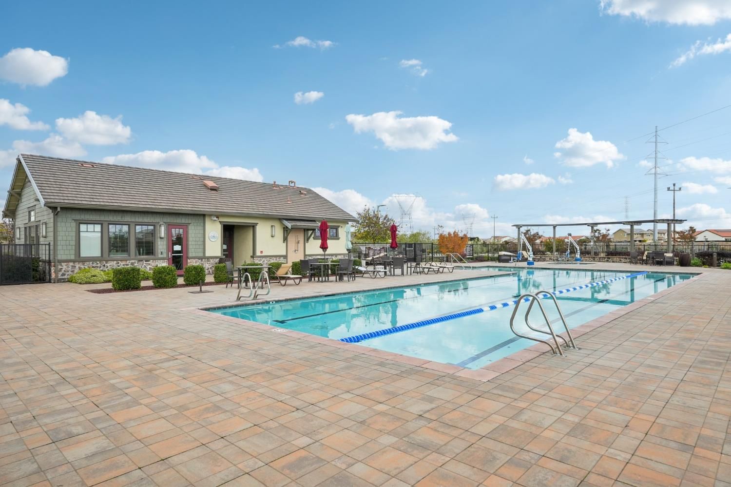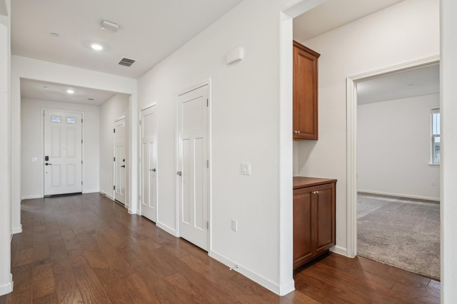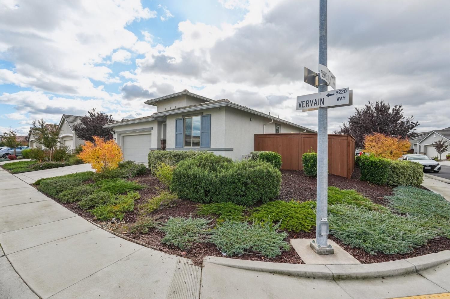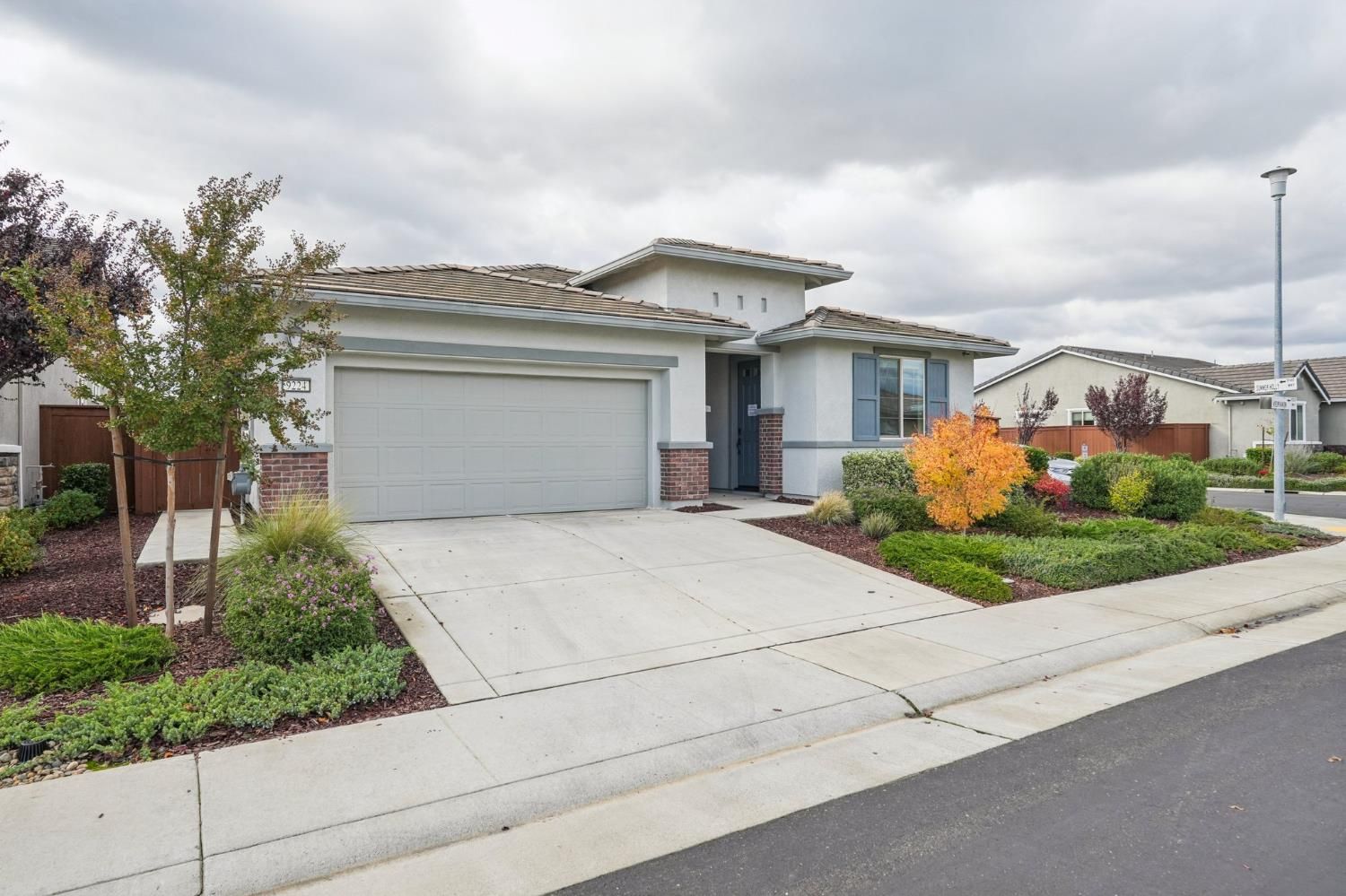 Located in the sought-after 55+ gated community of Dakota at Elk Grove, this beautifully maintained single-story home features three bedrooms and three full bathrooms on a premium corner lot. Built in 2020, the open layout includes wide-plank flooring, abundant natural light, and a spacious great room that flows into a well-appointed kitchen with espresso cabinetry, quartz counters, stainless appliances, a subway tile backsplash, and an oversized island. The floor plan offers a private junior suite and a generous primary suite with a walk-in closet and dual-sink vanity. Energy-efficient upgrades include owned solar and a tankless water heater, providing comfort and long-term savings. The low-maintenance backyard showcases a sky-view design, extensive concrete and river-rock hardscape, and a custom retaining wall with integrated lighting. Additional features include EV charging in the garage and upgraded side-yard hardscape. Residents enjoy resort-style amenities including a pool, spa, lounge areas, walking paths, tennis courts, a gym, and a dog park. Ideally located near Costco, Target, Sprouts, parks, trails, dining, medical facilities, and with quick access to Highway 99.