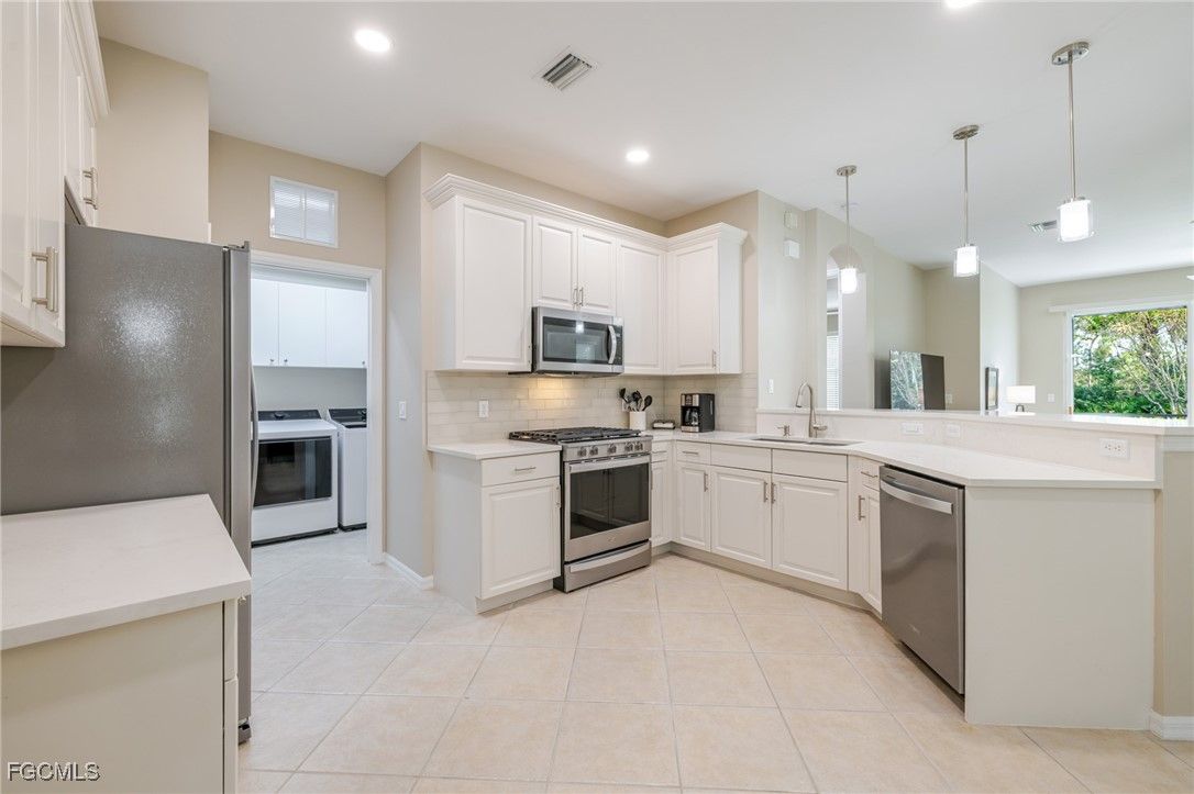 This charming home is the perfect opportunity you have been waiting for! All updates have been completed, making it move-in ready. As soon as you step through the door, you will fall in love with this adorable home. Over 32K in upgrades since 2004! The kitchen has been beautifully updated with painted cabinets, new hardware, countertops, glass backsplash, sink, faucets, microwave, and gas range. The laundry sinks and faucets have also been updated, along with new carpets in the bedrooms. Crown molding has been added, and the ceilings, walls, doors, and trim have been freshly painted. The front entry has been screened in, and new lanai screens have been installed to keep out pesky insects. Light fixtures and fans have been updated throughout, with canned lights added in several areas. Comfort high toilets have been installed, and the windows are all high impact. The roof was replaced in 2021, and the garage features built-in cabinets, workspace, and epoxy flooring. The AC unit is from 2012, and the water heater from 2018. This home offers an expanded living area, with plenty of space on the lanai for relaxing. The preserve area is private, with abundant natural wildlife to enjoy. The home is being sold Turnkey with just a few exceptions. Pelican Preserve is an award-winning 55+ community with a wealth of amenities, including walking trails, live music, pickleball, tennis, bocce ball, lawn bowling, cards, library, fitness center, pools, restaurants, spa, theater, optional golf memberships, and more. Conveniently located near the airport, theaters, shopping, stadiums, and beaches, this home offers the perfect opportunity to start living the dream. Don't wait - seize this opportunity now!