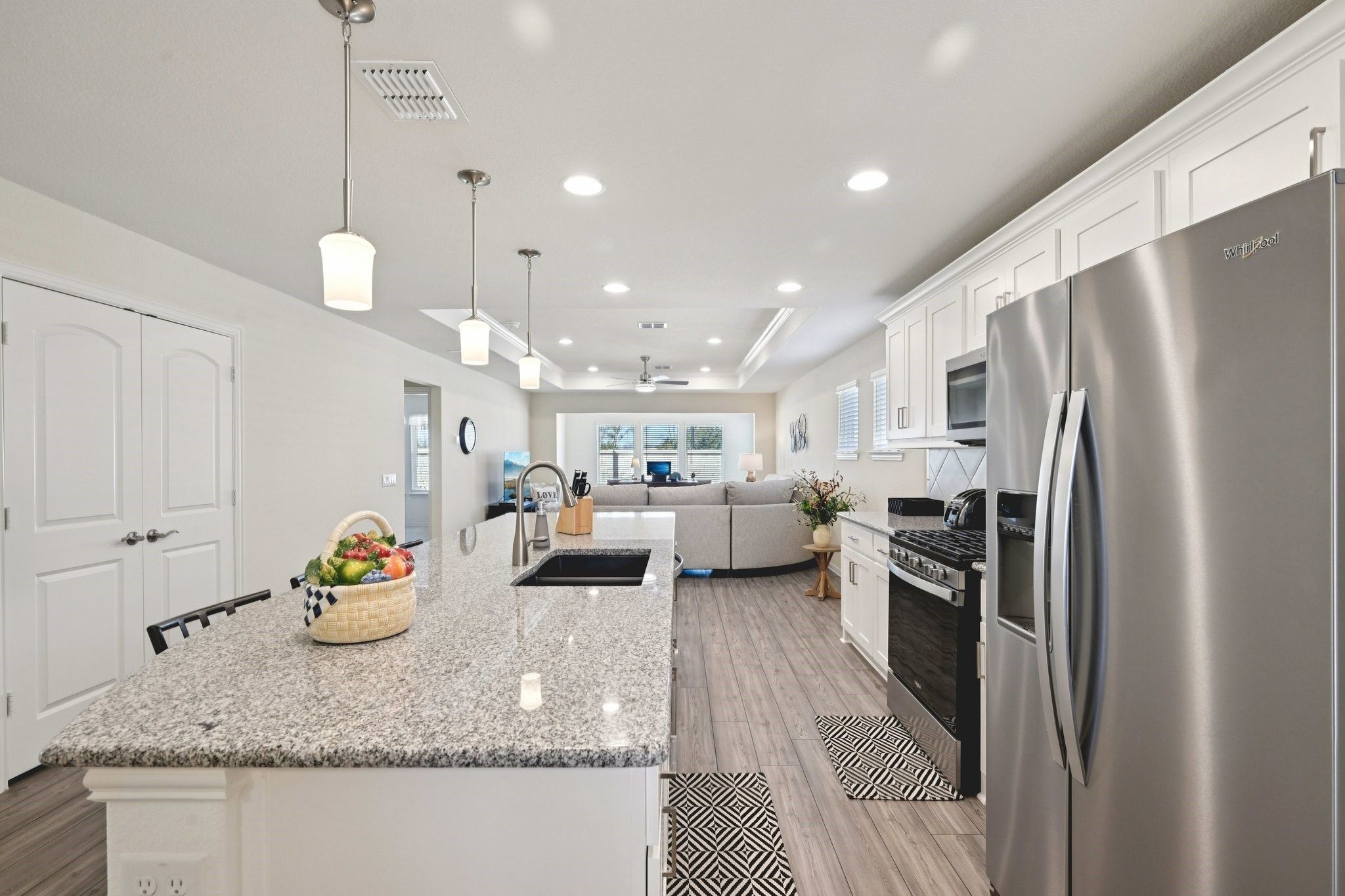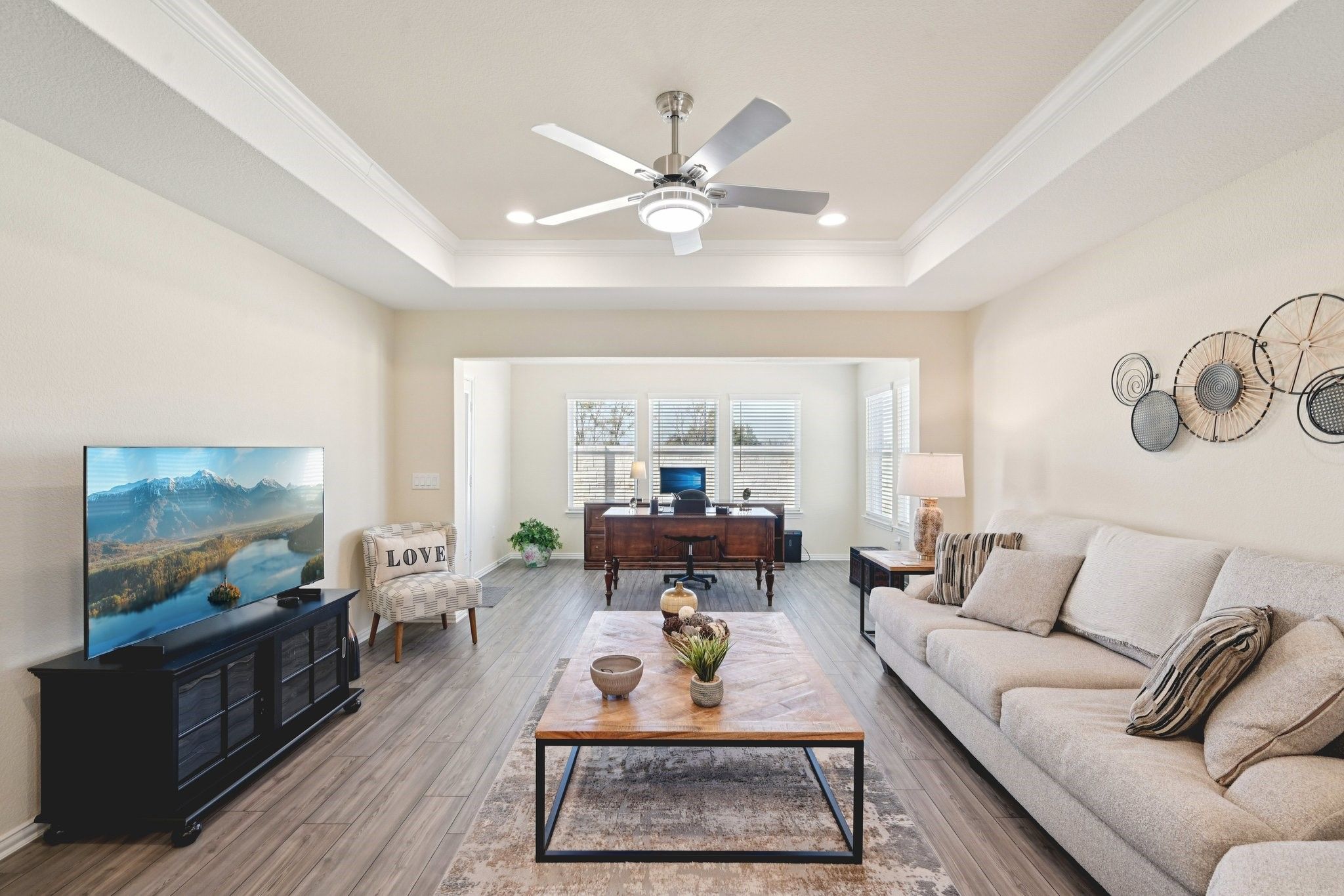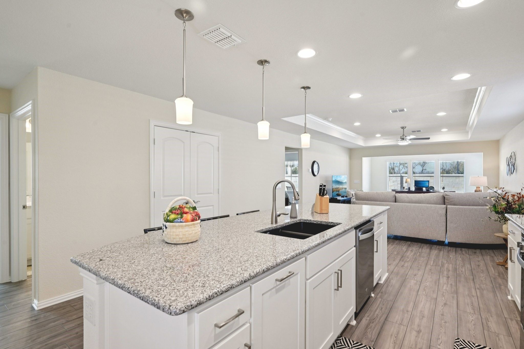 Welcome to this impeccably maintained Steel floor plan, ideally positioned within the highly desirable Del Webb active adult community at Trinity Falls. Thoughtfully designed for sophisticated, low-maintenance living, this beautifully appointed single-story residence offers the perfect balance of upscale finishes and everyday comfort—ideal for those looking to right-size without sacrificing style. The gourmet kitchen is a true centerpiece, showcasing elegant Granite countertops, crisp white cabinetry accented with designer hardware, and stainless-steel appliances—perfectly suited for both casual dining and entertaining. Just beyond, the inviting sunroom provides a tranquil retreat, ideal for morning coffee, a good book, or relaxing evenings with friends. A versatile flex space offers endless possibilities, whether utilized as a private study, arts and crafts room, or game area. Outside, upgraded stone and brick flowerbeds enhance the home’s curb appeal, creating a welcoming first impression. Conveniently located near shopping, dining, and everyday essentials, this home also provides quick access to major highways for seamless commuting and travel to nearby entertainment and medical facilities. Residents of this vibrant 55+ community enjoy an exceptional array of resort-style amenities, including a sparkling walk-in pool, ten pickleball courts, a state-of-the-art fitness center, numerous clubs and interest groups, inviting gathering spaces with a welcoming coffee bar, and a full calendar of social events and activities. Miles of scenic walking trails, serene fishing ponds, and beautifully maintained green spaces are thoughtfully woven throughout the neighborhood. More than just a home, this is a lifestyle community where connections flourish and every day feels like a getaway. Don’t miss the opportunity to experience the best of active adult living at Del Webb Trinity Falls. Schedule your private showing today.
