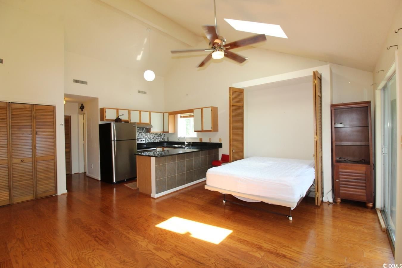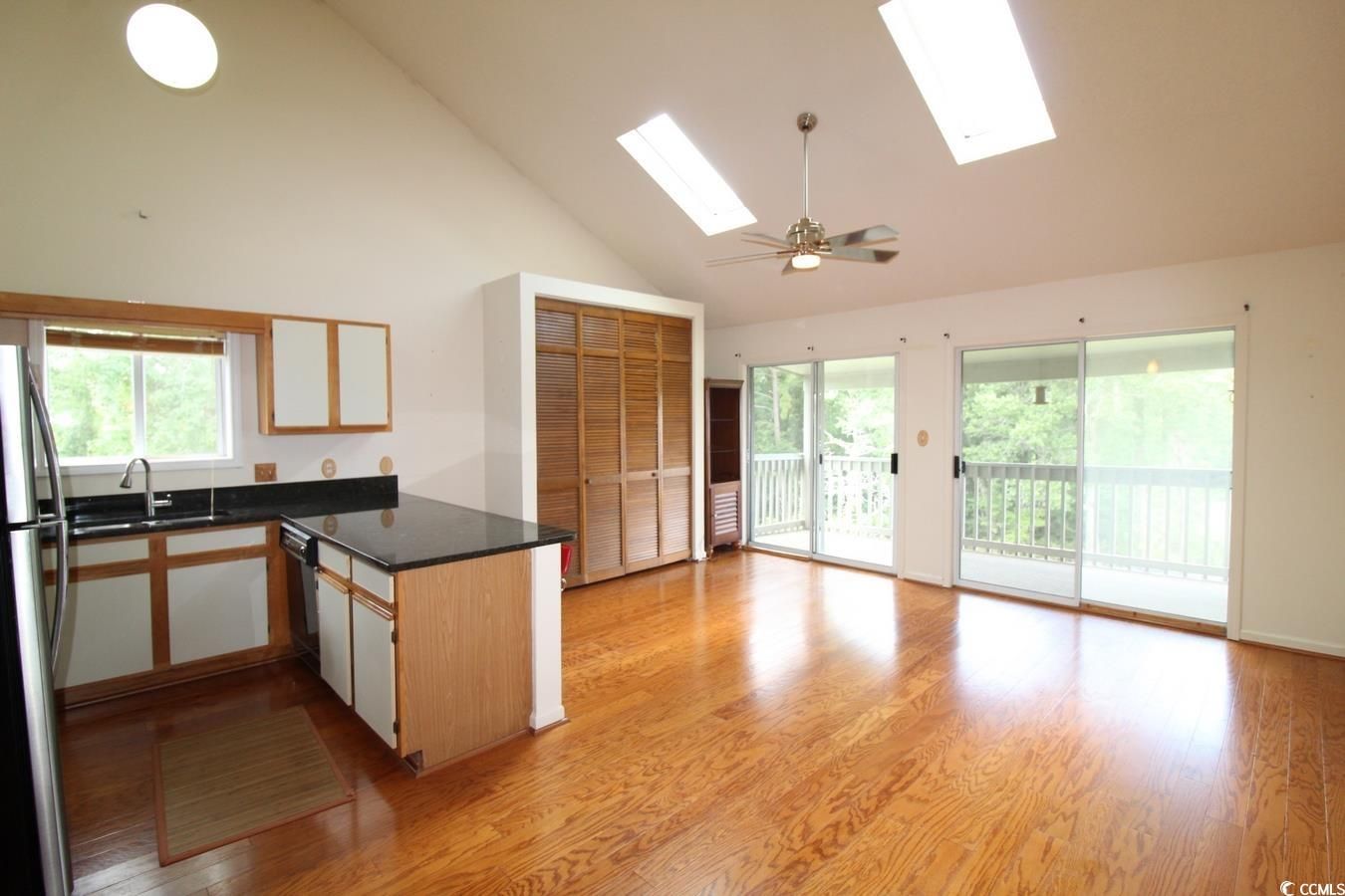 Priced to sell. This top floor, end unit has extra windows & two new skylights that allow for plenty of natural light. This studio condominium is located in the Fairwood Lakes III section of Island Green. The interior features natural hardwood floating floors & vaulted ceiling. Recent kitchen renovations include stainless steel appliances, flat top stove & granite countertops, tile counter kick wall. The kitchen also has a window over the sink, new stainless-steel sink with modern faucet and new backsplash. Sleeping accommodations are facilitated with a Murphy Bed. Newer lighting fixtures throughout include an extra-large remote controlled ceiling fan. There is a large, covered porch (17’x7.5’) with carpeting that enjoys extra privacy with this being a top-floor, end unit. New roof installed on the building in August 2024. HOA dues include water/sewer, security, basic cable and internet. Fairwood Lakes III is conveniently close to all the Coastal Carolinas has to offer, without being in the middle of all the traffic and crowds.