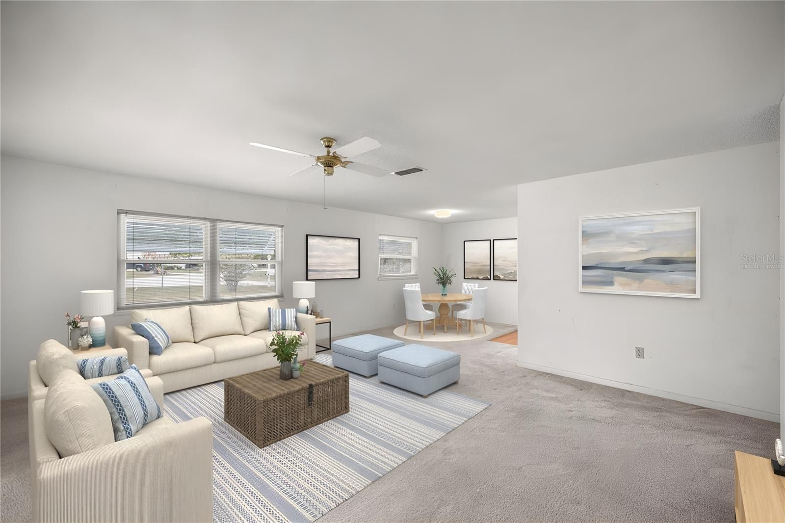 Lucky for you this home is back on the market - One of the largest homes in Pine Run – over 1,400 sq ft of living space! This move-in ready 2-bedroom, 2-bathroom home features a brand new roof installed in September 2025, a brand new hot water heater, and has been freshly pressure washed on the exterior. Carpets and interior have been professionally cleaned as well! Enjoy a spacious living area that opens to a large bonus room via sliding glass doors – perfect for relaxing, entertaining, a craft space, or even an extra family room. The bonus room also includes a Murphy bed, ideal for guests that easily tucks away when not in use.The kitchen is charming and functional, offering a brand new range, stainless steel refrigerator and microwave with plenty of cabinet space. Both bedrooms are generously sized. The home features two full bathrooms — one with a walk-in shower, and the other with a tub/shower combination, providing flexibility and convenience. Additional features include a large, screened-in 2-car carport with sliding screen doors and the benefit of a corner lot location for added privacy.Pine Run is a sought-after 55+ community conveniently located just off SR 200 – close to shopping, grocery stores, medical facilities, restaurants, and more.