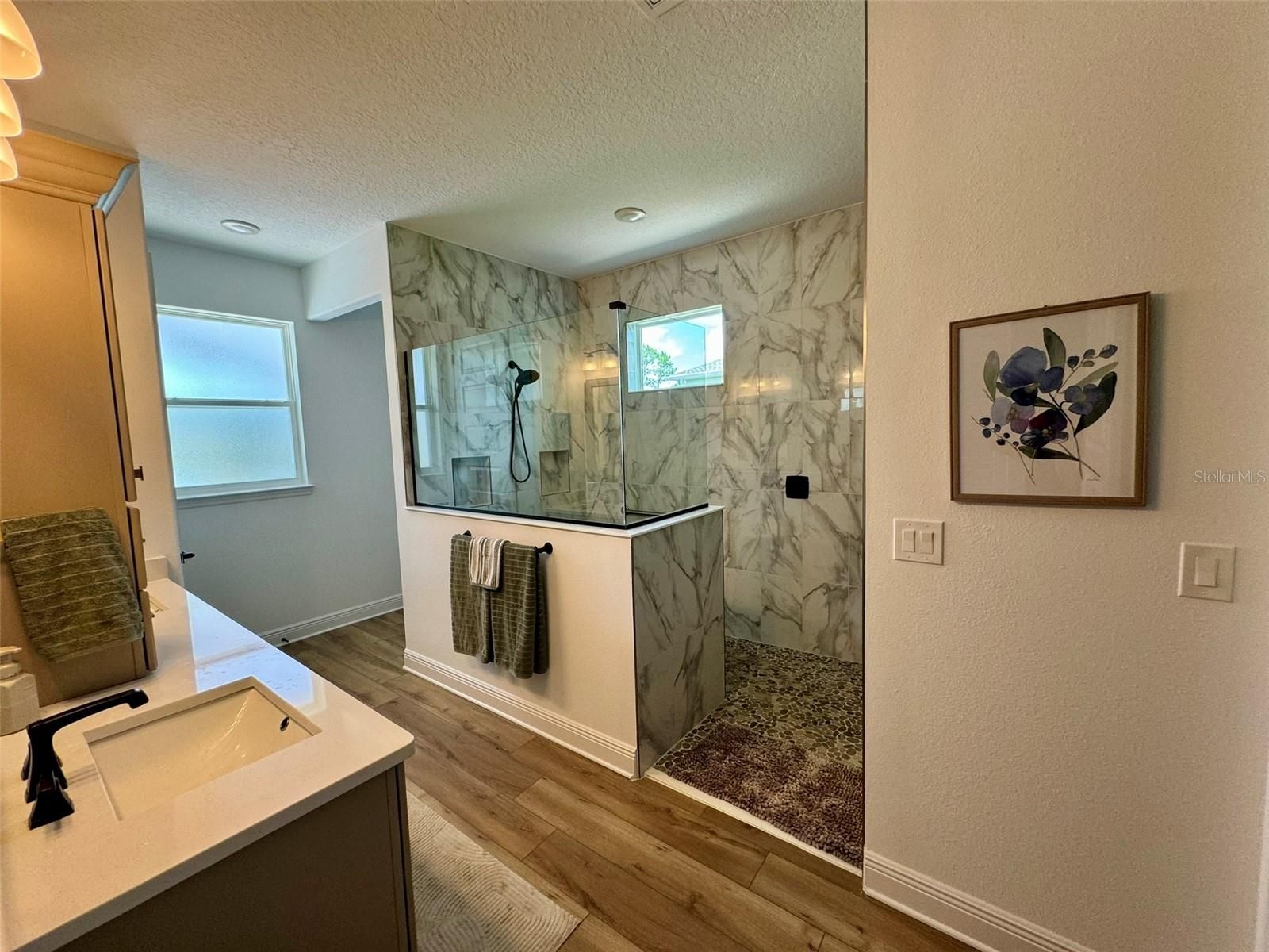 - Built-in Features, High Ceilings, Open Floorplan, Main Level Primary, Split Bedrooms, Stone Counters, Thermostat, Tray Ceiling(s), Walk-In Closet(s), Window Treatments