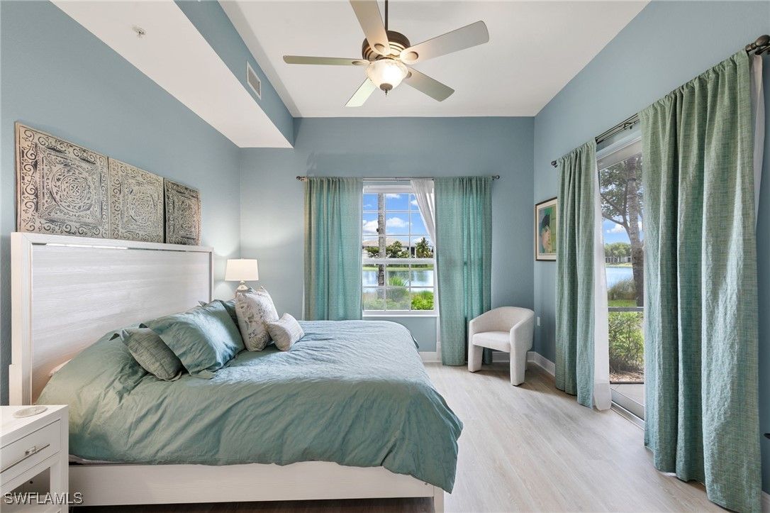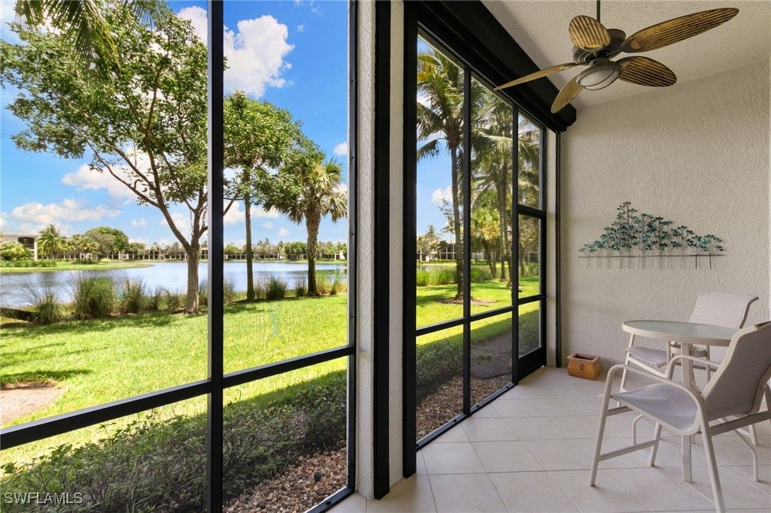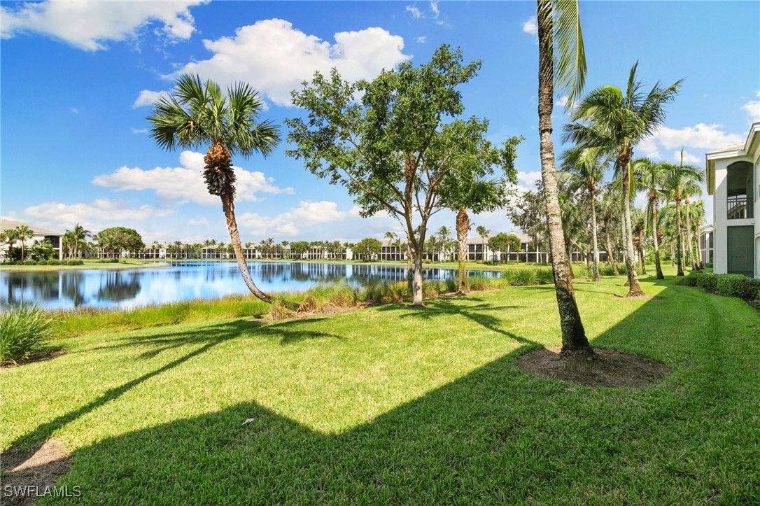 CDD PAID IN FULL! Step into this charming, meticulously maintained 3-bedroom, 3-bath condo, and be instantly captivated by panoramic WATER views. Thoughtfully designed for comfort and peace of mind, this residence boasts Storm Smart roll-down shutters on the lanai, a NEWER ROOF and IMPACT windows and sliders throughout. The open-concept layout features neutral tile floors, with CoreTec (luxury vinyl) in the bedrooms adding warmth and durability. Volume ceilings enhance the spacious feel, allowing for an abundance of natural light. The primary suite is a true retreat, with serene Falkland Blue walls, a frameless glass, SPA-LIKE shower, and a separate soaking tub. Dual sinks offer added convenience, making this space as functional as it is tranquil. For culinary enthusiasts, the kitchen is a dream. With GAS COOKING, custom white cabinetry, lovely granite counters, a large island perfect for meal prep, and a generous pantry, you'll have PLENTY of space to create and entertain. The kitchen is finished in a soothing Violet Mist, complementing the elegant and inviting custom draperies in the home. Best of all, the kitchen, great room, and many other rooms in the home overlook the WATER, offering peaceful views to enhance your everyday living. The two additional guest bedrooms provide privacy and comfort, making this home ideal for hosting family and friends. The courtyard entry, complete with a cozy seating area, welcomes you into this inviting space, while the expansive lanai provides plenty of room for lounging and dining al fresco—ALWAYS with serene water views in the background. Other recent updates include lanai screen, tankless hot water heater and a new garage door opener-offer peace of mind and ease of ownership. The Laguna community also has its own pool, perfect for a refreshing dip just steps from your door. Fiddler’s Creek is a prestigious resort-style community where luxury and nature exist in perfect harmony. Featuring world-class amenities such as the Club & Spa, casual and fine dining, championship golf courses, and beautifully landscaped grounds, residents enjoy a lifestyle that blends relaxation with recreation. Optional memberships for beach, boating, and marina access provide even more ways to enjoy the coastal lifestyle. Minutes from Marco Island AND downtown Naples, Fiddler’s Creek offers an unparalleled living experience.