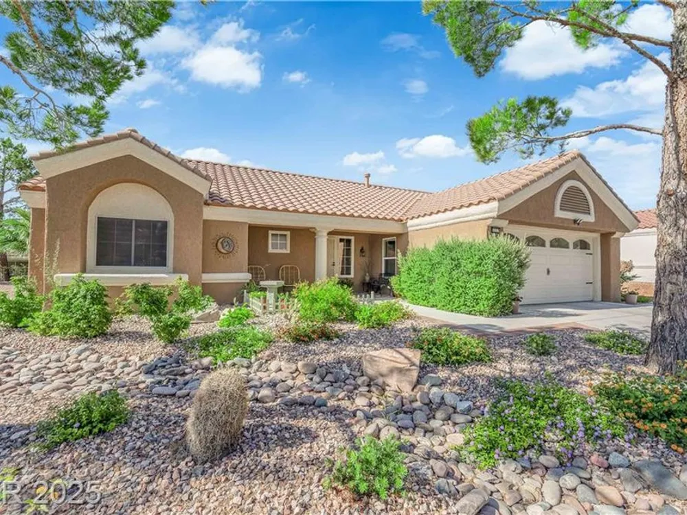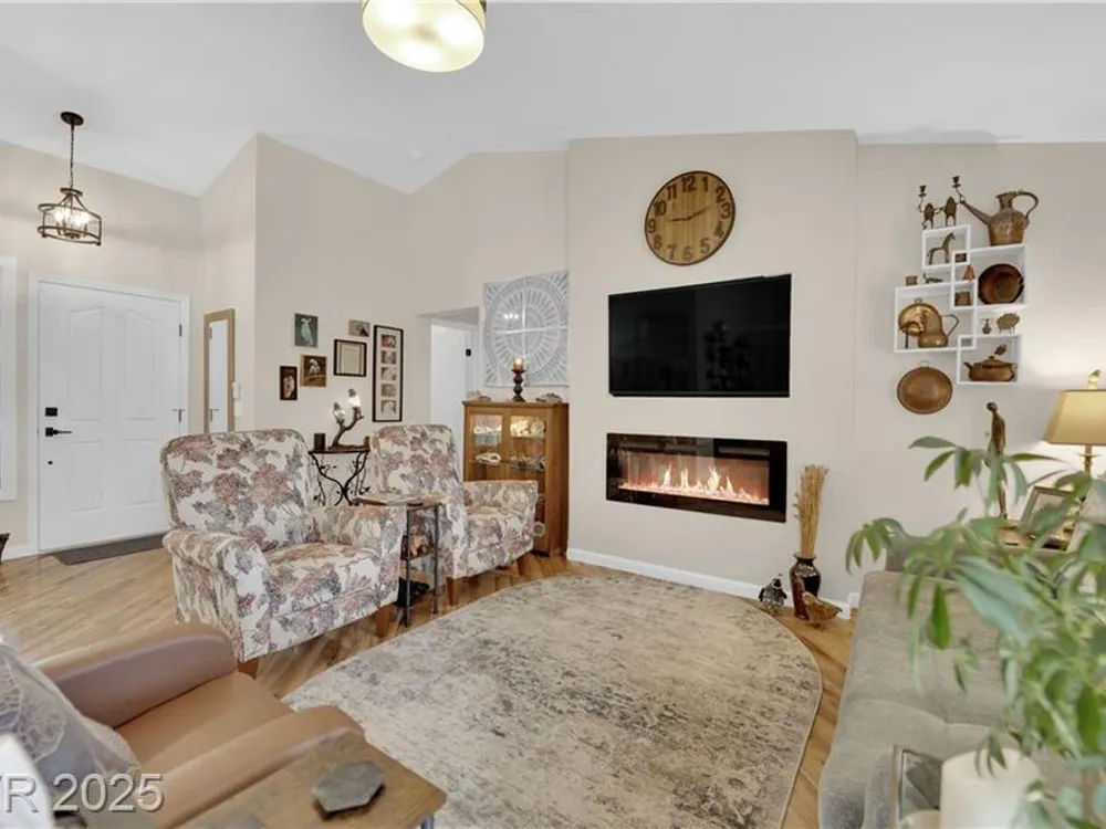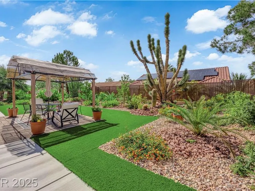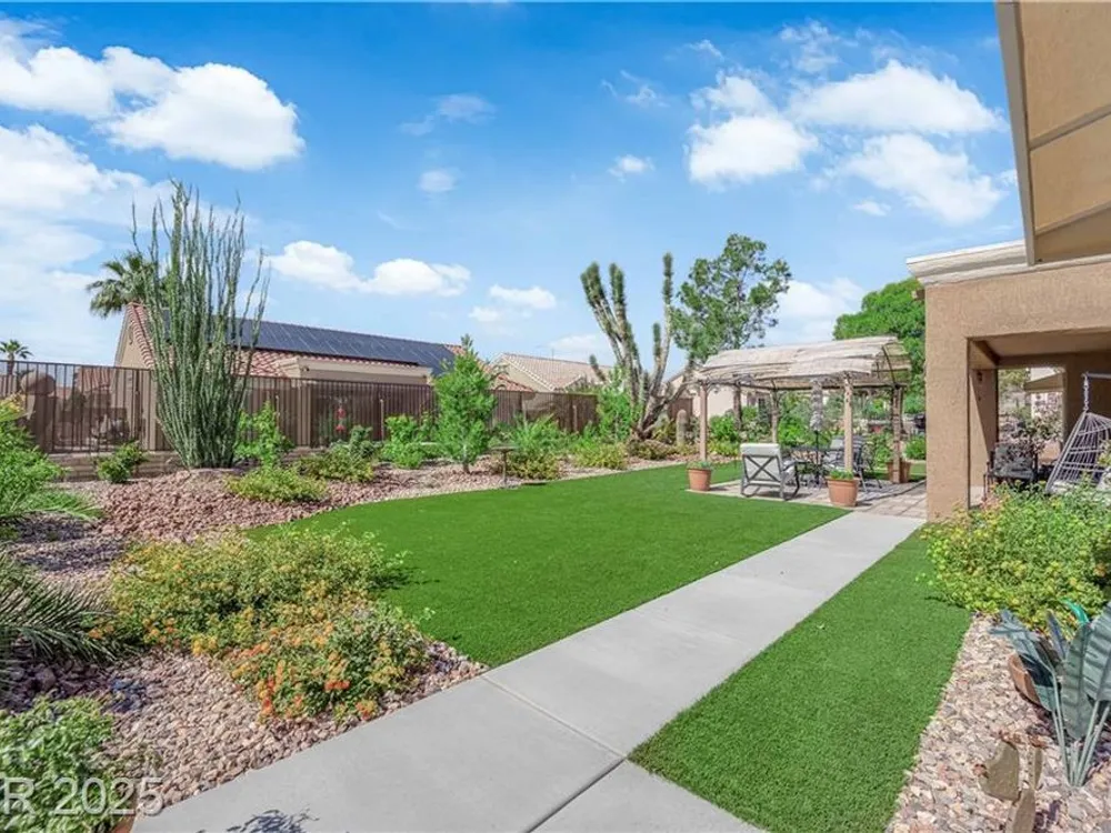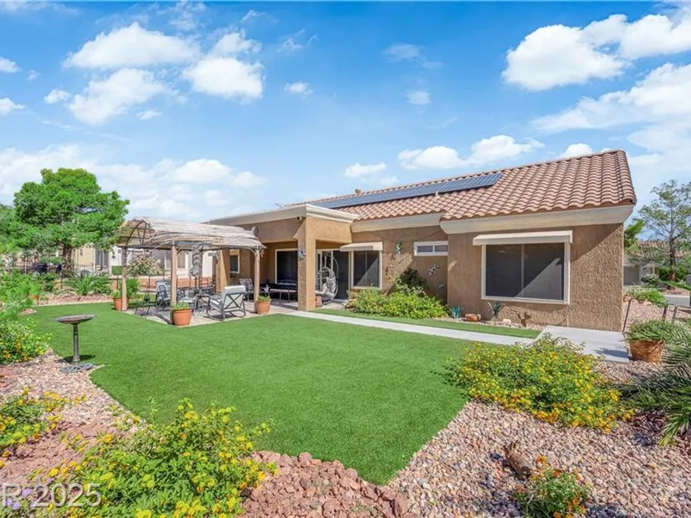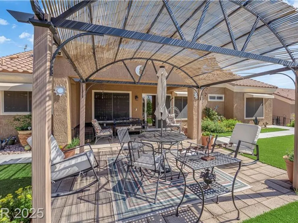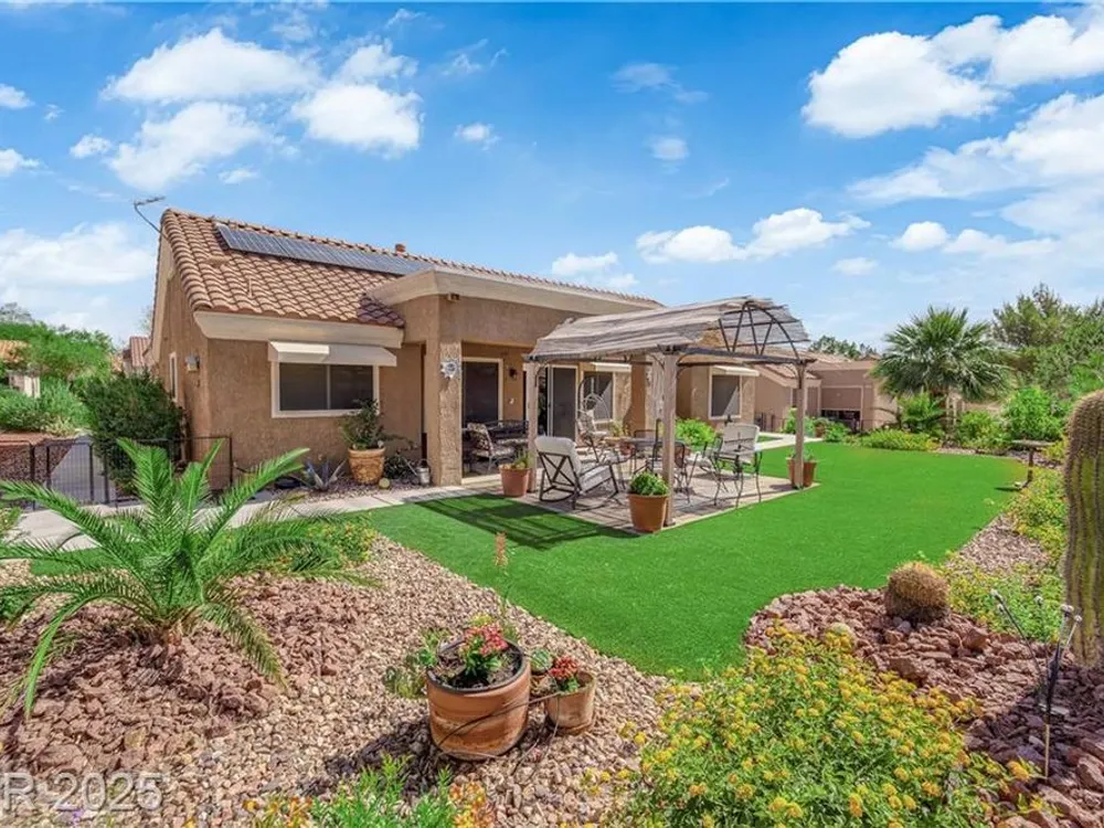HIGHLY UPGRADED 3-Bedroom Home with Paid-Off Solar Panels in Sun City Summerlin!This beautifully upgraded 3-bed, 2-bath home features paid-off solar panels for \$19/month electric bills. The rare third bedroom adds flexibility, while the upgraded kitchen boasts new counters, sleek black hardware, and modern appliances. Relax by the cozy electric fireplace with optional heat.Enjoy new fans, newer flooring, and cordless pleated blinds throughout. The laundry area is updated with new cabinets for extra storage. Outside, you’ll find new awnings, solar screens, and immaculate landscaping with irrigation. The new garage door and storage rack provide added convenience.This home offers both style and energy efficiency, along with easy access to Sun City Summerlin’s exceptional amenities. Schedule your tour today!