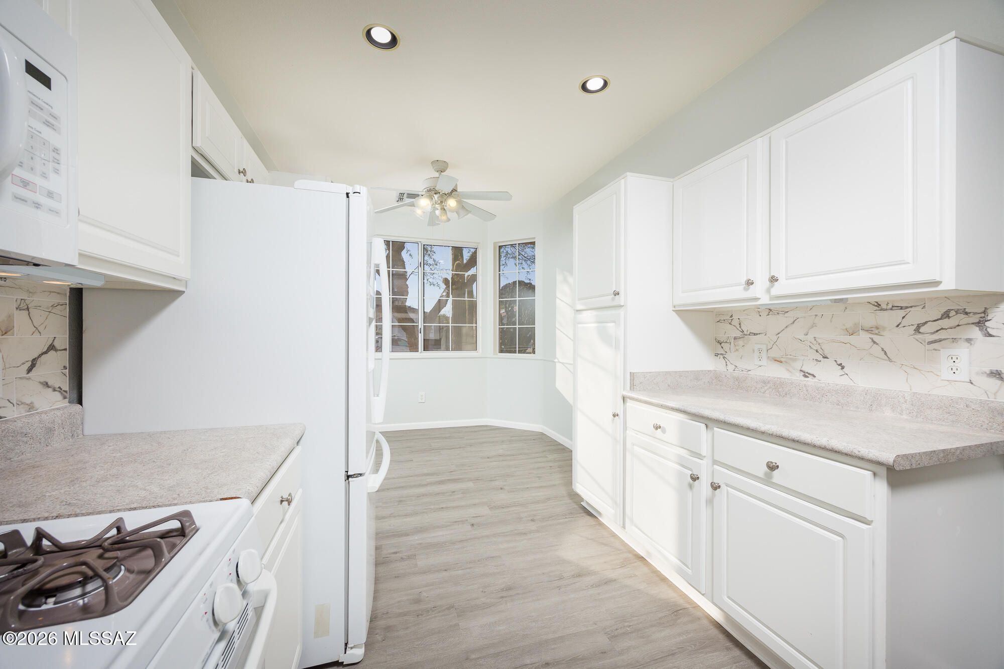 Enjoy mountain and sunset views from this beautifully updated home. The freshly painted interior, new vinyl floors through out the home, new high toilet toilet's in both bath's. stylish finishes and numerous upgrades throughout. The kitchen features a charming bay window eating area and convenient breakfast bar, with new marble black splash. perfect for casual dining. The spacious primary suite offers a walk-in shower and large walk-in closet. Relax in the shaded backyard with a screened-in patio, ideal for enjoying Arizona evenings. Community amenities include a recreation and fitness center, pool, and tennis courts--offering plenty of opportunities for fun and relaxation.