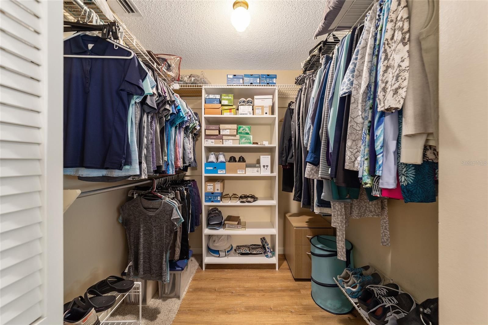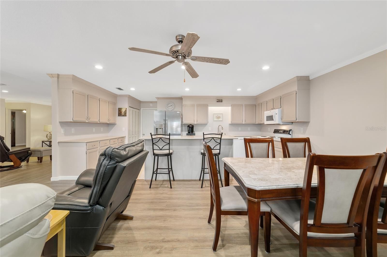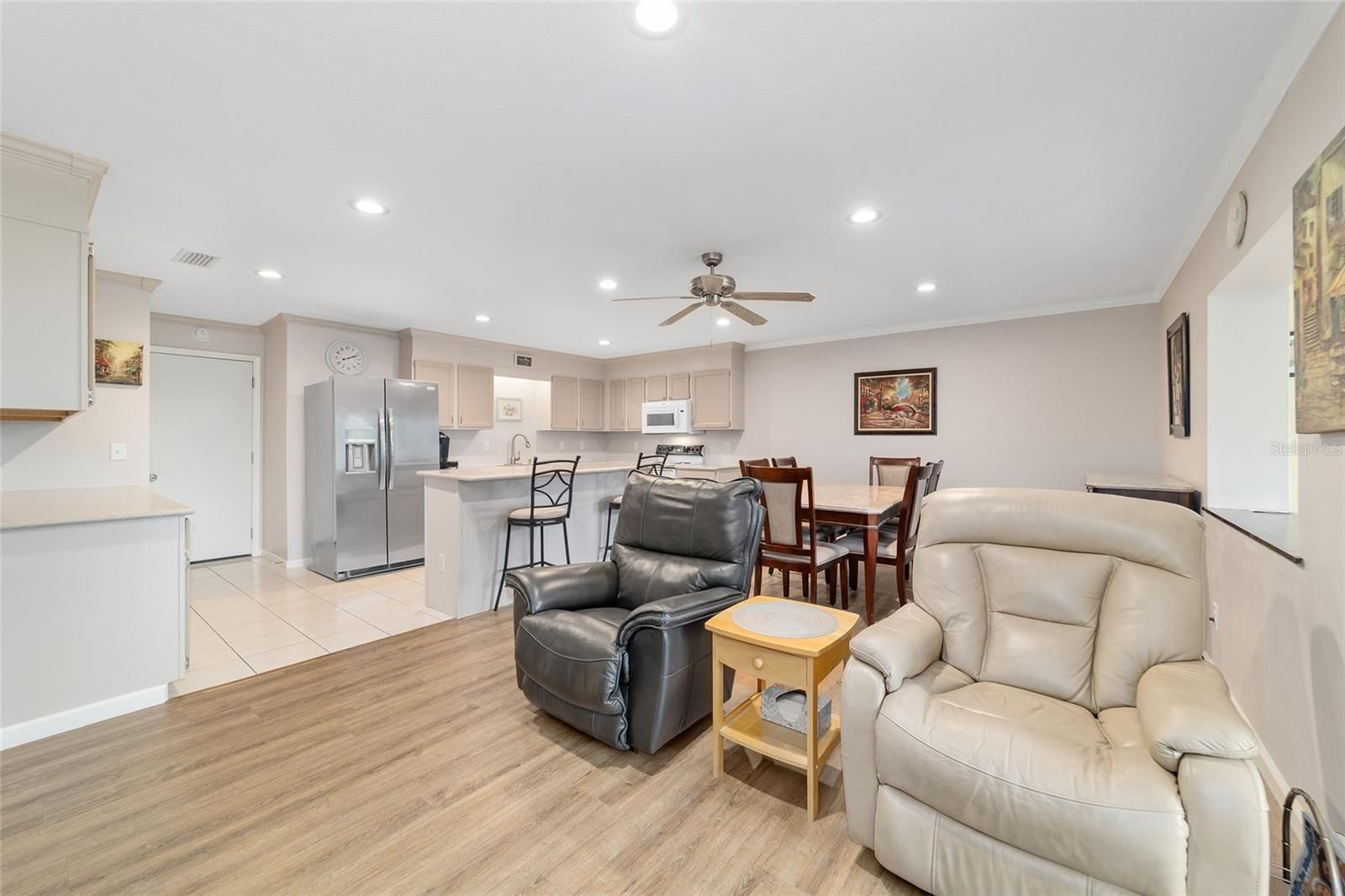 - Ceiling Fan(s), Eat-in Kitchen, Kitchen/Family Room Combo, Living/Dining Room, Main Level Primary, Solid Surface Counters, Walk-In Closet(s), Window Treatments