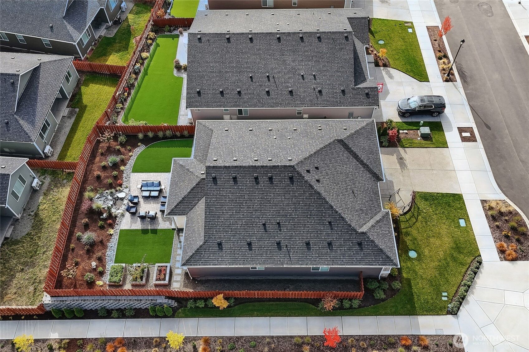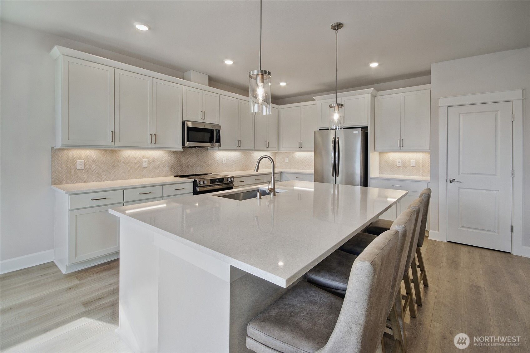 NEW ON MARKET! Turn-key home in the desired 55+ community of Ovation at Oak Tree. This 2 bed + Den/office home offers easy single level living with no-step entry & quality finishes throughout. Enjoy wide planked LVP flooring, quartz counters, ultra-glide blinds, additional storage cabinets, plus a heat pump! Spa like primary bath with dual sinks, tiled shower, & large walk-in closet. Situated on a corner lot, the backyard is a showstopper with gorgeous landscaping, a soothing fountain, raised garden beds, low maintenance turf, pavers, plus an oversized covered patio...all with a Mt Rainier view! Active lifestyle community with trails & clubhouse, all situated on a 40-acre Oak Preserve. Perfect blend of comfort, style, and peaceful living!