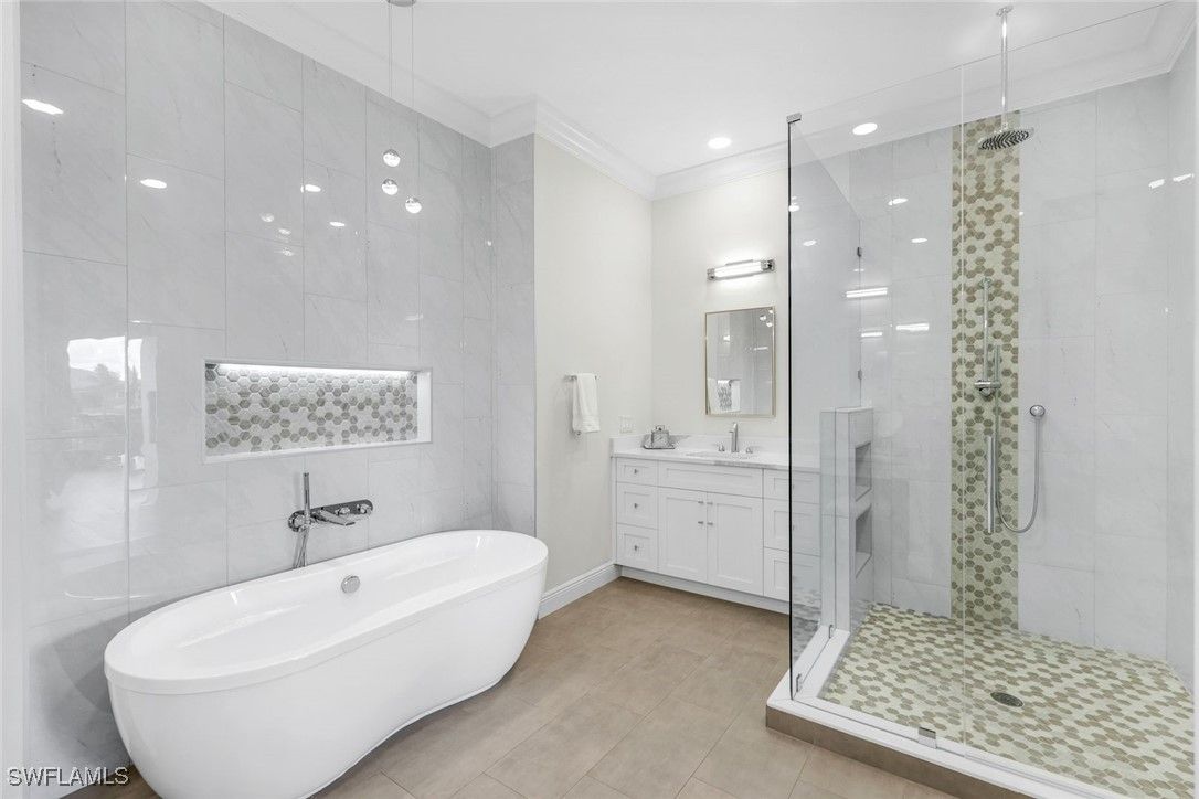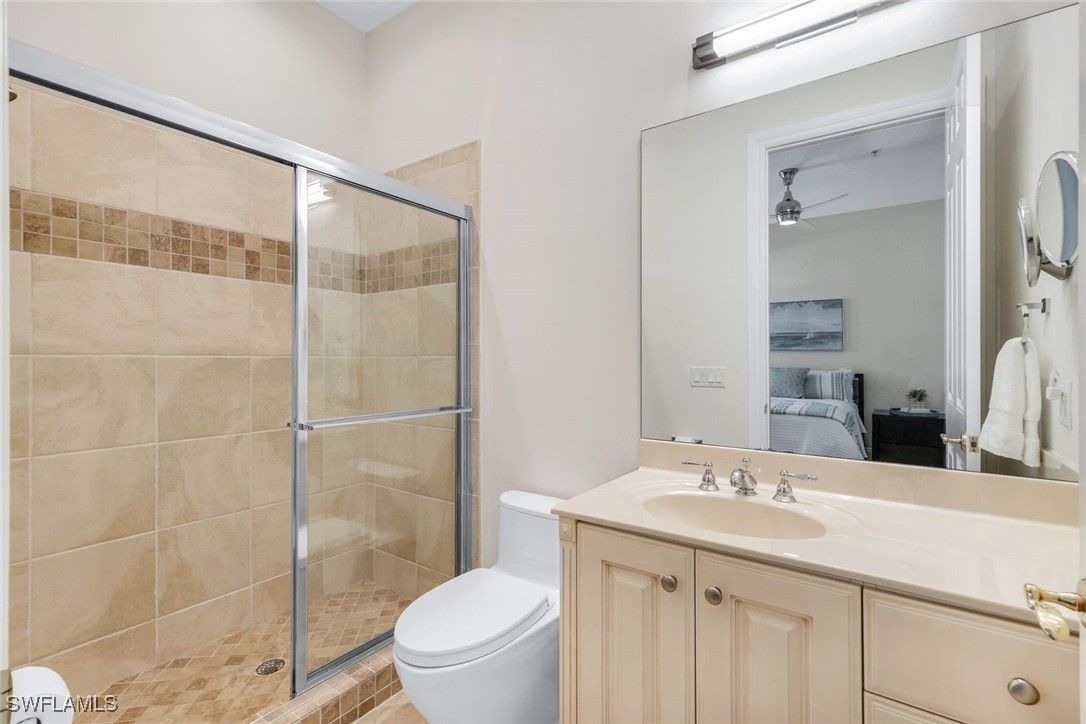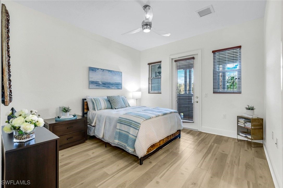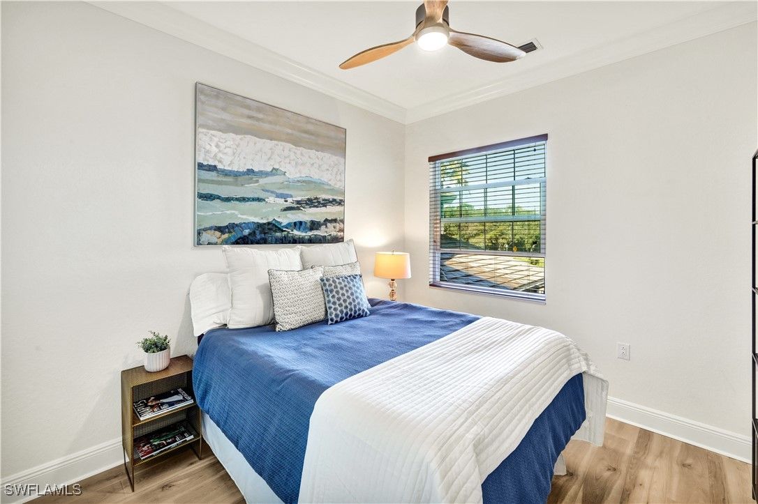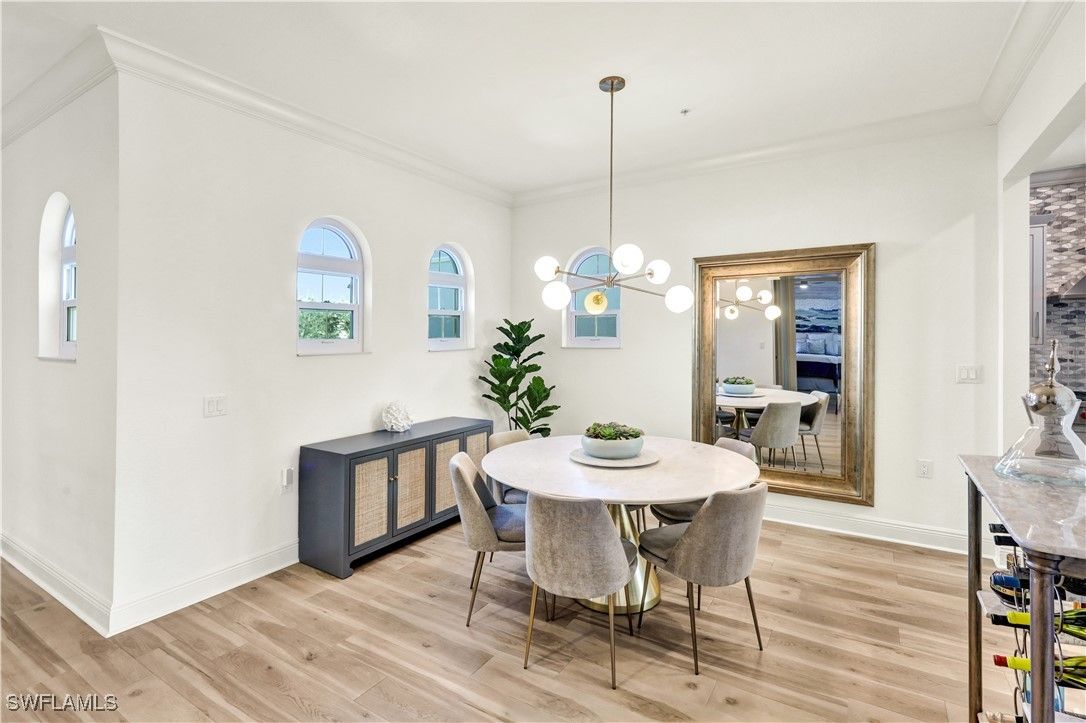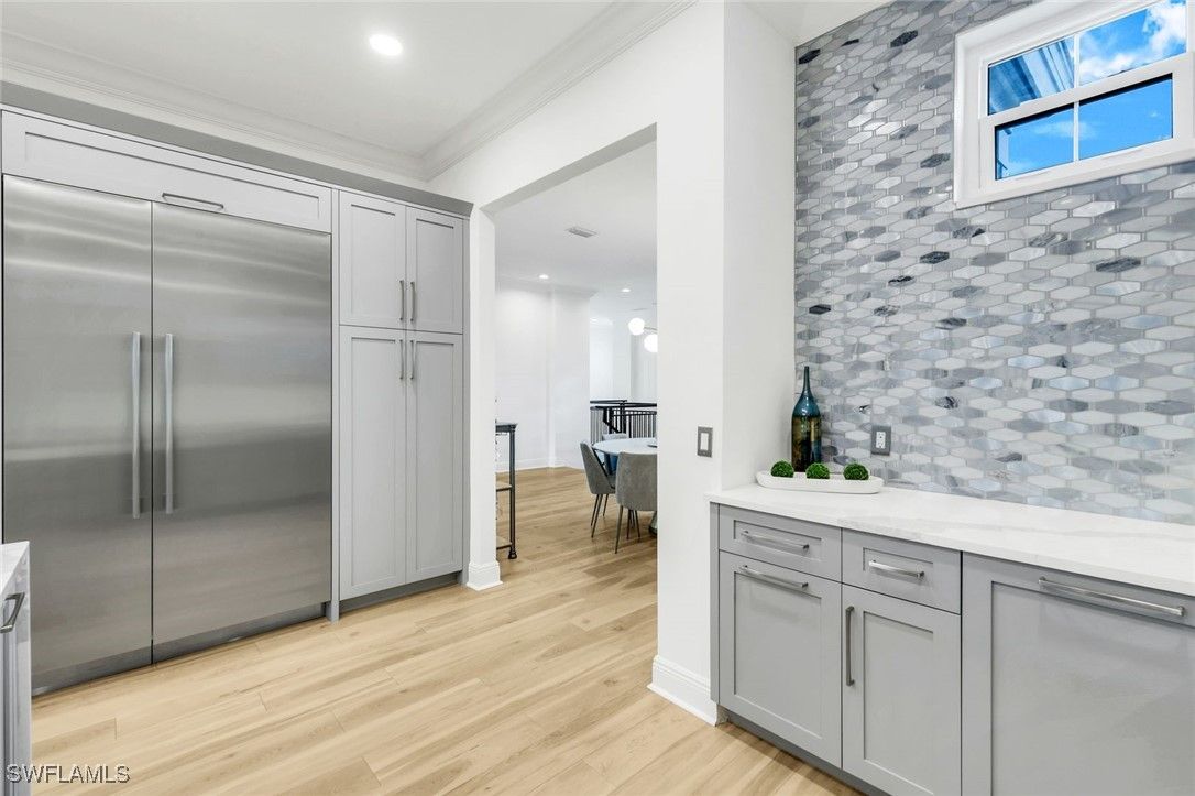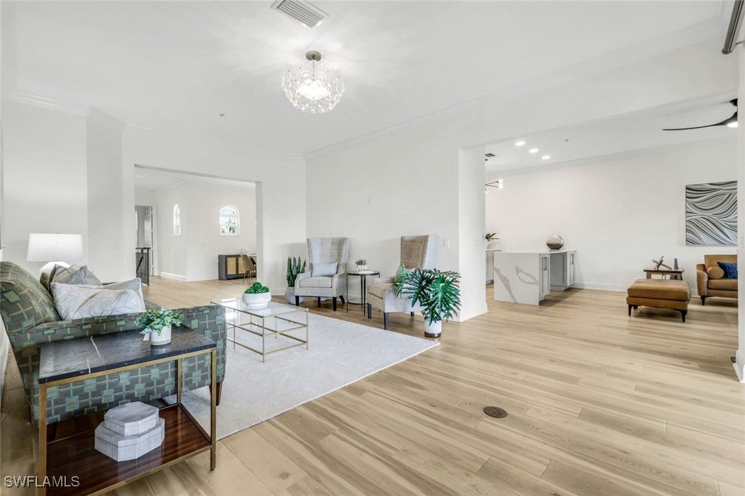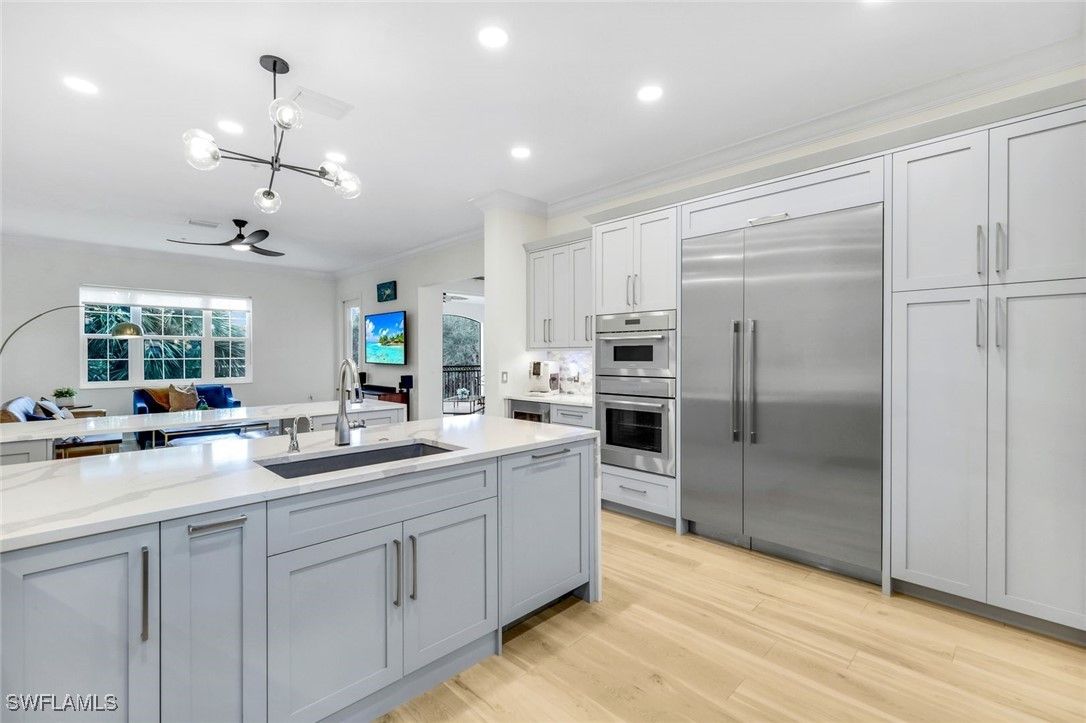 Step into this FULLY RENOVATED AND HIGHLY UPGRADED WITH BEAUTIFUL WATER VIEW AND FLORIDA SUNSETS. coach home finished with CoreTec luxury waterproof plank flooring, fresh interior paint, crown molding, and upgraded designer lighting throughout. The neutral palette keeps the home bright and modern. The chef’s kitchen, which is the centerpiece of the home, has been completely redesigned and features a Wolf gas range and a full Thermador appliance package, including double ovens, oversized refrigerator/freezer towers, dishwasher, and wine cooler. Custom cabinetry includes rollout shelving , integrated spice racks and tons of storage. The marble backsplash and dual quartz waterfall-edge islands provide both striking design and exceptional functionality for entertaining and everyday living. The kitchen flows seamlessly into the great room, where southern exposure and long lake views fill the space with natural light. Large sliding glass doors lead to an oversized screened lanai, creating excellent indoor-outdoor living. This area is ideal for dining, relaxing, or entertaining while enjoying peaceful water views. The primary suite is privately positioned and offers direct access to a lake-view balcony. It features automated drapery, custom closets, and a fully upgraded spa-style bathroom with a freestanding soaking tub, glass-enclosed shower with rain shower and handheld sprayer, quartz dual vanities, and a Toto toilet. Custom cabinetry includes rollout shelving and concealed electrical outlets for maximum storage and convenience. The guest suite includes a Juliette balcony that brings in natural light and fresh air. The guest bathroom and laundry room continue the same elevated standard with quartz countertops and upgraded fixtures. At ground level, you’ll find the two-car private garage with built-in shelving and a 2023 garage motor. There is a generous storage area on each floor that has already been prepared as an elevator shaft, giving the future owner the option to install an elevator if desired. This is a valuable feature for long-term flexibility. Recent updates include a NEW tankless water heater (2024), fresh interior paint, and a building that has been fully improved with a NEW roof, new hurricane windows, new gutters, and new exterior paint. This building also offers rare off-street guest parking, a notable advantage within the community. Ownership includes access to the award-winning Fiddler’s Creek resort-style pools, clubhouse dining, spa, fitness center, tennis, pickleball, and optional golf membership just minutes from Marco Island beaches and downtown Naples.