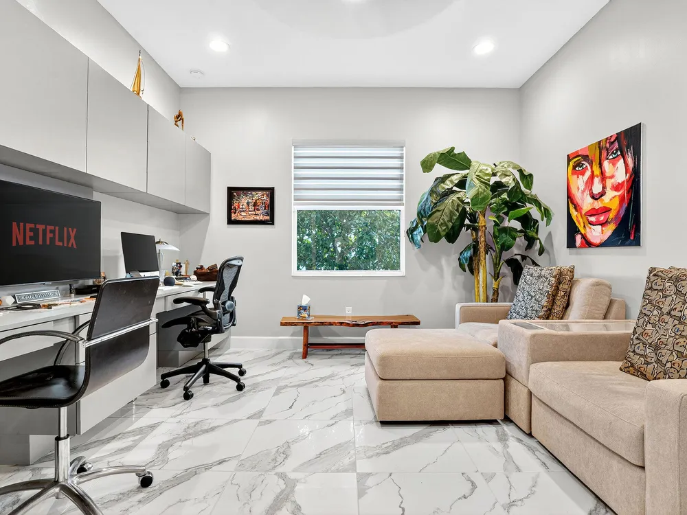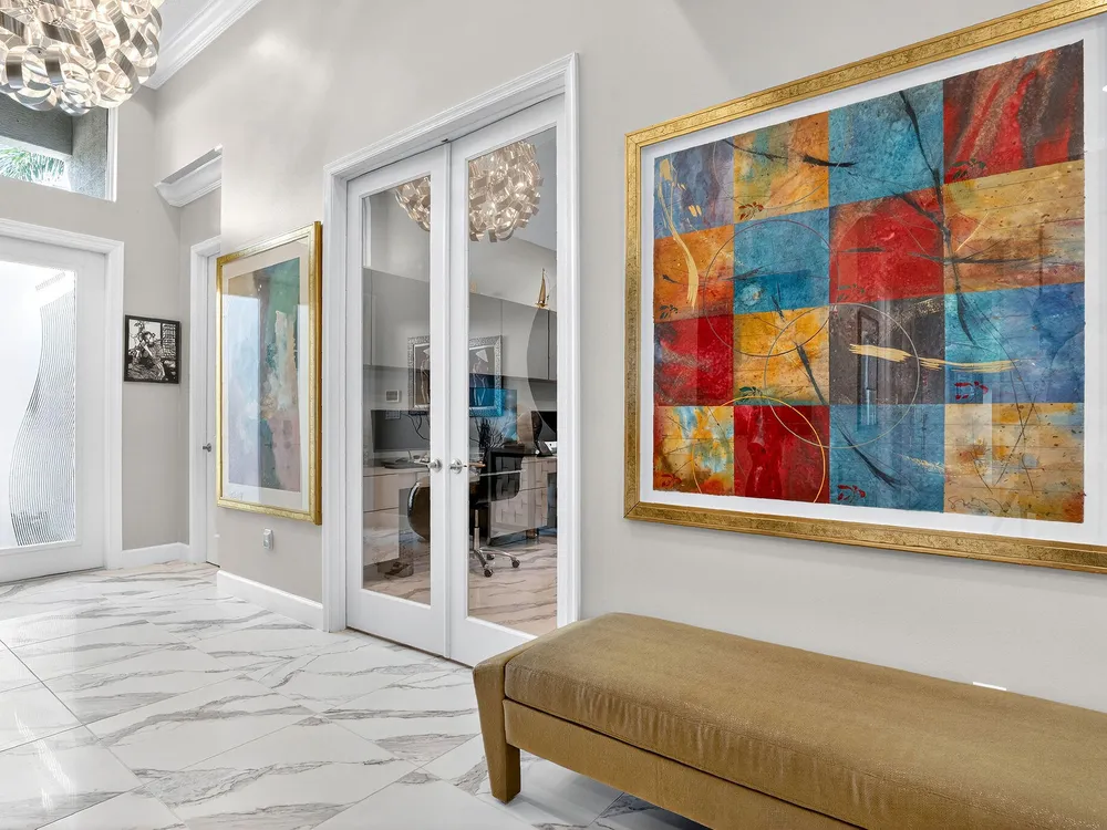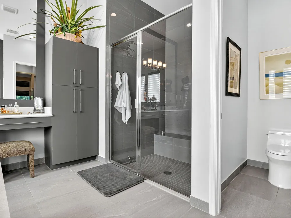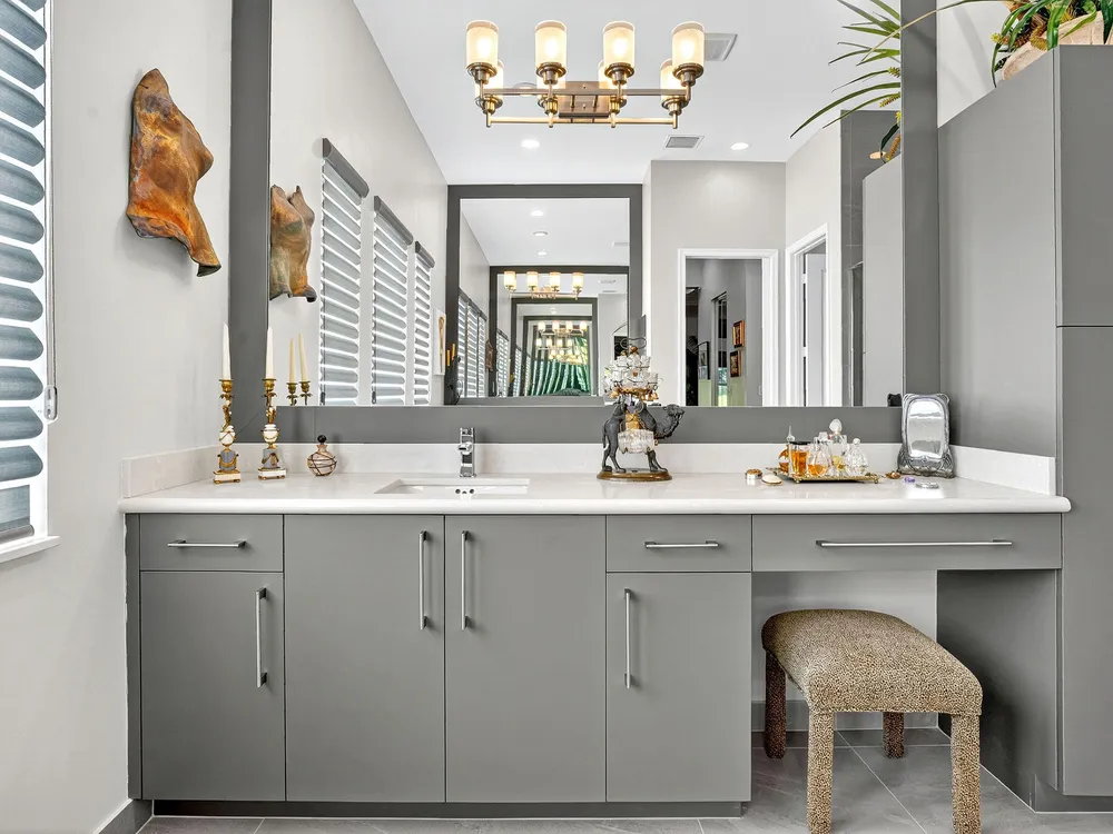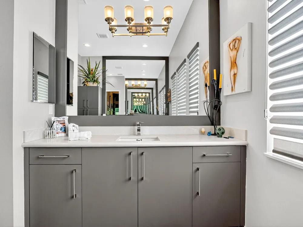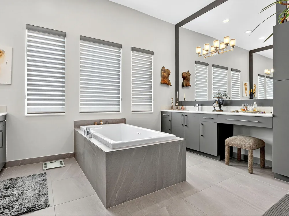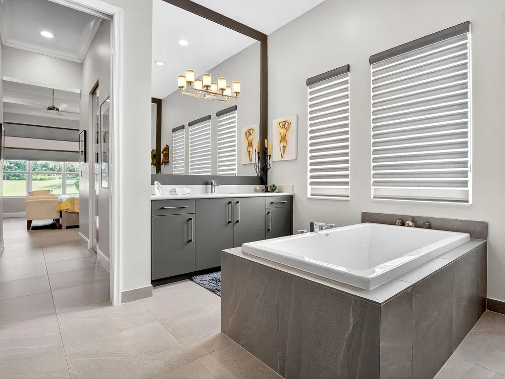 - Built-in Shelving, Closet Cabinetry, Entry Level Living Area, Entrance Foyer, French Door(s)/Atrium Door(s), Kitchen Island, Pantry, Garden Tub/Roman Tub, Split Bedrooms, High Ceilings, Walk-In Closet(s), Living/Dining Room, Blinds, Storm Window(s), Impact Glass, Picture Window(s), Dual Sinks, Primary Downstairs, Separate Shower, Bathtub