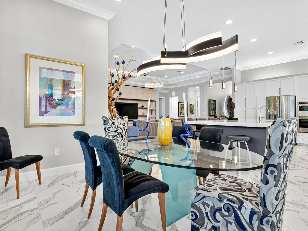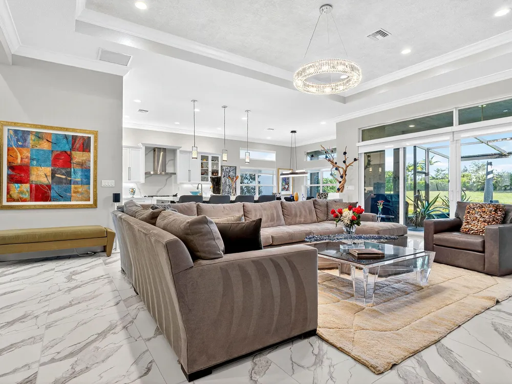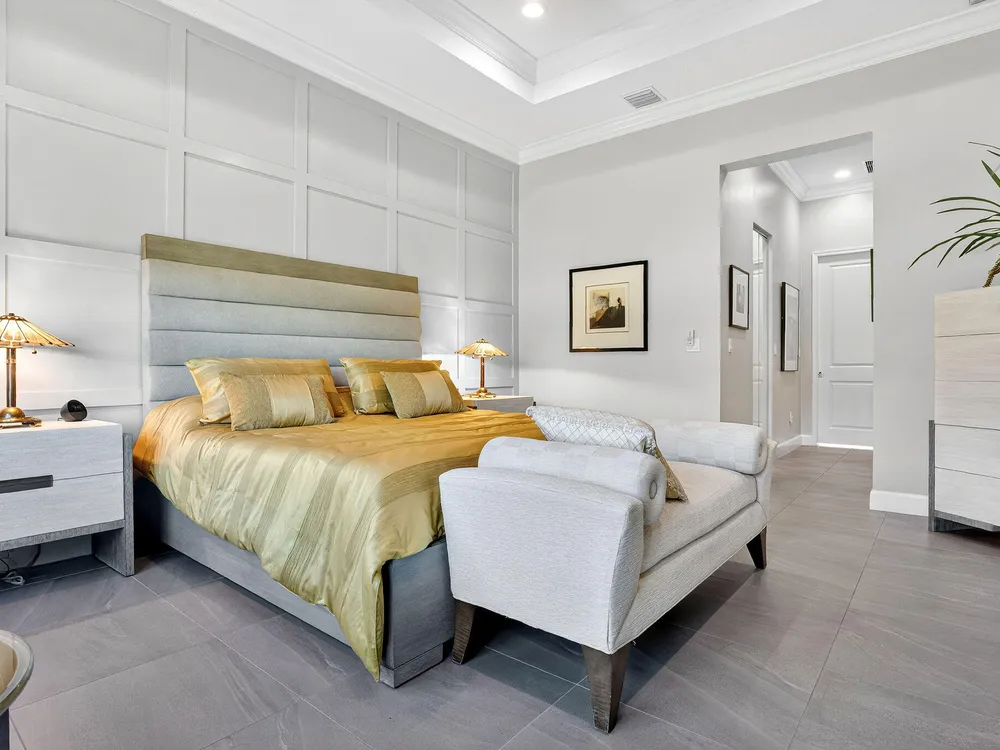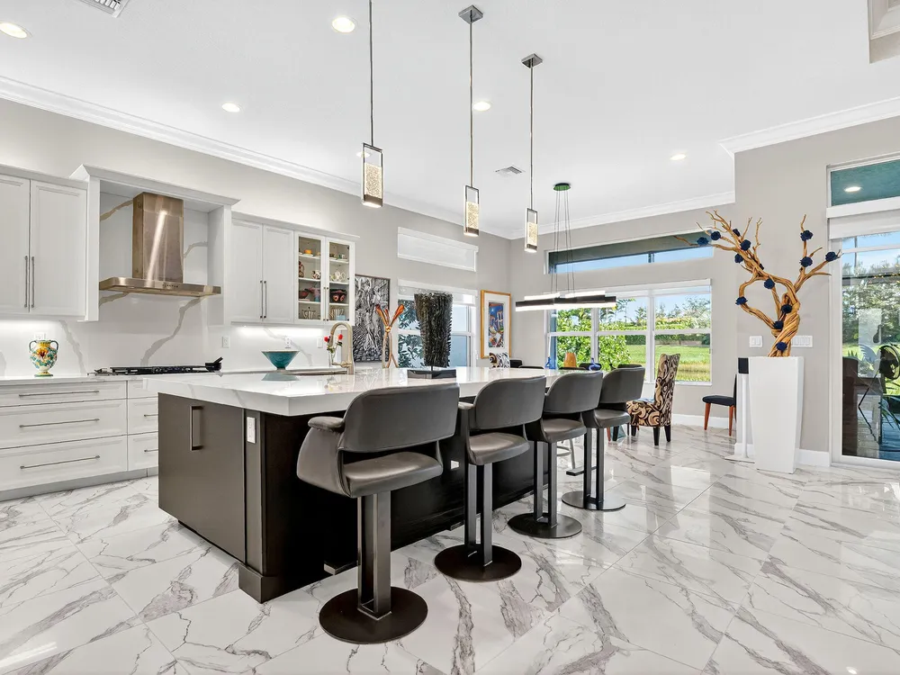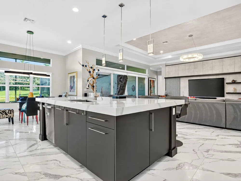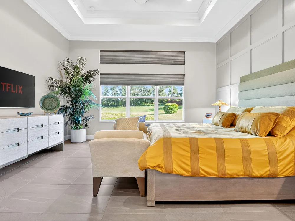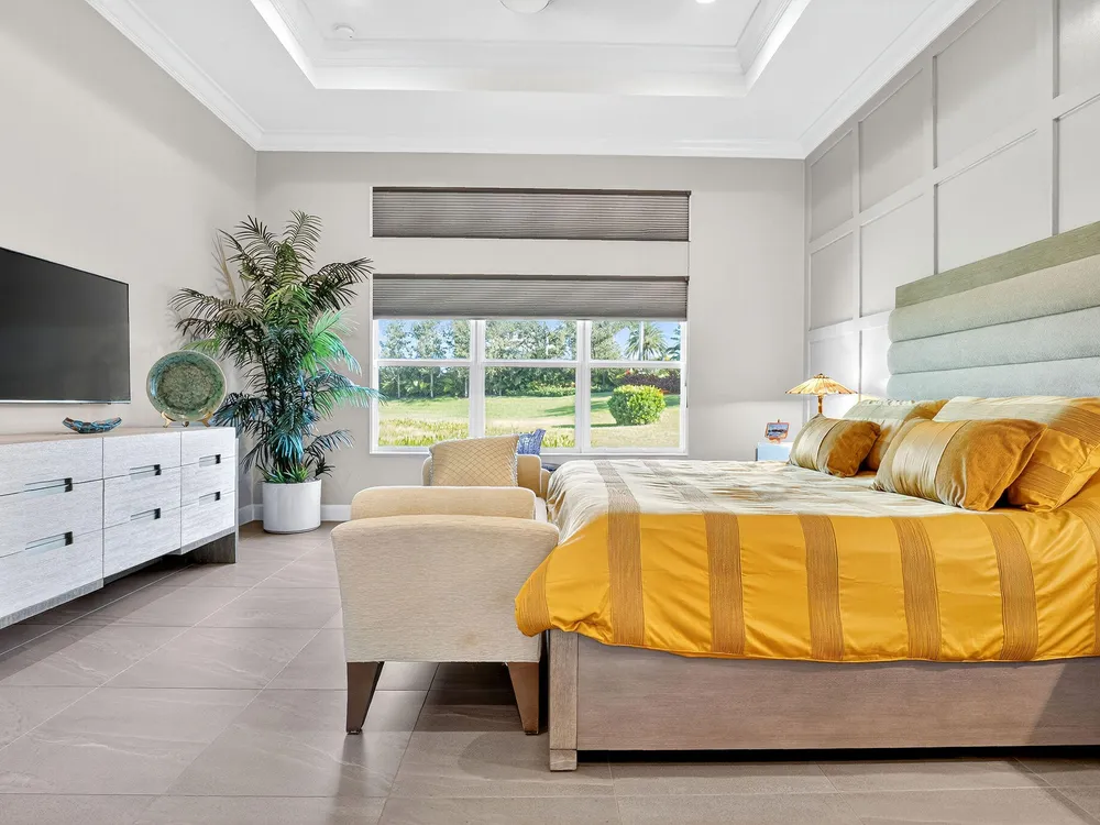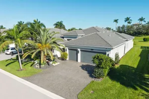 Welcome to this stunning 3-bedroom, 3-1/2 bath 3 car gar. waterfront home rolling greens private view. property boasts professionally landscaped front and features a modern open floor plan with high ceilings and 24x24 upgraded porcelain tile. The kitchen is equipped with upgraded white cabinets, soft close doors and SS appliances and quartz countertops, customized shades throughout with impact glass windows and doors. Extended private patio overlooking the water. This home is located in a upscale community with resort-style amenities, including 3 pools, tennis, 11 pickleball courts and a 40000 sf clubhouse in a resort style setting. Enjoy camp like living in this active adult community with full service restaurant, clubs, 500 seat social hall!! Part furn or unfurnished