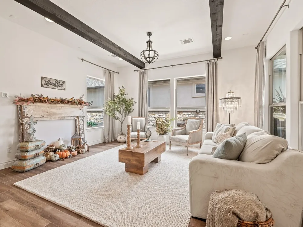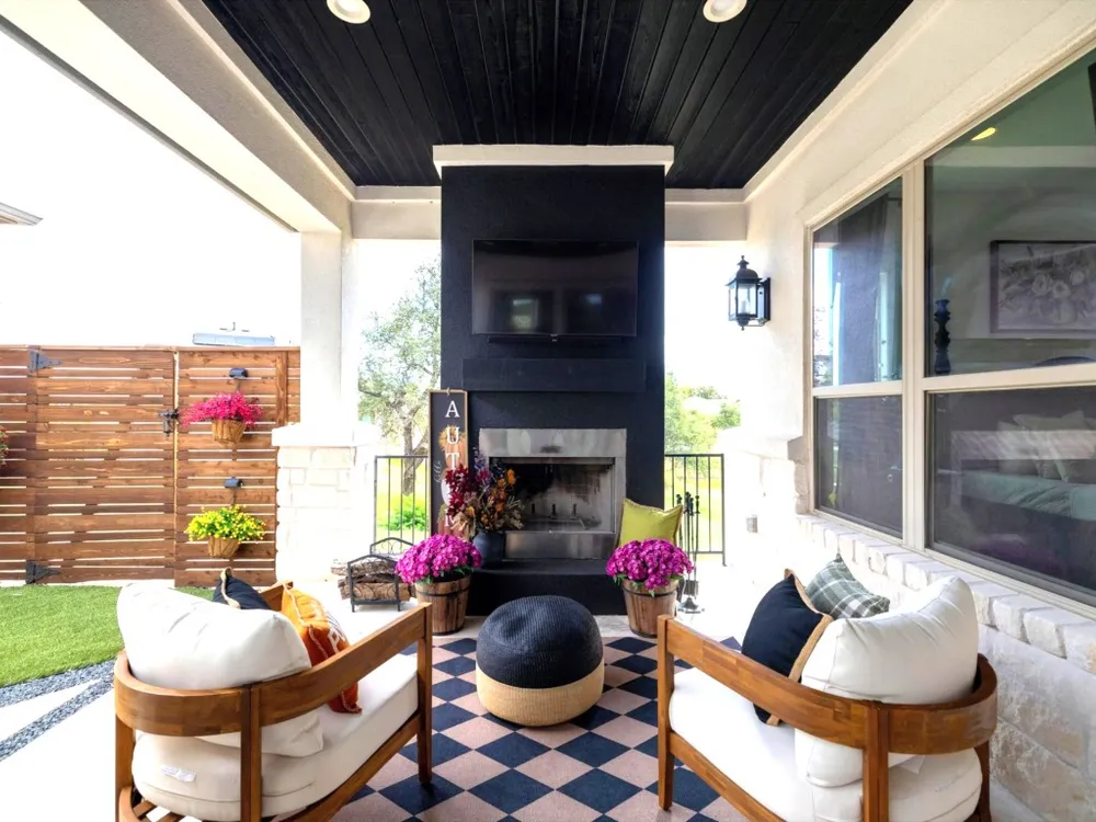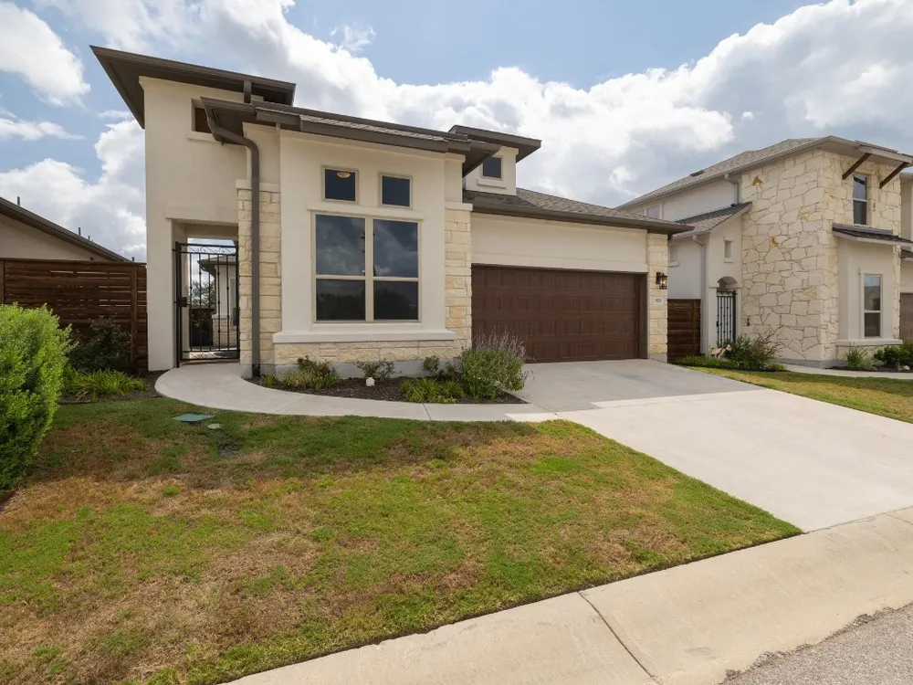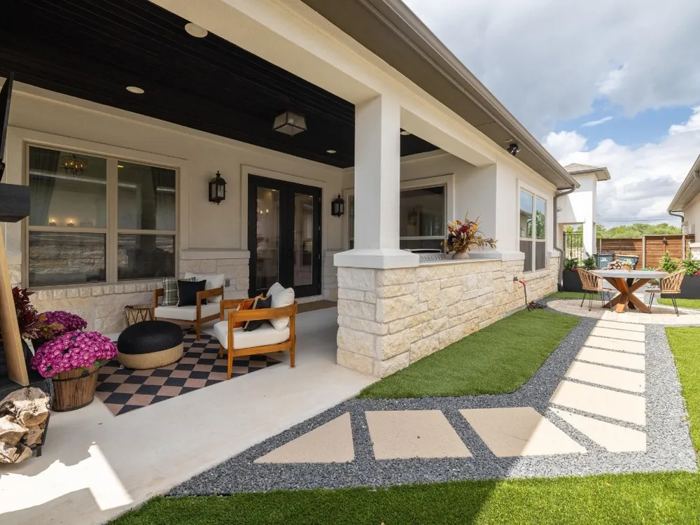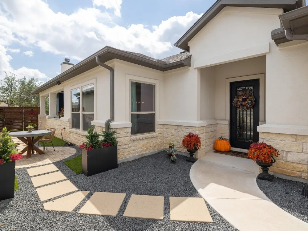 Welcome to a true lock-and-leave luxury garden home, a space designed for those who prefer effortless living without sacrificing privacy or style. This residence offers low-maintenance ease with tranquility and seclusion. Enter through the private gate into a courtyard that runs the length of the home, offering both privacy and a carefree lifestyle. The back half becomes your personal retreat, with an uncovered patio, astro turf, and a covered outdoor kitchen complete with cozy fireplace, gas lantern lighting, tongue-and-groove ceiling, and space for game-day gatherings or intimate evenings. Inside, elegance greets you with an iron front door and wooden beams adorning the ceiling and stone accents throughout. Flooded with natural light, the open layout exudes warmth and sophistication. The kitchen is a showpiece flanked by gas lanterns and a custom hood, with a full backsplash wall tying into the stone-clad dining area. Dimmable lighting throughout allows you to curate the perfect ambiance, whether winding down after travel, enjoying a quiet night, or entertaining. Additional thoughtful touches include a flexible office/media room and cohesive stone details throughout. The primary suite is a retreat of its own, with a frameless glass shower, soaking tub, and dimmable lighting that turns everyday routines into spa-like experiences. An expansive walk-in closet offers direct access to the laundry room, making functionality seamless. The secondary bedroom is equally impressive, boasting 12-foot ceilings, abundant light. Best of all, there’s nothing to do outside. No mowing. No maintenance. Just more time to enjoy the community fitness studio, curated activities, and nearby conveniences like H-E-B, Sprouts, CVS, and just 13 minutes to Georgetown Square. This villa is more than a home, it’s an invitation to live differently. To slow down, savor, and enjoy life’s best moments.