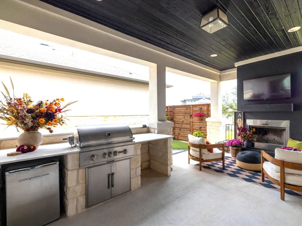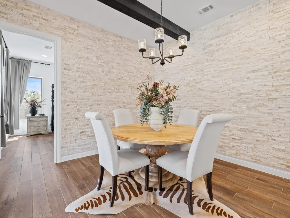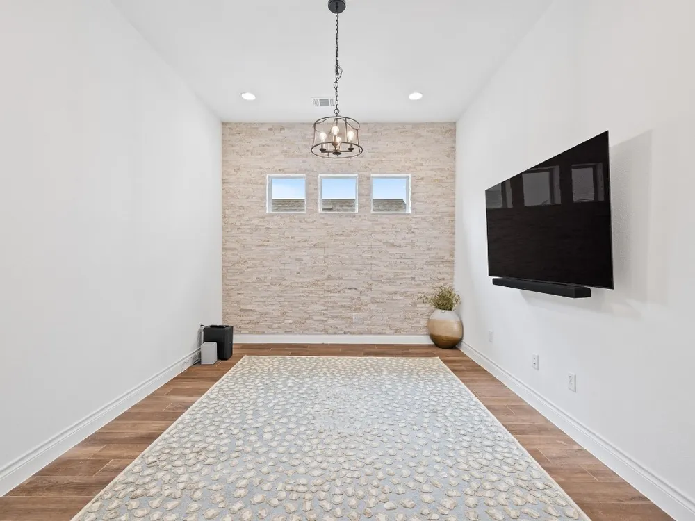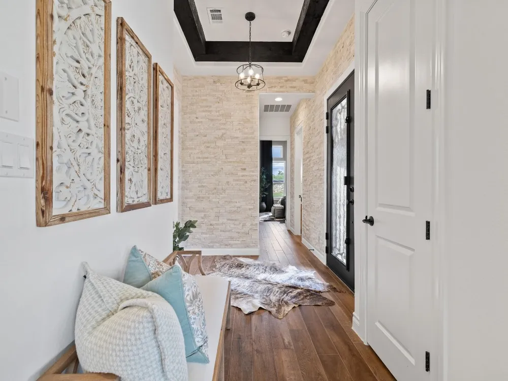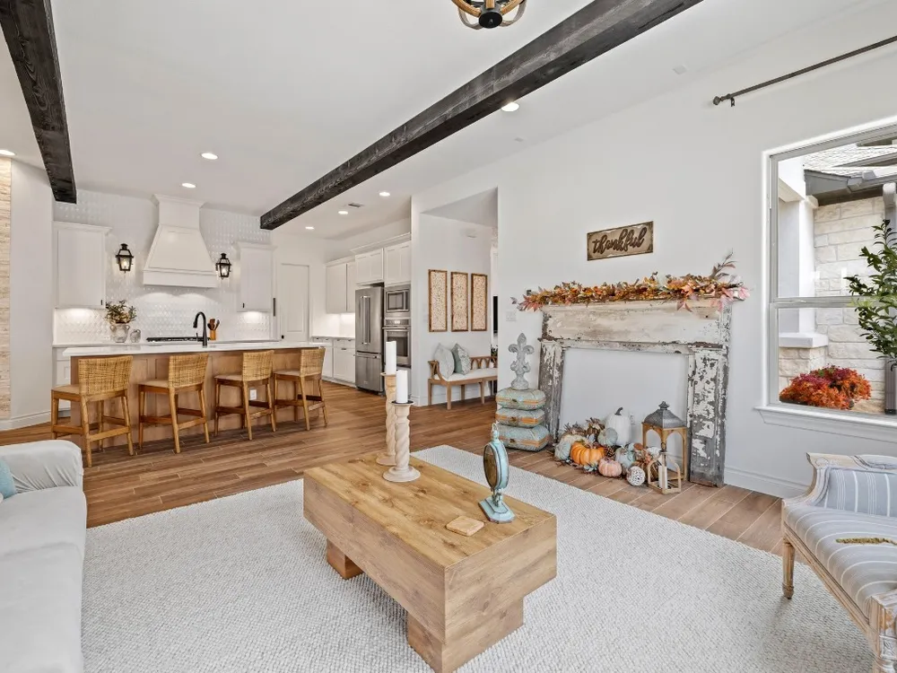 Welcome to a true lock-and-leave luxury garden home, a space designed for those who prefer effortless living without sacrificing privacy or style. This residence offers low-maintenance ease with tranquility and seclusion. Enter through the private gate into a courtyard that runs the length of the home, offering both privacy and a carefree lifestyle. The back half becomes your personal retreat, with an uncovered patio, astro turf, and a covered outdoor kitchen complete with cozy fireplace, gas lantern lighting, tongue-and-groove ceiling, and space for game-day gatherings or intimate evenings. Inside, elegance greets you with an iron front door and wooden beams adorning the ceiling and stone accents throughout. Flooded with natural light, the open layout exudes warmth and sophistication. The kitchen is a showpiece flanked by gas lanterns and a custom hood, with a full backsplash wall tying into the stone-clad dining area. Dimmable lighting throughout allows you to curate the perfect ambiance, whether winding down after travel, enjoying a quiet night, or entertaining. Additional thoughtful touches include a flexible office/media room and cohesive stone details throughout. The primary suite is a retreat of its own, with a frameless glass shower, soaking tub, and dimmable lighting that turns everyday routines into spa-like experiences. An expansive walk-in closet offers direct access to the laundry room, making functionality seamless. The secondary bedroom is equally impressive, boasting 12-foot ceilings, abundant light. Best of all, there’s nothing to do outside. No mowing. No maintenance. Just more time to enjoy the community fitness studio, curated activities, and nearby conveniences like H-E-B, Sprouts, CVS, and just 13 minutes to Georgetown Square. This villa is more than a home, it’s an invitation to live differently. To slow down, savor, and enjoy life’s best moments.