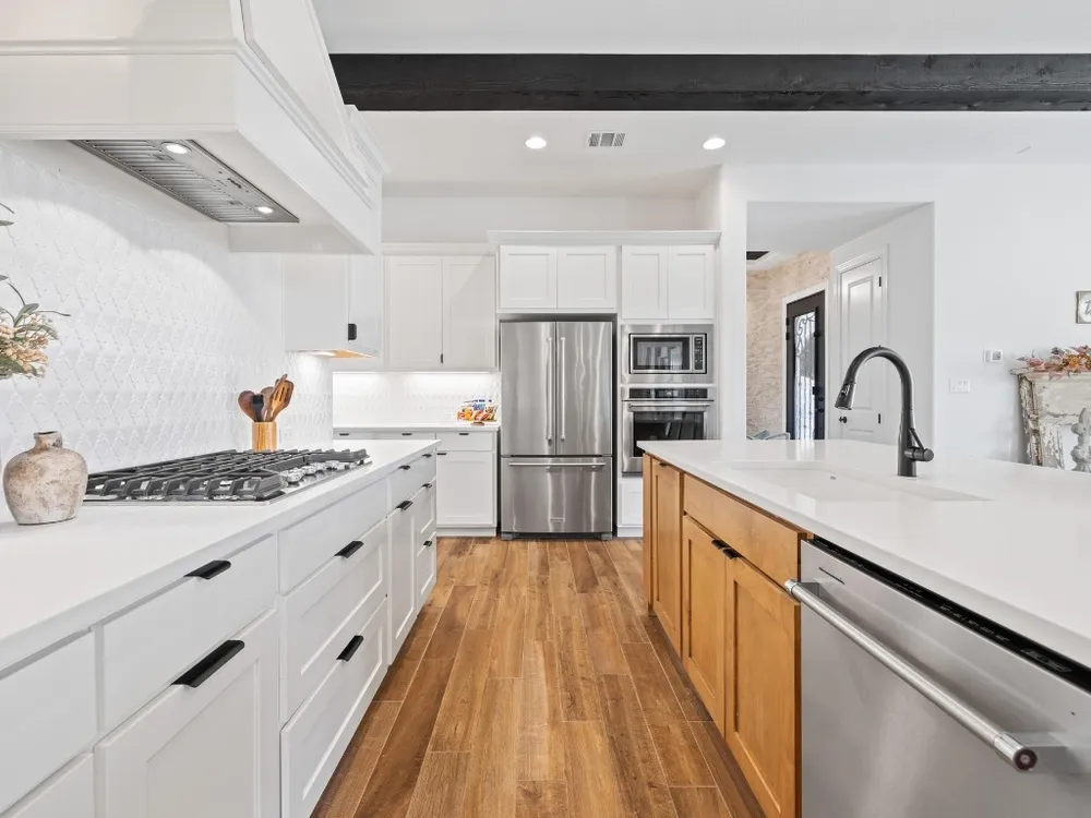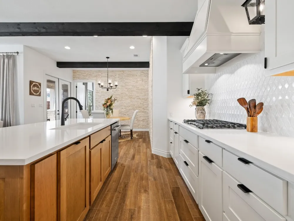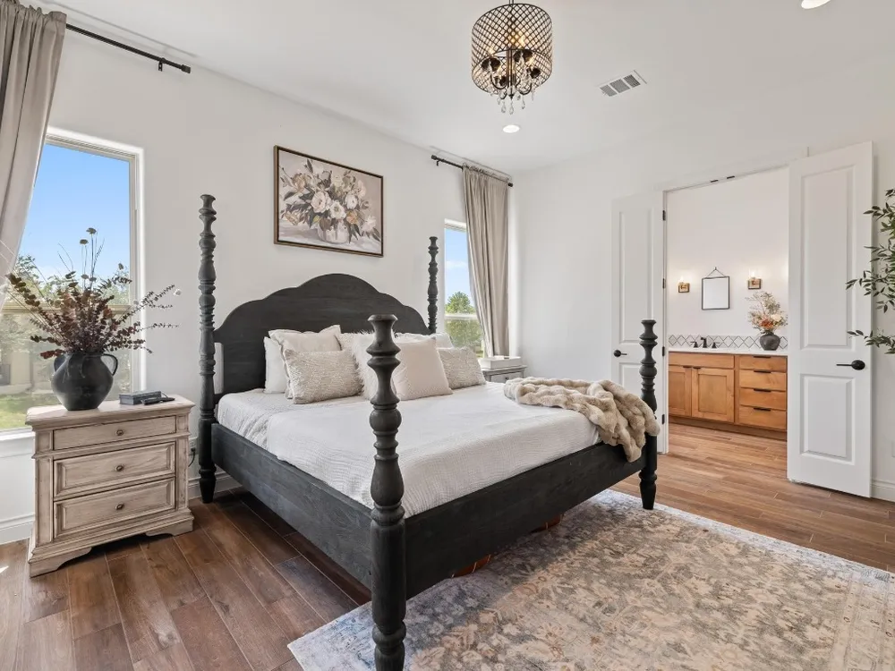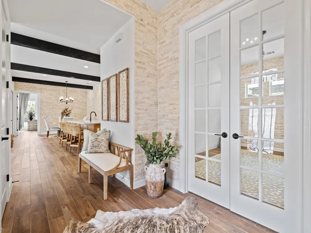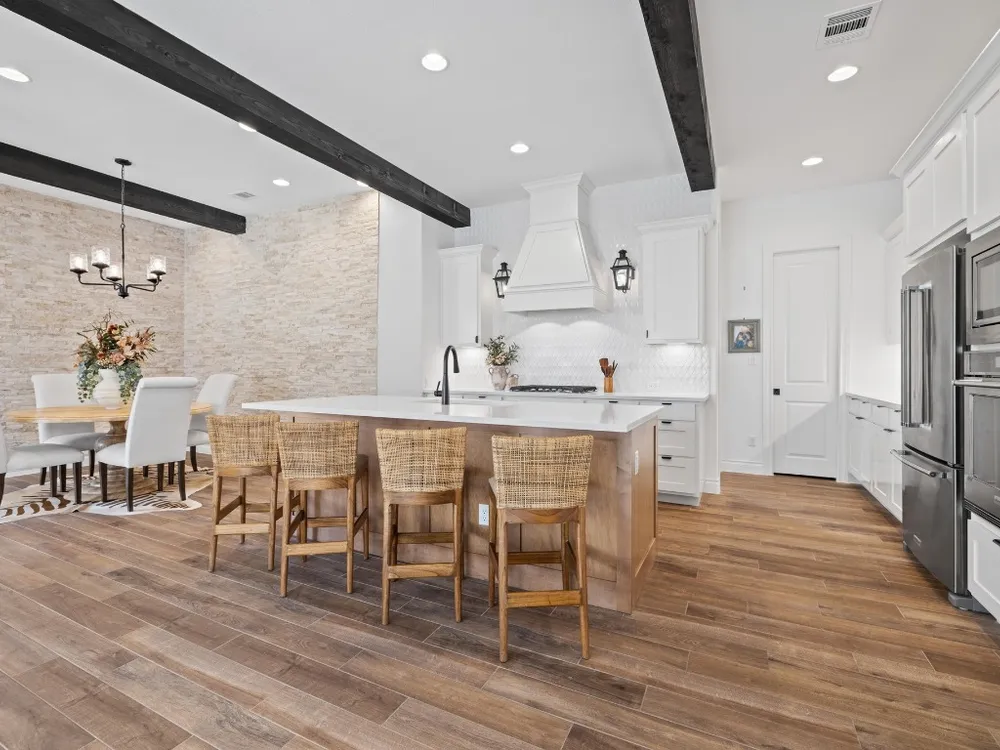 - Beamed Ceilings, Breakfast Bar, Open Beams/Beamed Ceilings, Chandelier, Double Vanity, Eat-in Kitchen, French Door(s)/Atrium Door(s), High Ceilings, Kitchen Island, Main Level Primary, NoInteriorSteps, Open Floorplan, Pantry, Recessed Lighting