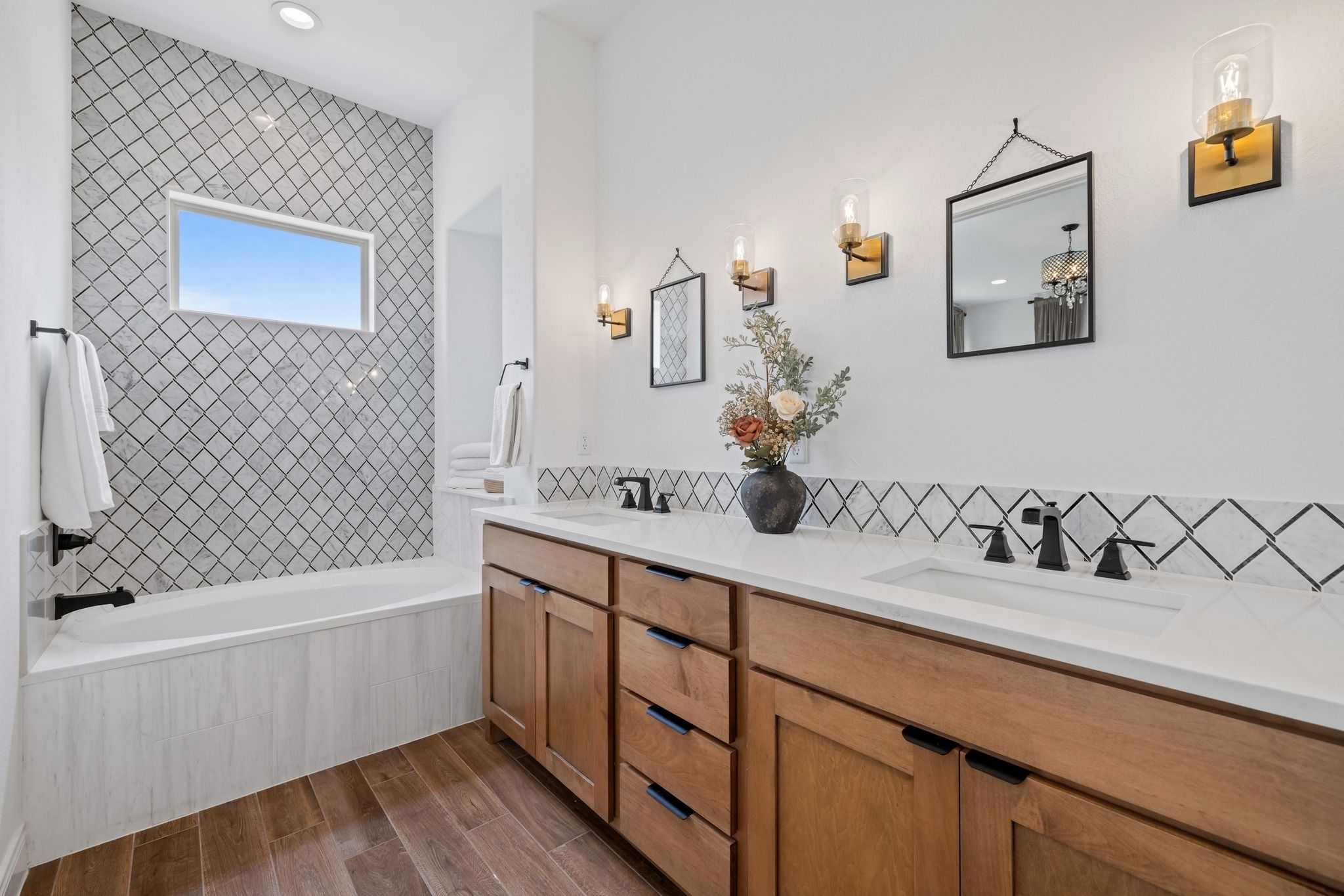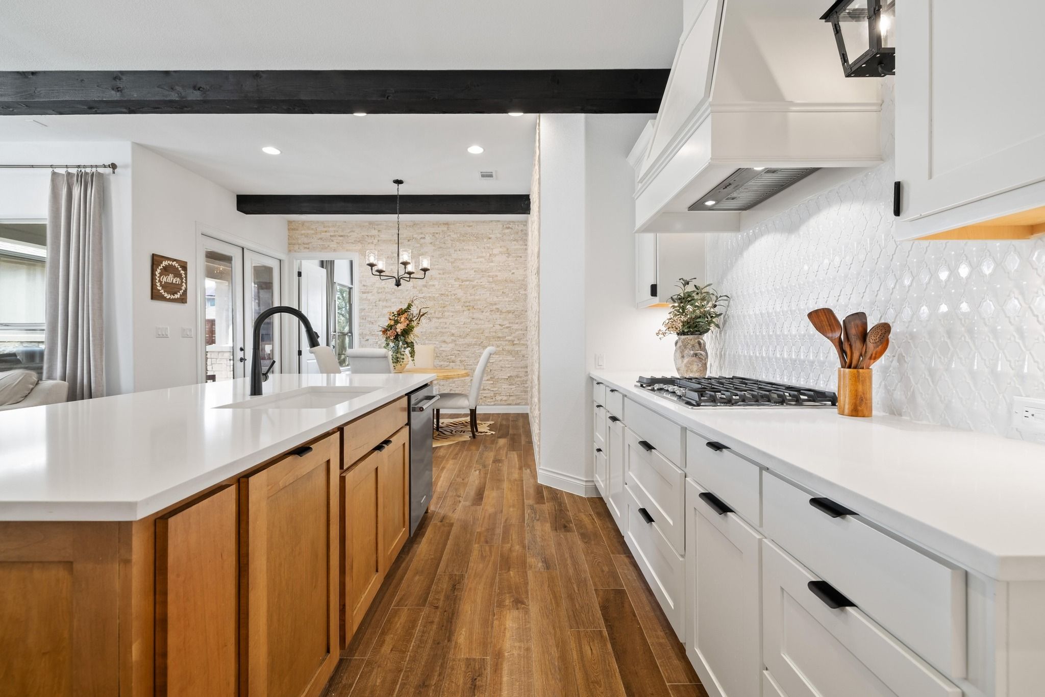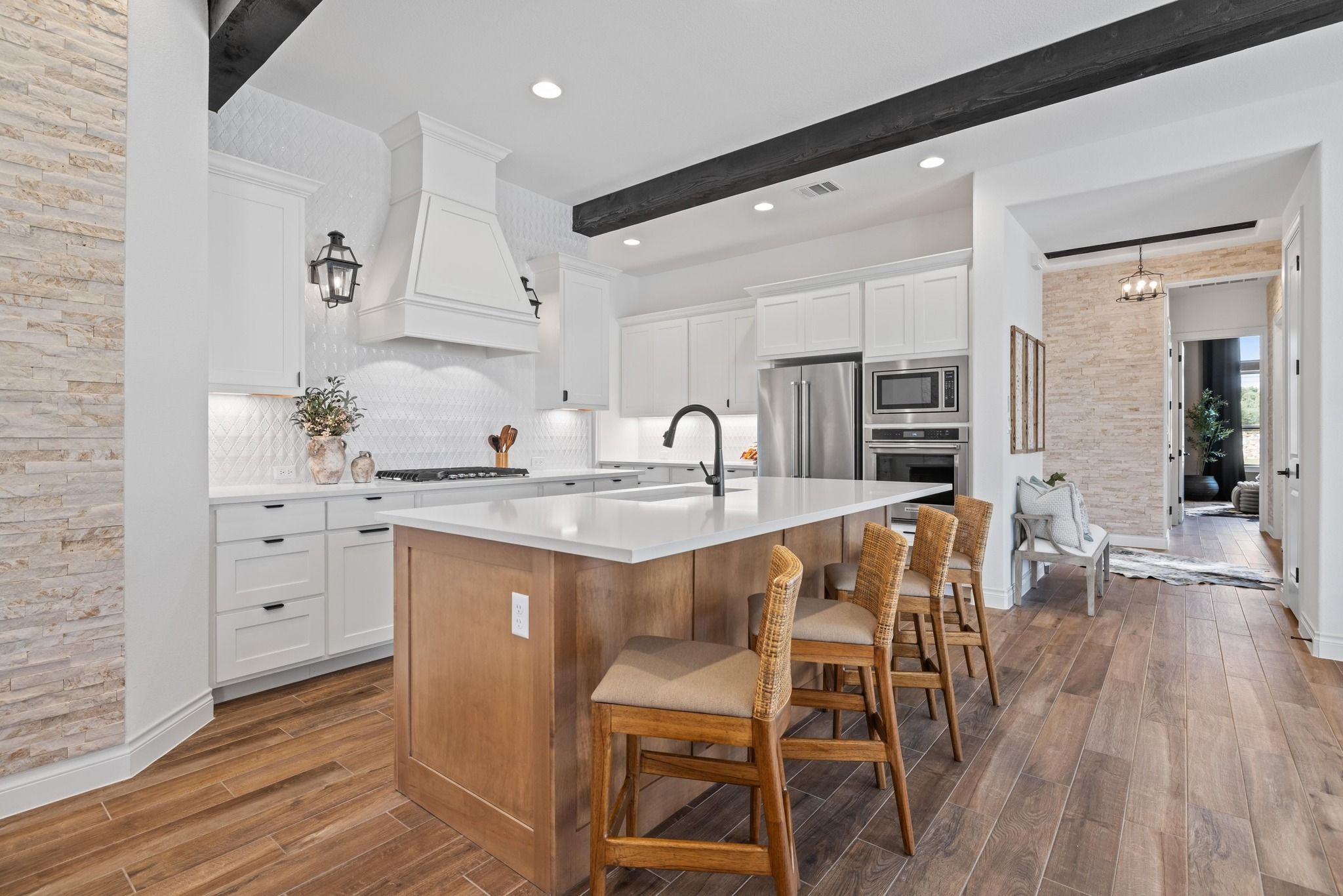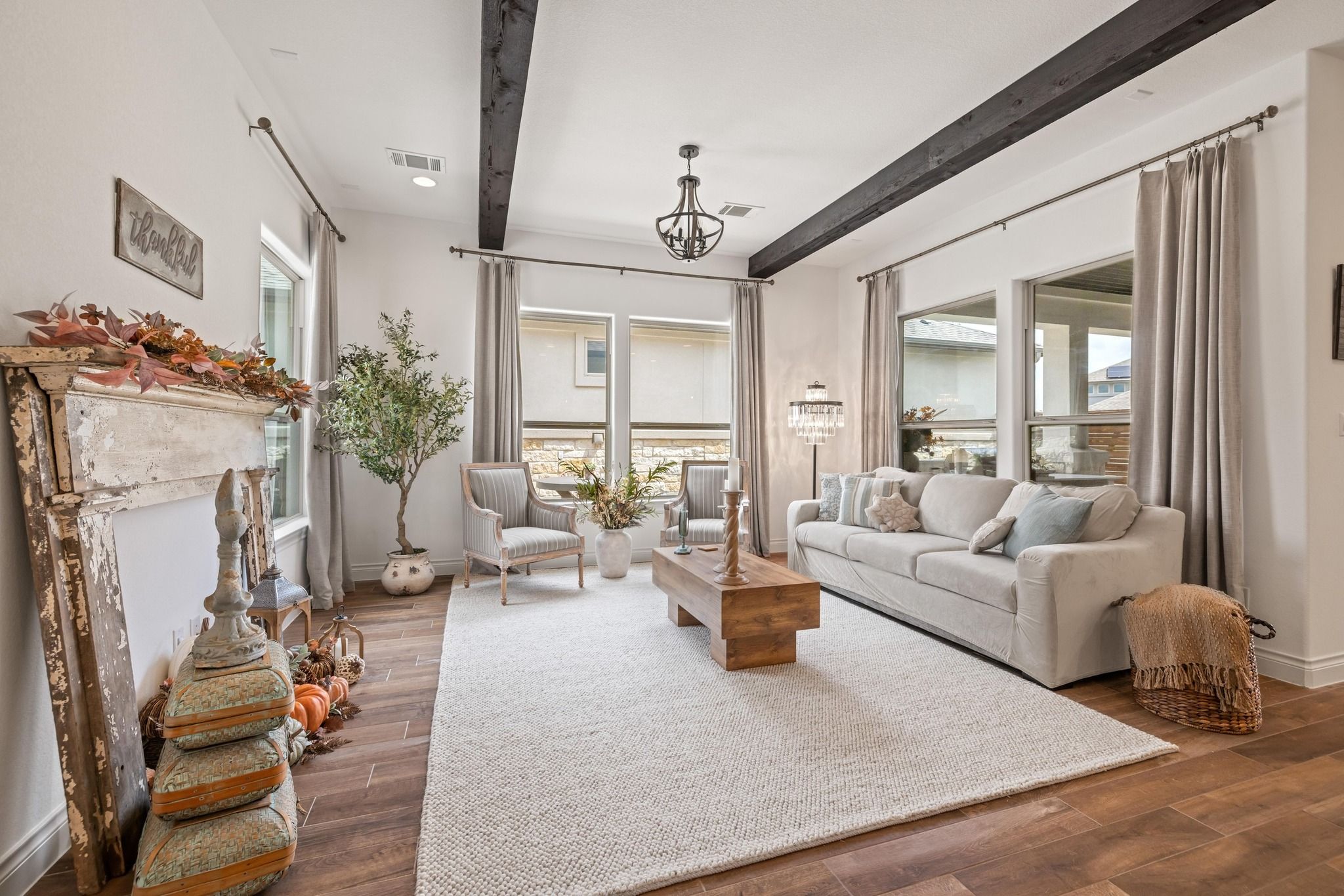 Welcome to a true lock-and-leave luxury garden home, a space designed for those who prefer effortless living without sacrificing privacy or style. This residence offers low-maintenance ease with tranquility and seclusion. Enter through the private gate into a courtyard that runs the length of the home, offering both privacy and a carefree lifestyle. The back half becomes your personal retreat, with an uncovered patio, astro turf, and a covered outdoor kitchen complete with cozy fireplace, gas lantern lighting, tongue-and-groove ceiling, and space for game-day gatherings or intimate evenings. Inside, elegance greets you with an iron front door and wooden beams adorning the ceiling and stone accents throughout. Flooded with natural light, the open layout exudes warmth and sophistication. The kitchen is a showpiece flanked by gas lanterns and a custom hood, with a full backsplash wall tying into the stone-clad dining area. Dimmable lighting throughout allows you to curate the perfect ambiance, whether winding down after travel, enjoying a quiet night, or entertaining. Additional thoughtful touches include a flexible office/media room and cohesive stone details throughout. The primary suite is a retreat of its own, with a frameless glass shower, soaking tub, and dimmable lighting that turns everyday routines into spa-like experiences. An expansive walk-in closet offers direct access to the laundry room, making functionality seamless. The secondary bedroom is equally impressive, boasting 12-foot ceilings, abundant light. Best of all, there’s nothing to do outside. No mowing. No maintenance. Just more time to enjoy the community fitness studio, curated activities, and nearby conveniences like H-E-B, Sprouts, CVS, and just 13 minutes to Georgetown Square. This villa is more than a home, it’s an invitation to live differently. To slow down, savor, and enjoy life’s best moments.