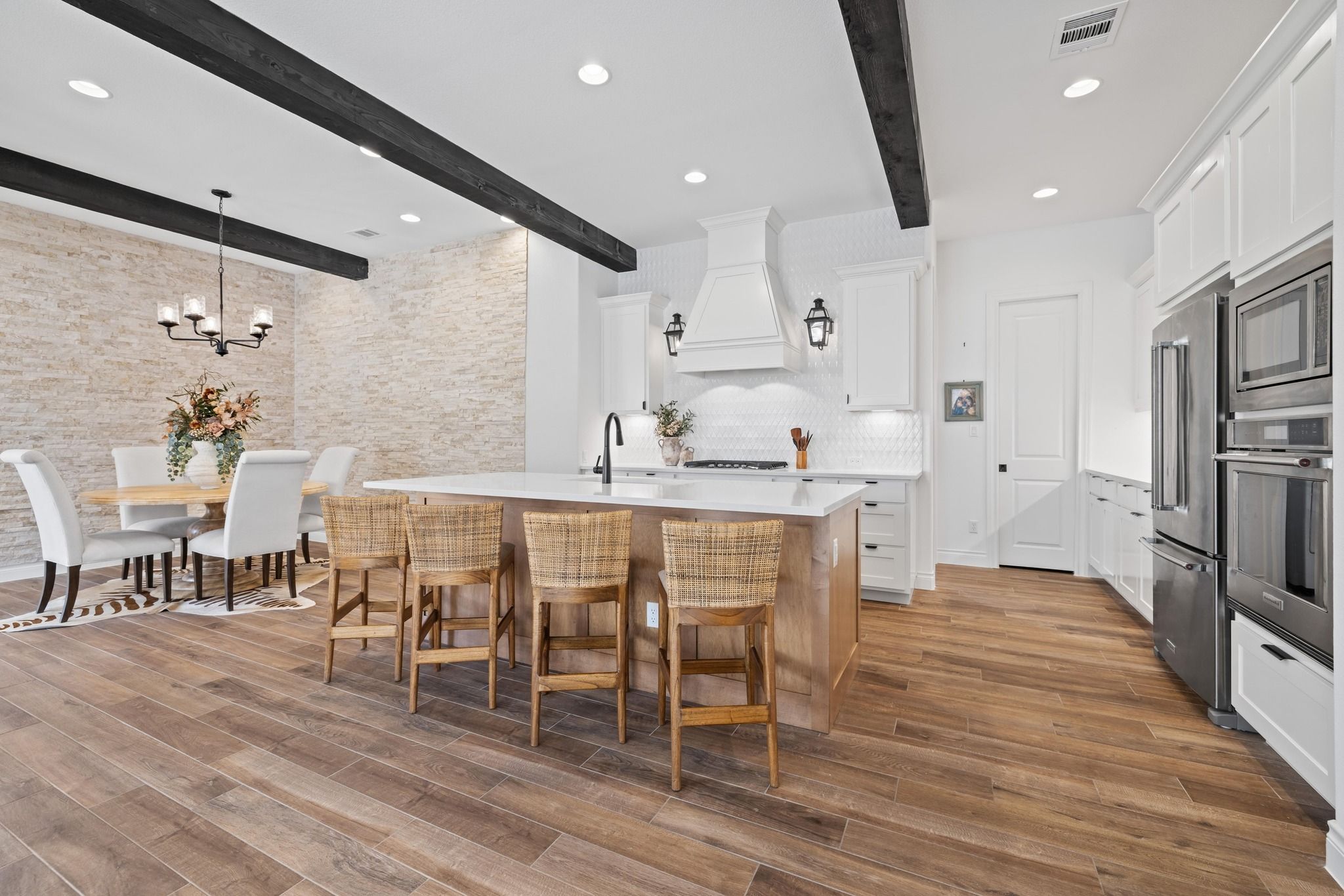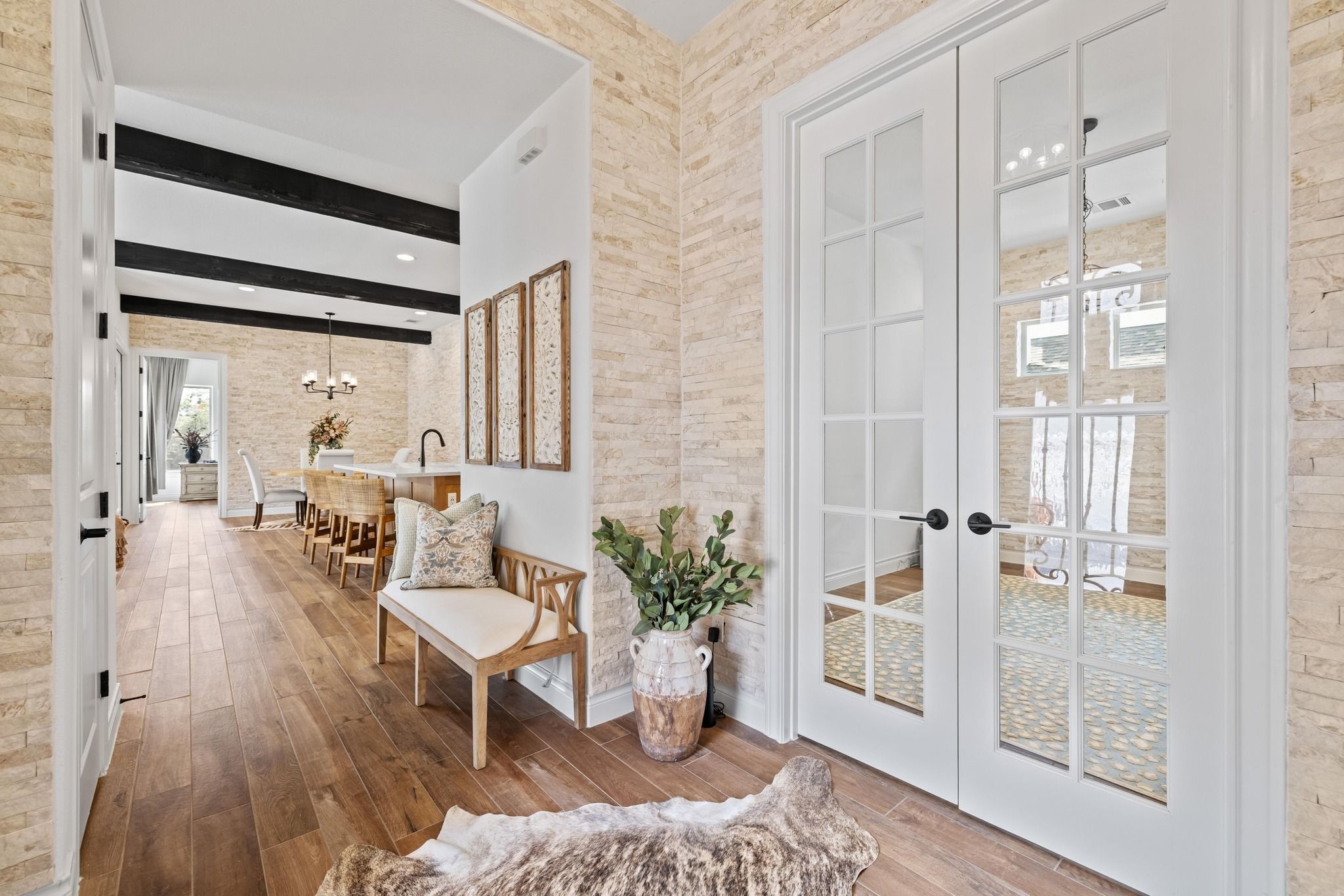 - Beamed Ceilings, Breakfast Bar, Open Beams/Beamed Ceilings, Chandelier, Double Vanity, Eat-in Kitchen, French Door(s)/Atrium Door(s), High Ceilings, Kitchen Island, Main Level Primary, NoInteriorSteps, Open Floorplan, Pantry, Recessed Lighting