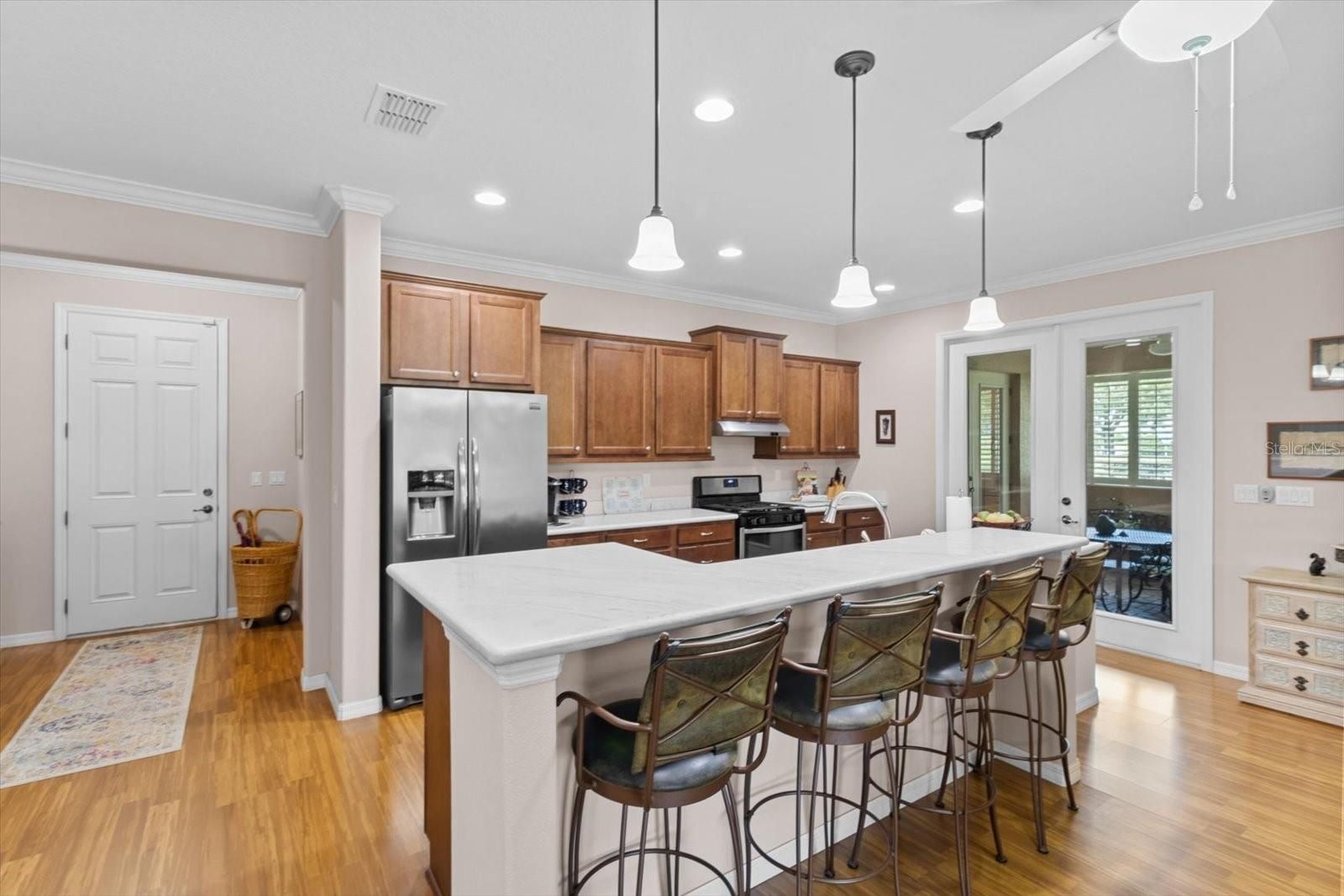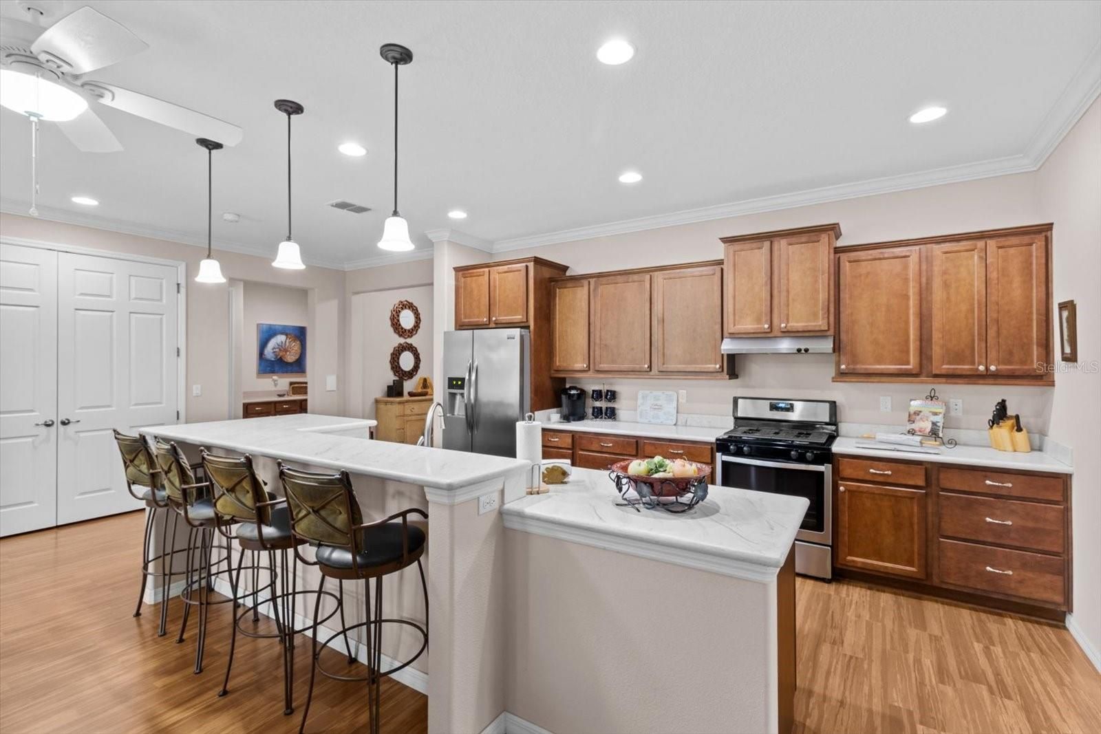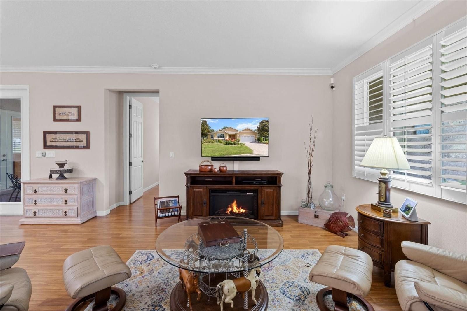 GOLF COURSE LIVING AT ITS FINEST! Located on the 18th tee box of the Tortoise and the Hare course in the highly sought-after Windsor East neighborhood of On Top of the World. This sophisticated Westminster (predecessor to the Willem) model offers elegance, space, and privacy. Situated on a premium corner lot with no neighbor to the left and a beautifully landscaped green space, this home boasts striking curb appeal with stone-accented exterior, full irrigation, and lush sod. Step inside to an open concept layout that's both stylish and functional. This 3-bedroom, 3-bath home features a smart 3-way split floorplan, with two ensuite bedrooms offering walk-in closets, ideal for guests or live-in family members. A spacious flex room provides options for a home office, library, or craft room. The gourmet kitchen is a chef's dream, with stainless steel appliances including a built-in oven and microwave, gas cooktop, dishwasher, and refrigerator. Staggered wood cabinets, solid surface countertops, a large pantry, and golf course views right from the kitchen make this space a true standout. Laminate flooring and crown molding run throughout the home, and classic plantation shutter blinds add timeless style. The private owner's entrance features a built-in drop zone, perfect for a coffee station or bar, leading through a spacious laundry room with abundant storage to the primary suite. Enjoy morning coffee in the enclosed courtyard just off the kitchen and flex room or unwind on the screened lanai with comfortable northern exposure and views of the fairway. Additional highlights include a new HVAC system installed in 2024, central vacuum system, and an oversized 2.5 car garage (nearly 700 sq ft) that easily accommodates large vehicles, a golf cart, or extra storage. Furniture is for separate purchase. Windsor East offers an active social calendar and a welcoming community- don't miss your opportunity to enjoy the lifestyle you've been dreaming of!