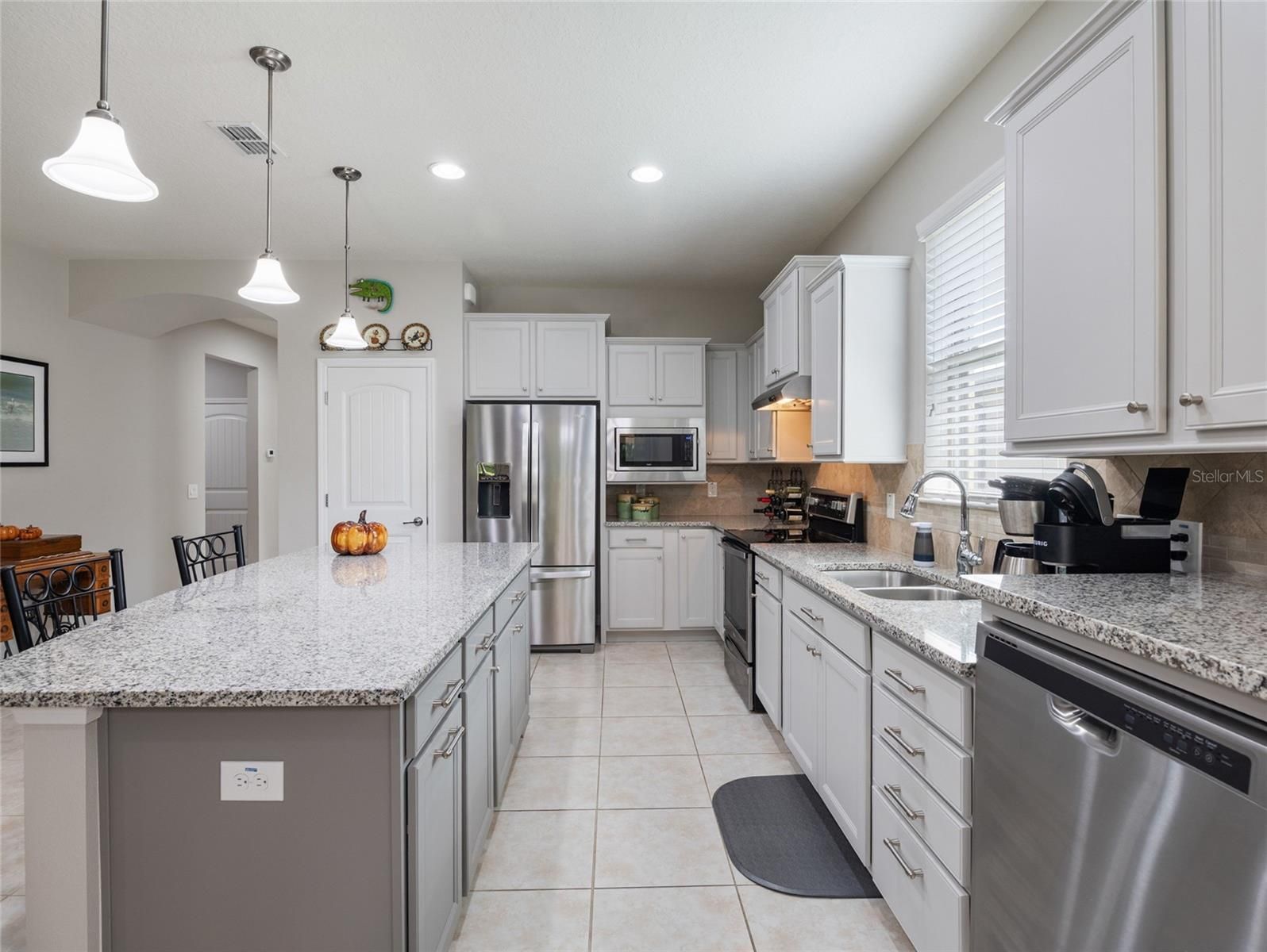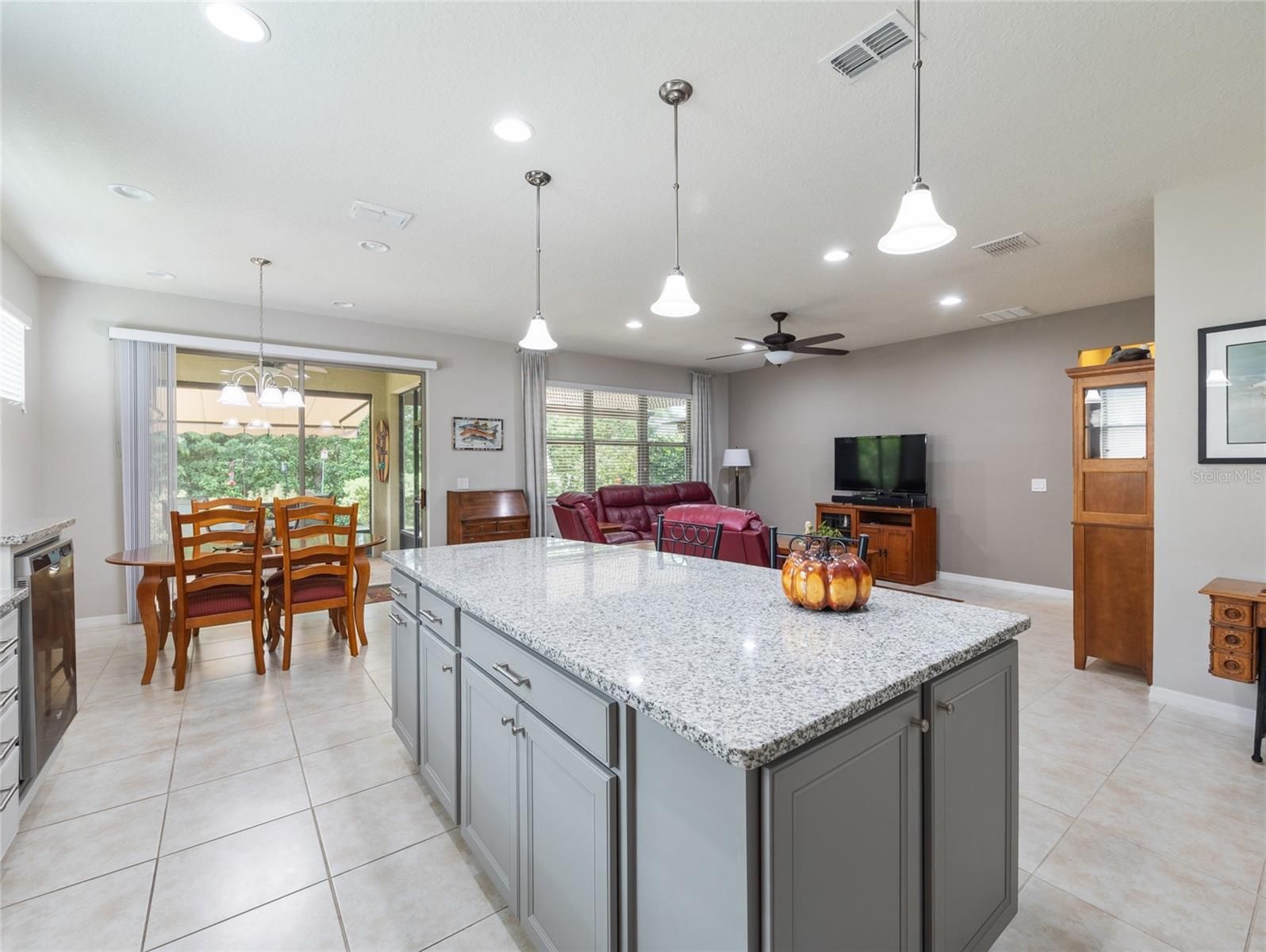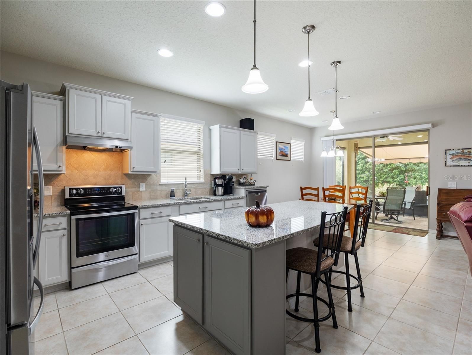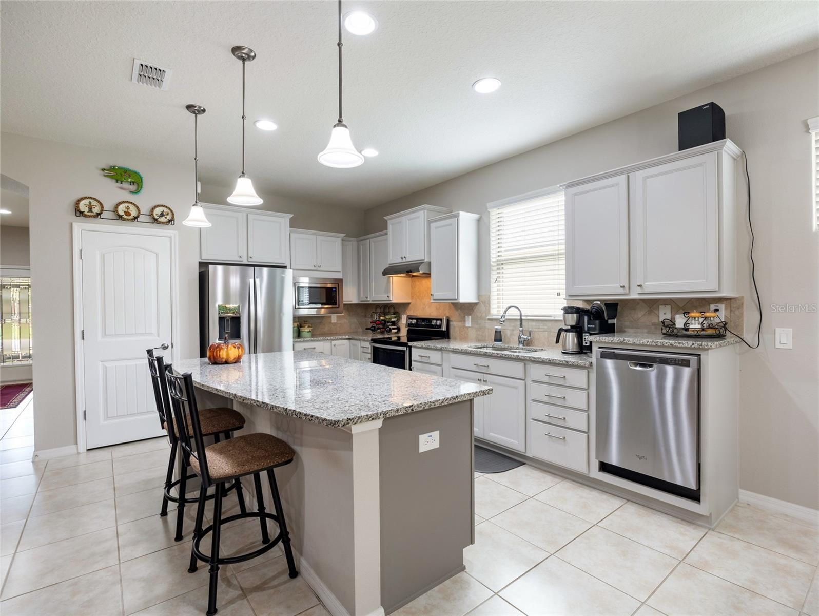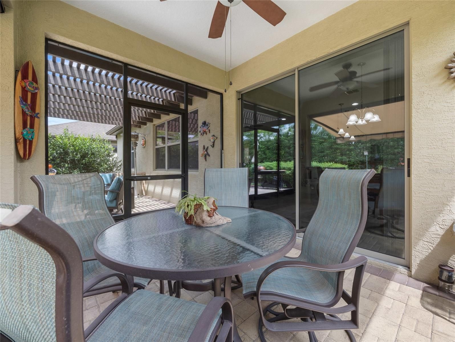 Welcome to this beautifully maintained Abbeyville model in the sought-after 55+ community of Del Webb Stone Creek. This 2-bedroom, 2-bath home with a versatile flex room offers both comfort and style. Tile flooring flows seamlessly throughout the home, complementing the open floor plan. The spacious kitchen is a true centerpiece, featuring a large granite-topped island, perfect for entertaining. Both bathrooms include elegant tiled walk-in showers, while the primary suite boasts a custom closet organizer for maximum storage. Step outside to your private retreat where a screened-in lanai with pavers extends to a paver patio with a charming pergola, creating the perfect outdoor entertainment space. Thoughtful landscaping adds privacy and enhances the serene setting. This move-in ready home combines functionality, style, and a resort-style lifestyle in one of Ocala’s premier active adult communities.