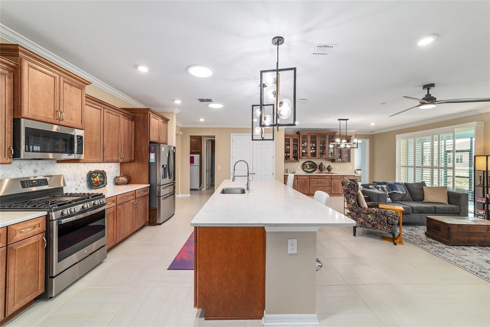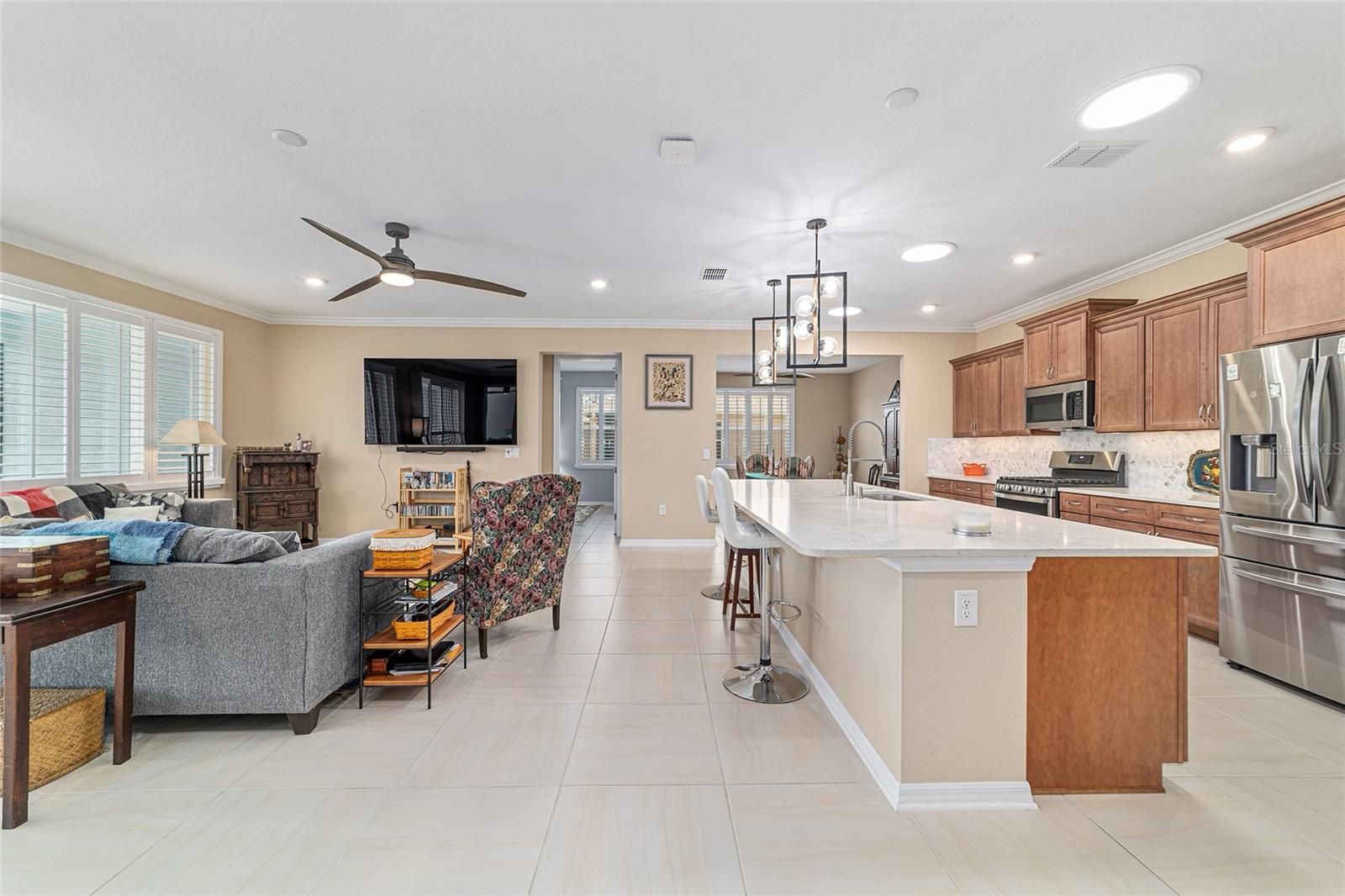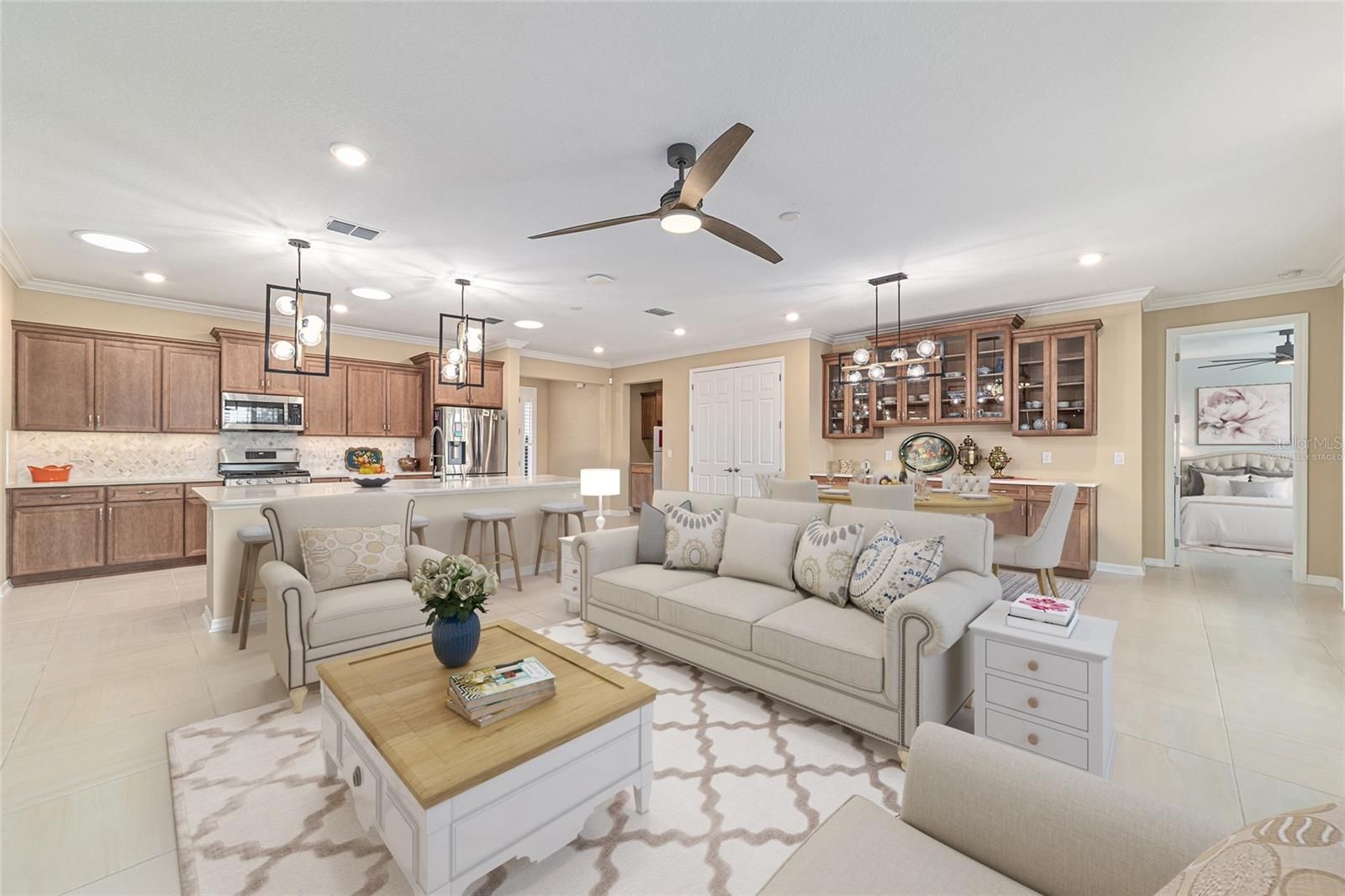 Willem model on Private Lot!! Step into move-in ready comfort and skip the headaches of new construction! Why wait months dealing with construction trucks, contractors parking on your lawn, and the risk of nails in your tires when you can own this almost-new Willem model that already has all the essential upgrades completed? This thoughtfully enhanced home includes wood shutters, fans, gutters, a water softener, fenced yard, epoxy garage floors, added cabinetry in the laundry room, and a stunning custom built-in feature wall in the living room - all done and ready to enjoy, with no need to chase contractors or gather estimates. The popular Willem floor plan offers three distinct private wings. The spacious primary suite features a large ensuite bathroom with dual vanities and an oversized walk-in shower. A second bedroom enjoys its own private ensuite, while the third wing includes a bedroom, bathroom, and versatile flex room- perfect for an in-law suite, guest retreat, or private office. The home showcases tile flooring throughout with a seamless, single-level surface and no transition strips. Upgraded light fixtures, 8 ft doors, and crown molding throughout. The chef's kitchen features upgraded soft-close cabinetry, high-end quartz countertops, and a marble backsplash. The laundry room is equally well appointed with matching cabinets and a large utility sink, and the closets are fitted with custom shelving systems. Enjoy Florida living on the large, screened lanai, plus an extended paver patio in the backyard; ideal for relaxing or entertaining. Set on a premium private lot with no rear neighbors, no neighbor to the left, and no direct front neighbors, this home offers exceptional privacy. A paver driveway adds to the curb appeal. Ideally located on a quiet community loop with no through traffic, the home is nestled between two premier amenities - The Arbors featuring a heated indoor pool, and The Summit, the new recreation center with convention space and a resistance pool. Schedule your showing today to experience this stunning, private Longleaf Ridge home.