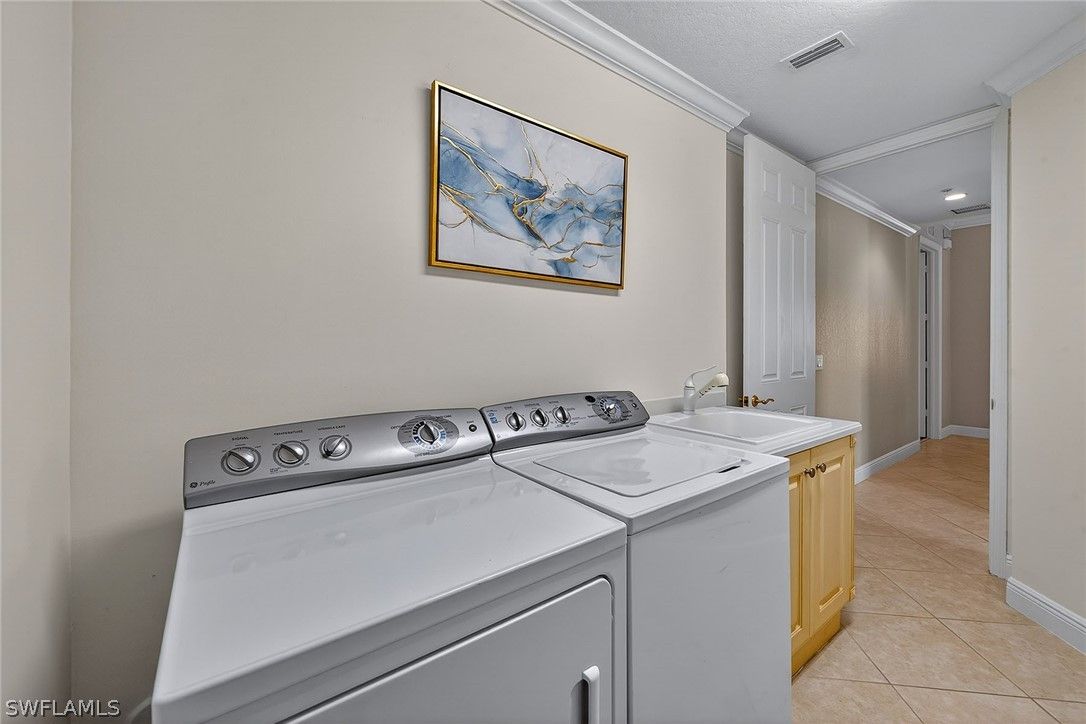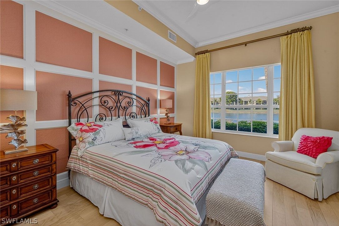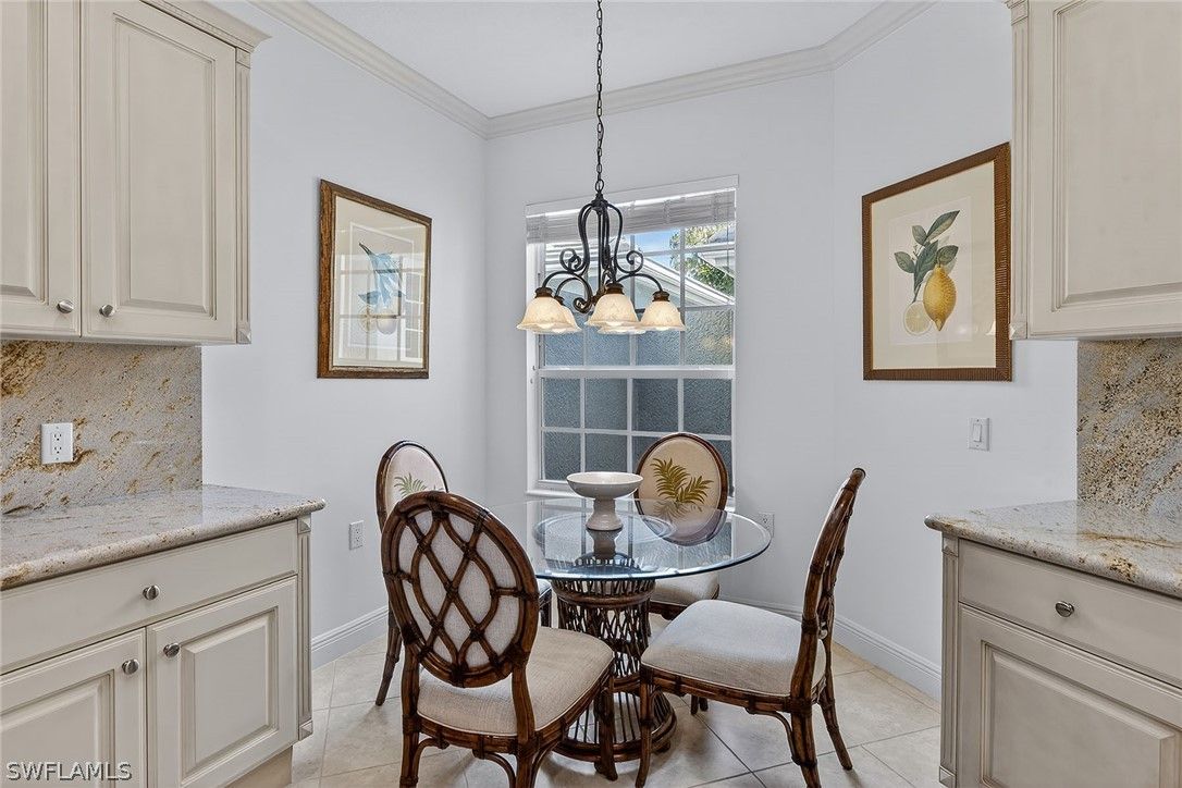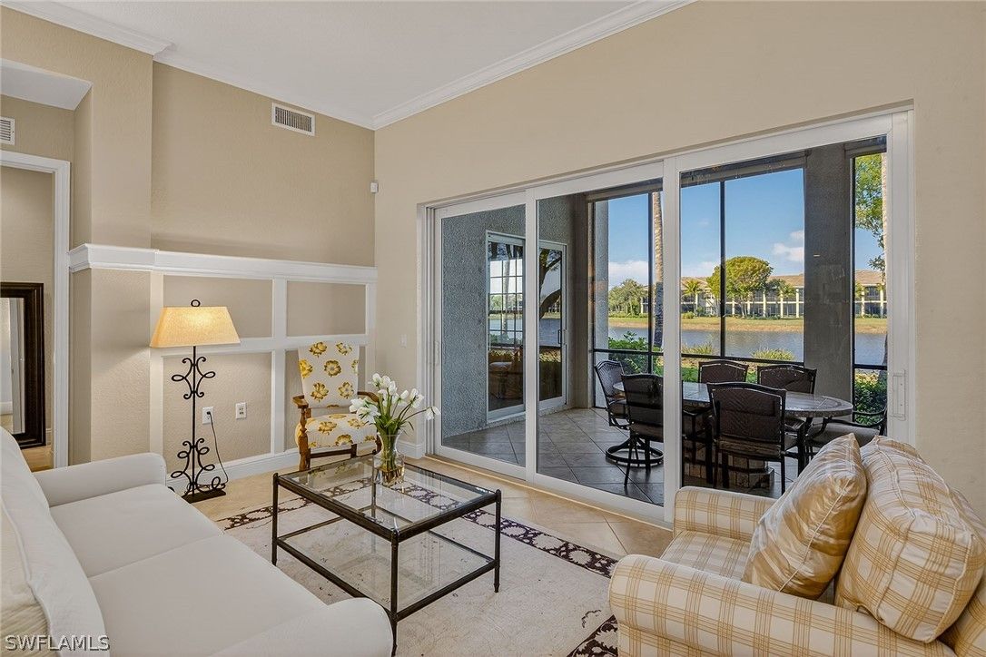 Framed by sweeping long lake views and spectacular western sunsets that paint the evening sky, this beautifully maintained former Laguna model home in Laguna at Fiddler’s Creek offers an exceptional blend of luxury, light, and effortless Naples living. Sold furnished and featuring an attached two-car garage with expansive lake views, this elegant Gulf Bay-built residence captures the very best of Florida living. A charming courtyard entry welcomes you into a bright, thoughtfully designed three-bedroom, three-full bath floor plan offering approximately 2,100 square feet under air. Volume ceilings, crown molding, and walls of sliding glass doors fill the home with sunshine while framing tranquil water vistas throughout. The spacious great room design is ideal for both relaxed daily living and gracious entertaining, seamlessly connecting to an expansive screened lanai overlooking the wide lake and open green space beyond. Perfectly positioned for breathtaking sunset skies, the lanai serves as a true outdoor living room with generous space for lounging, dining, and enjoying the peaceful waterfront setting. The well-appointed kitchen blends style and function with granite countertops, a full granite backsplash, cream cabinetry, GE Profile stainless steel appliances including a natural gas range, bar seating, and a sunlit breakfast area. A separate dining space with elegant architectural detailing provides a refined setting for hosting dinners and gatherings. The owner’s suite is a serene retreat featuring calming lake views, private lanai access, engineered wood flooring, and two walk-in closets with organizers. The spacious en-suite bath includes dual vanities, a soaking tub, a separate glass-enclosed shower, and a private water closet. Two additional guest bedrooms are generously sized and thoughtfully positioned for privacy, each with its own beautifully appointed bath, ideal for guests. Meticulously maintained, the residence includes impact-resistant windows and sliders installed in 2021, a new roof in 2021, new exterior paint, new lanai screens, and a tankless water heater for added efficiency and comfort. This residence, offering first-floor living, a two-car garage, wide lake views, and coveted western sunset exposure, is rarely available. Residents of Laguna enjoy tropical landscaping, tree-lined sidewalks, and a private neighborhood pool, along with access to Fiddler’s Creek’s exceptional amenities, including a clubhouse, resort-style pools, fitness center, spa services, tennis, pickleball, bocce, dining, and a vibrant social calendar. Optional memberships are available for the championship golf course, beach club, and marina. Ideally located just minutes from Marco Island’s white-sand beaches, downtown Naples, dining, shopping, and the executive airport.