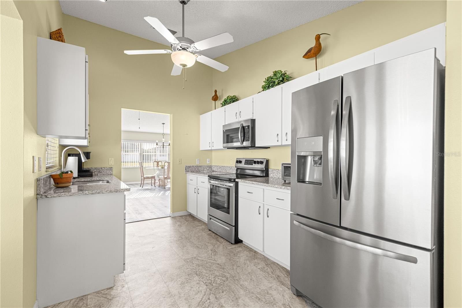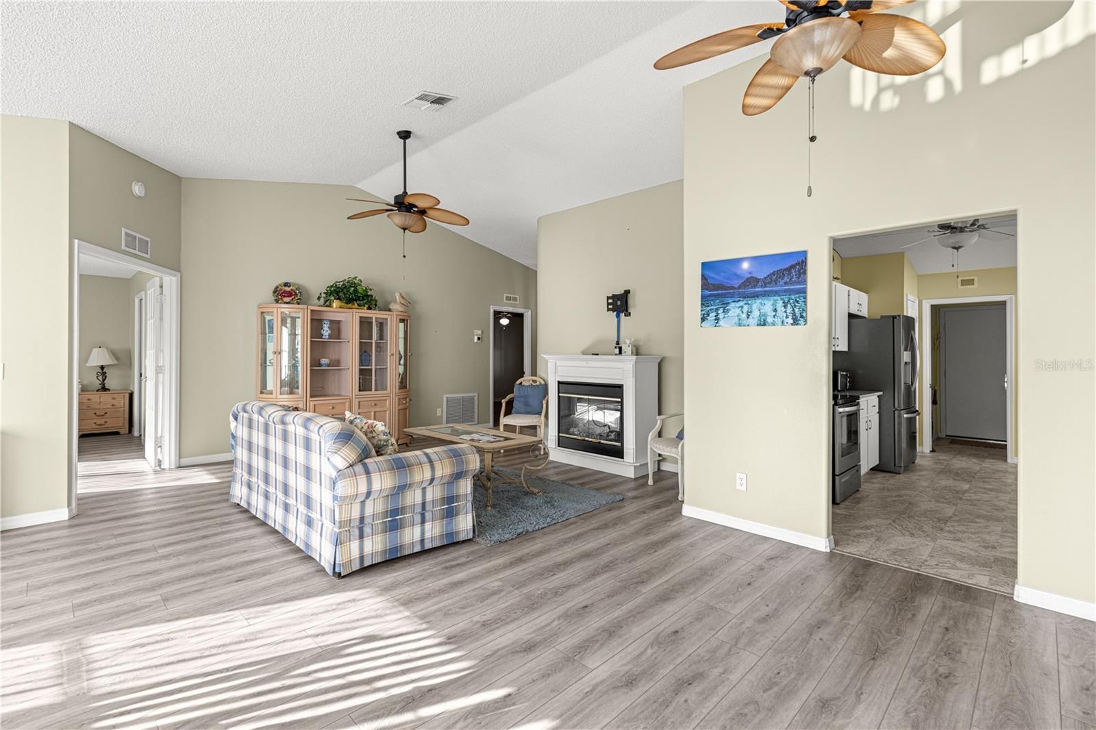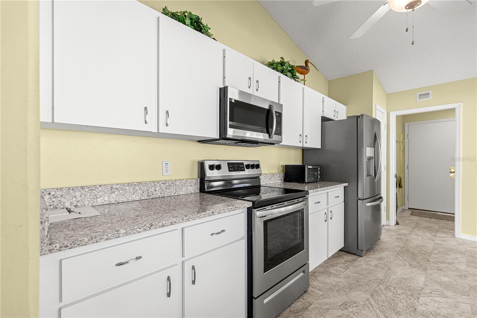 - Attic Ventilator, Cathedral Ceiling(s), Ceiling Fan(s), Eat-in Kitchen, Living/Dining Room, Open Floorplan, Main Level Primary, Solid-Wood Cabinets, Split Bedrooms, Stone Counters, Thermostat, Walk-In Closet(s), Window Treatments