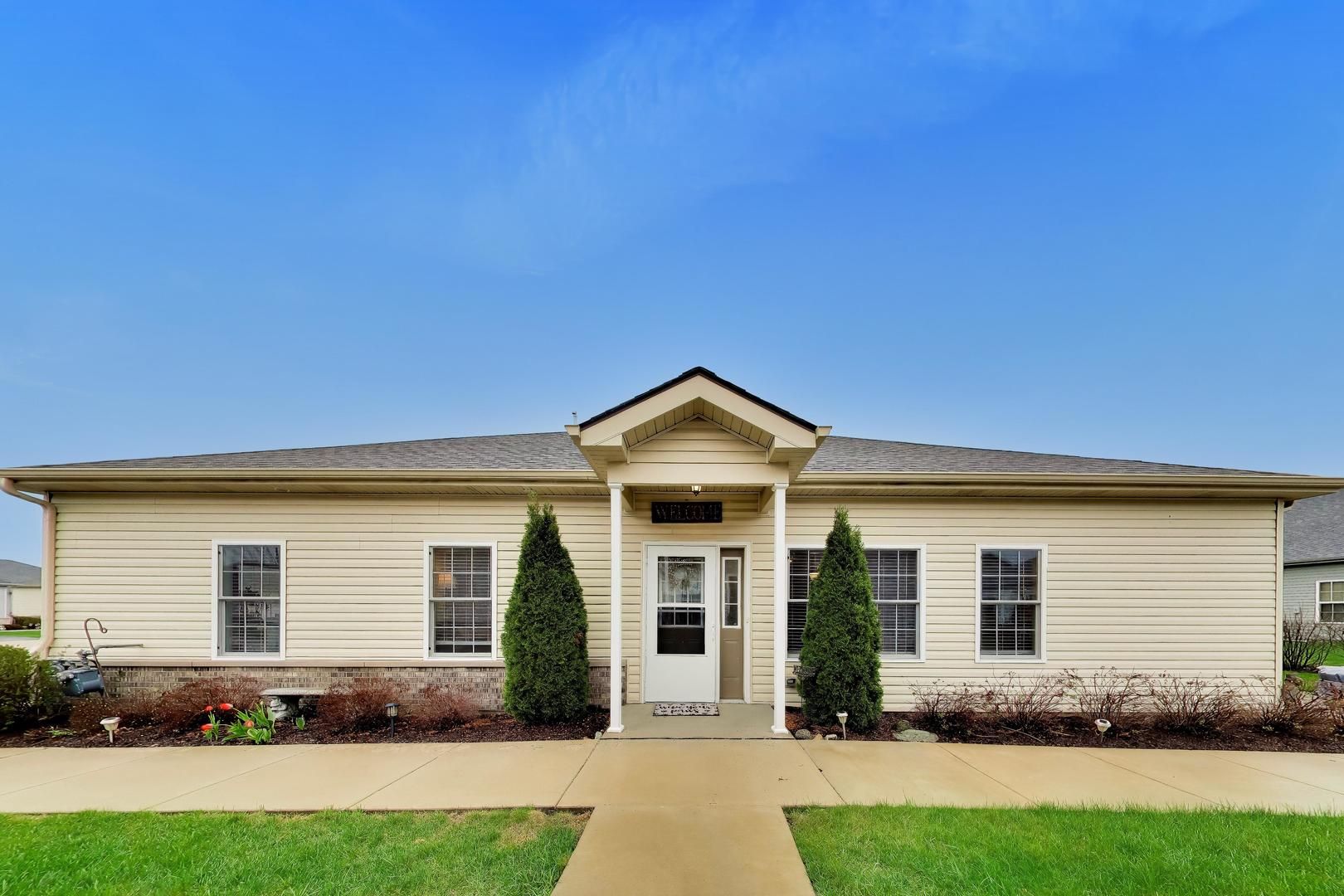 Welcome to this stunning home in the highly sought after Patriot Estates 55+ community, where comfort, style, and convenience come together beautifully. This home is practically brand new and still carries that fresh, just built feel. If you have been waiting for the perfect opportunity, this is it. From the appliances to the upgrades, blinds, and lighting, every detail has been handled so you can move right in and start enjoying your new home without the extra time, cost, or hassle. The kitchen features stainless steel appliances, gorgeous soft close white cabinetry, and the added pleasure of not one but two lazy susans for maximum storage and functionality. The kitchen and dining areas are finished with stylish and neutral luxury vinyl wood plank flooring, while the living room and bedrooms offer plush, comfortable carpeting for a warm and inviting feel. Both bathrooms are designed with ease and accessibility in mind, each offering spacious walk-in showers. The primary bedroom is a true retreat, complete with two generously sized closets that provide ample storage space. A commercial grade front load washer and dryer are also included, adding everyday convenience. Step outside to enjoy the recently installed retractable awning over the concrete patio, creating the perfect space to relax or entertain while enjoying the outdoors. This home checks all the boxes and is ready for its next owner to enjoy everything Patriot Estates has to offer.