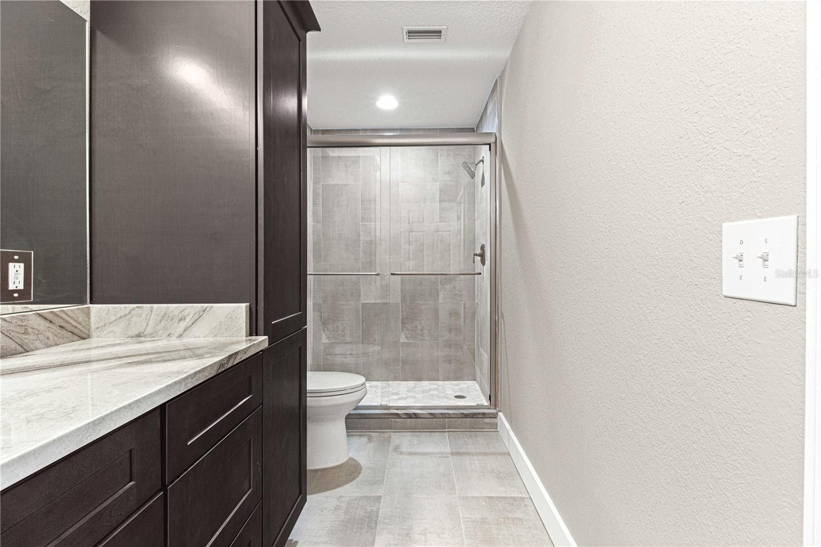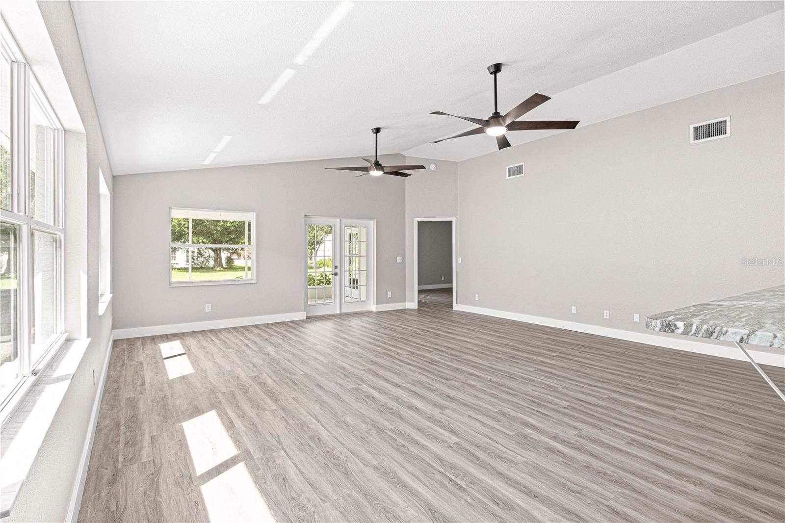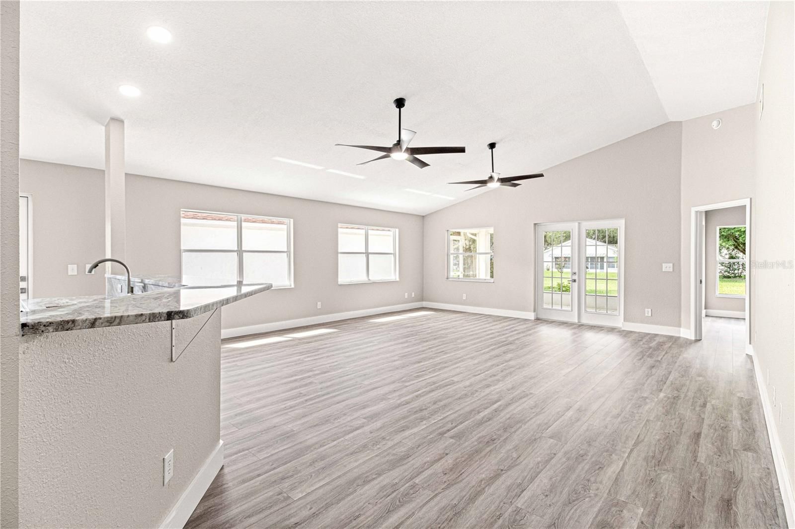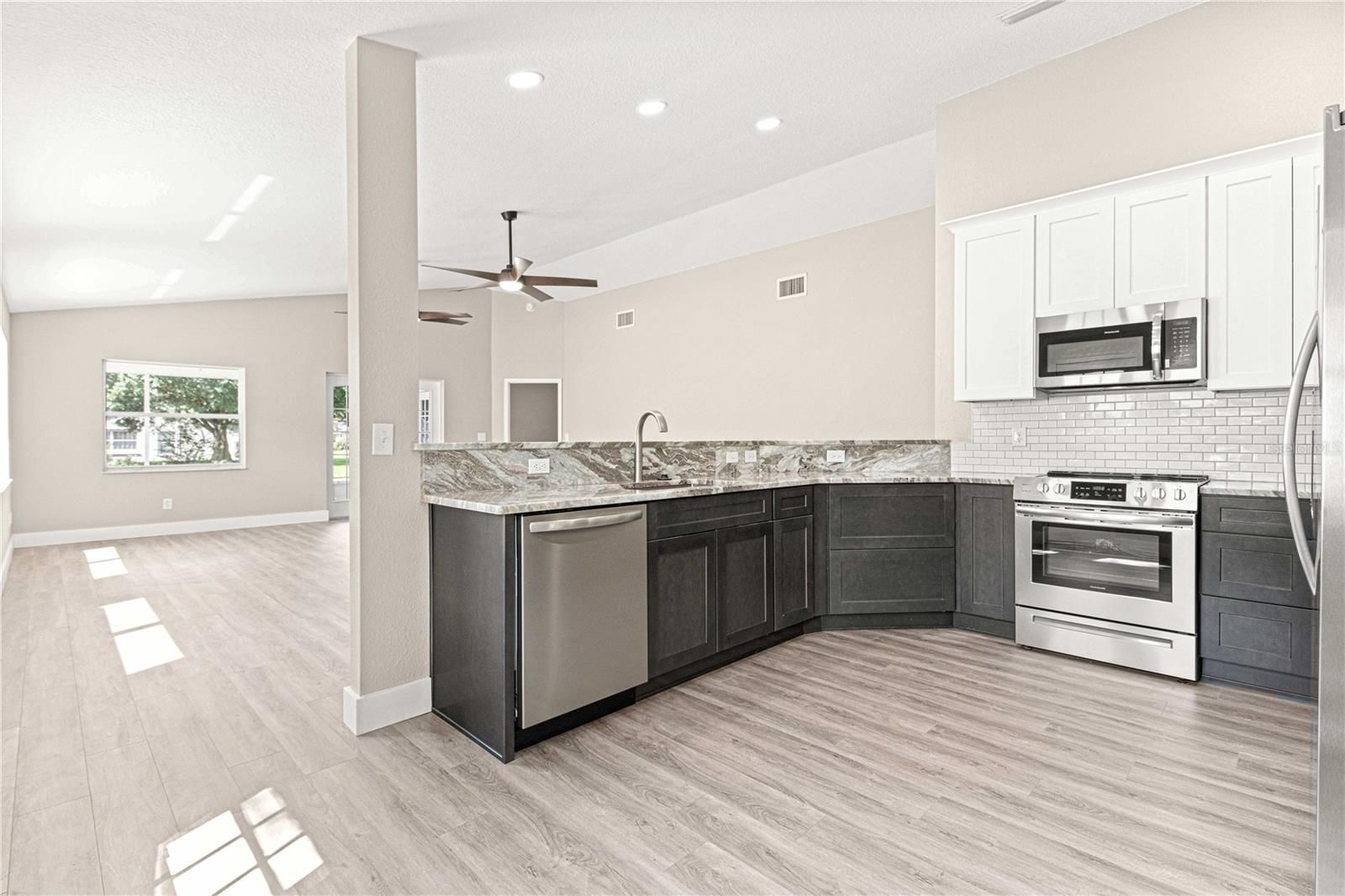 Completely remodeled and move-in ready, this beautifully updated 2 bedroom, 2 bath home is situated in Williamsburg within the highly desirable 55+ community of On Top of the World in Ocala. Step inside to volume ceilings and vinyl plank flooring that create a bright, open feel throughout the main living areas. The brand new kitchen is thoughtfully designed with 42 inch upper cabinets, soft close cabinetry and drawers, granite countertops, tile backsplash, breakfast bar seating, and brand new stainless steel appliances. The primary suite features a walk-in closet, additional linen closet, dual sinks with marble countertops, a tiled step-in shower with glass doors, and a sleek anti-fog mirror for a modern touch. The guest bathroom is fully updated with granite countertops, soft close cabinetry, and a tiled step-in shower with glass doors. The guest bedroom offers a large built-in closet, and an additional hallway linen closet provides even more storage. Enjoy outdoor living with a courtyard, screened lanai, and 1 car garage. Modern ceiling fans are installed throughout, and the HVAC was replaced in 2022 for added peace of mind. Residents enjoy resort-style amenities including pools, golf courses, recreation centers, fitness facilities, walking trails, and a full calendar of social activities. Thoughtfully renovated and truly move-in ready, this home offers both style and lifestyle.Due to recent weather conditions, the current landscaping may not reflect the photos. This is weather related and not due to lack of maintenance.