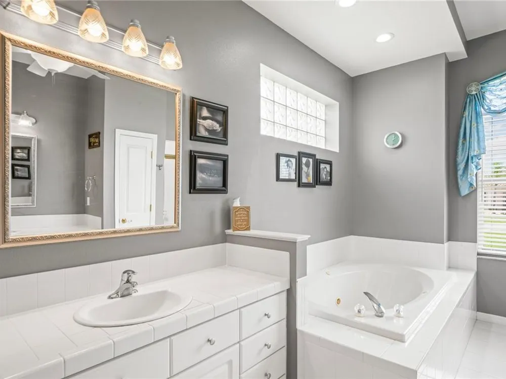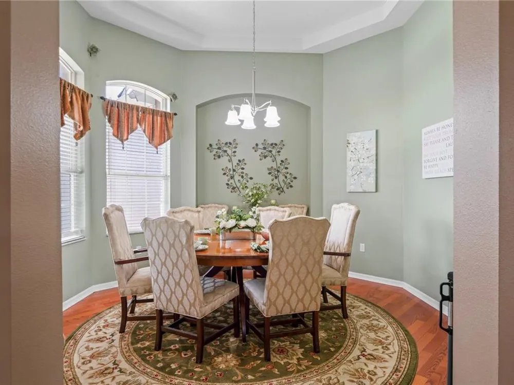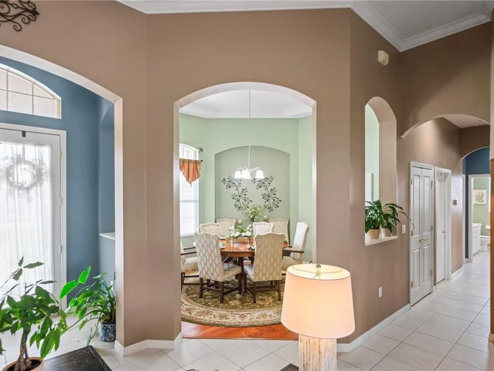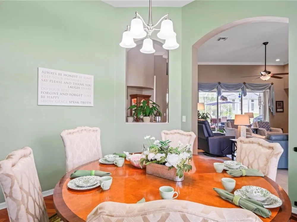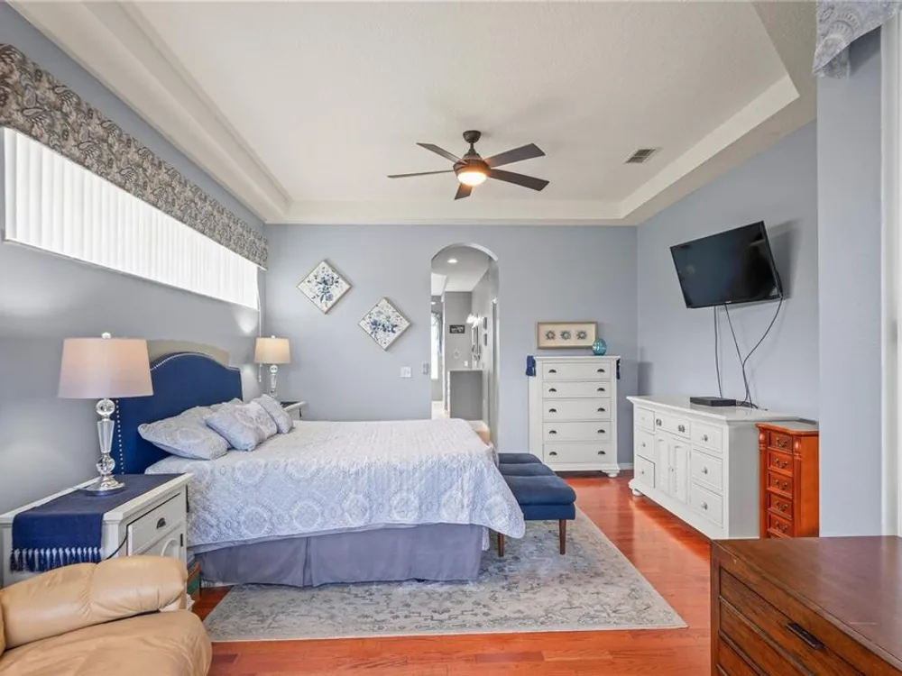 - Ceiling Fan(s), Crown Molding, Eat-in Kitchen, High Ceilings, Main Level Primary, Solid-Wood Cabinets, Split Bedrooms, Tray Ceiling(s), Walk-In Closet(s), Window Treatments