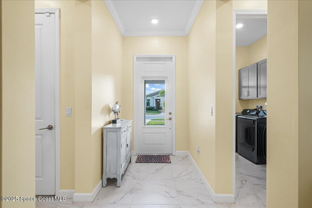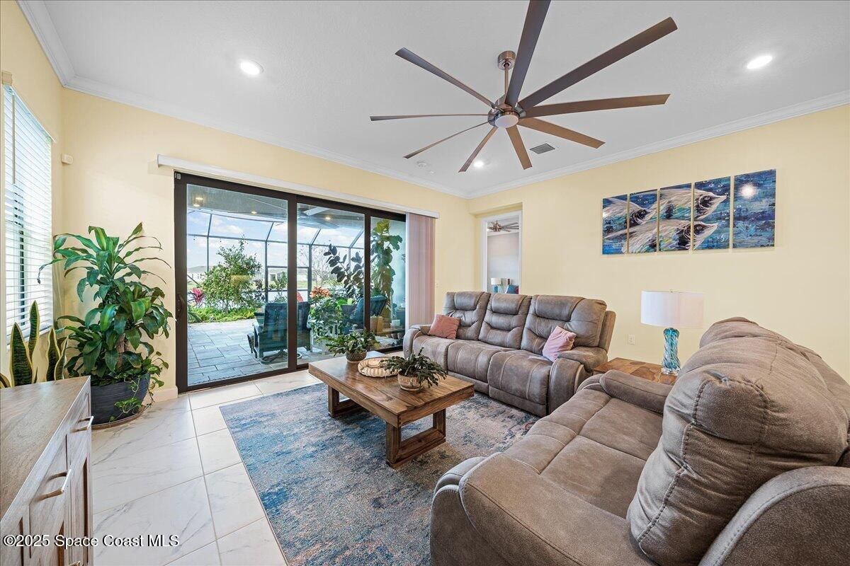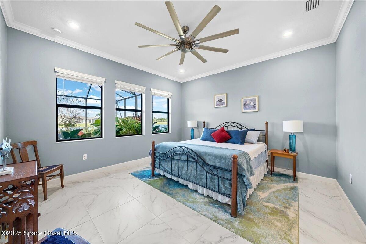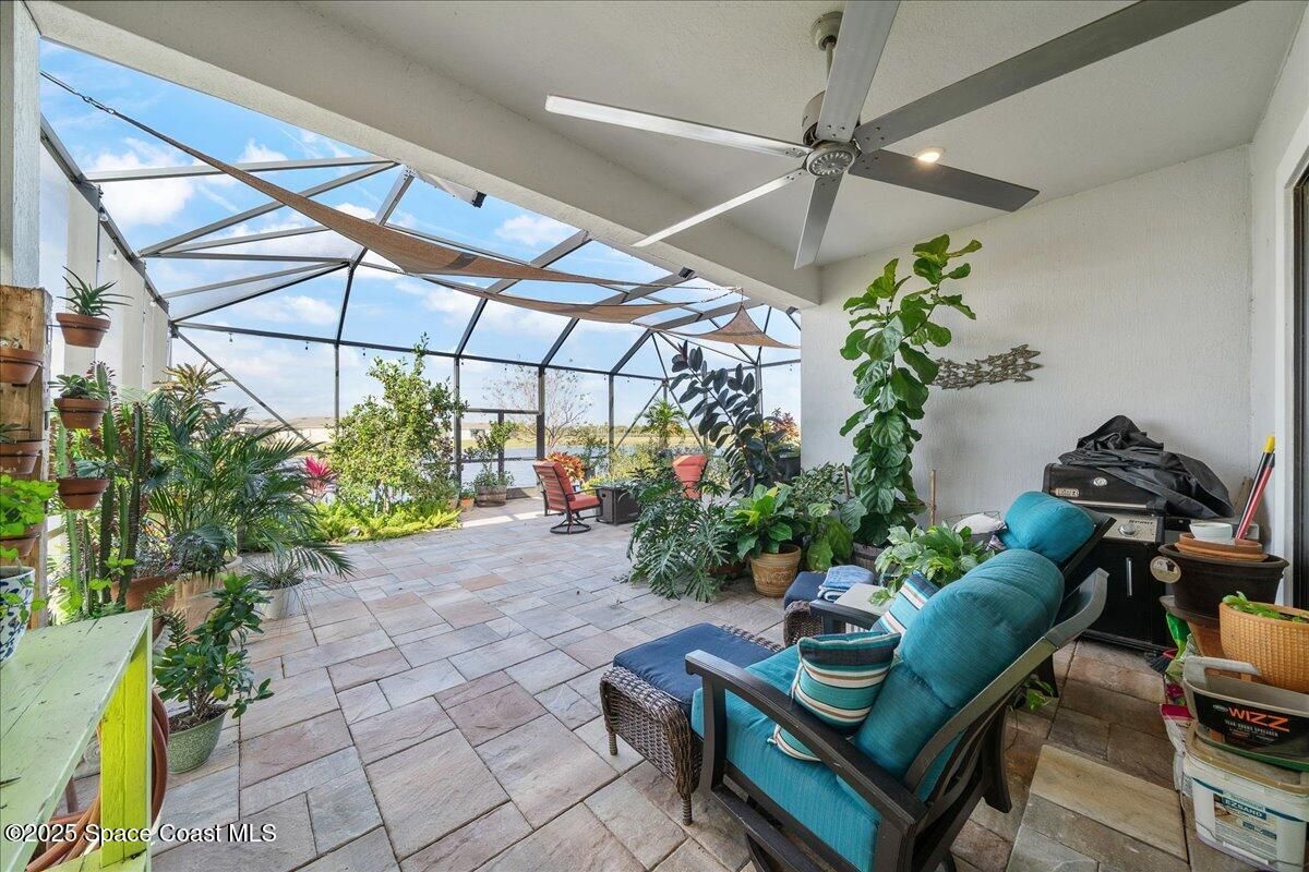 Looking for privacy and one of the best views in Bridgewater at Viera? You've found it. This home sits on the wide part of the lake and faces more green space than most lots. It also features the largest lanai in the entire community, creating a peaceful, expansive outdoor oasis perfect for plant lovers and anyone who enjoys relaxing in a spacious patio setting. The layout offers generous room to host guests, with upgraded kitchen features including wood slide-outs in every lower cabinet and wood shelving with pullouts in the pantry. The primary suite includes a double vanity, tiled shower, and two walk-in closets—one upgraded with built-ins. Additionally, there are IMPACT WINDOWS, an expanded driveway and epoxy floors in the garage. Located in a vibrant 55+ community, you'll also enjoy resort-style amenities like a luxurious clubhouse, oversized pool, fitness center, tennis & pickleball, and a full calendar of activities designed for connection and quality of life.