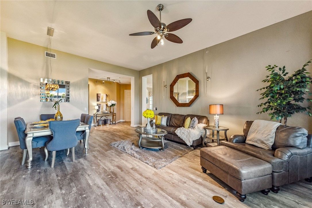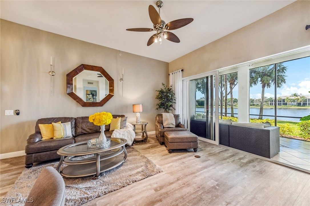 Experience luxury resort living in this beautifully updated first-floor coach home in Laguna at Fiddler’s Creek, offering three bedrooms, three baths, an attached two-car garage, and peaceful lake views with desirable southwest exposure. The exterior has been refreshed with a new tile roof, impact-rated doors and windows, fresh paint, new lanai screens, a paver driveway, and a charming courtyard entry. The screened and covered lanai is the perfect place to relax and take in the panoramic water views. Inside, the home welcomes you with volume ceilings, designer lighting, abundant natural light, and luxury vinyl plank flooring throughout the main living spaces. The gourmet kitchen is appointed with white cabinetry, granite countertops and backsplash, a breakfast bar, an eat-in dining area, and stainless steel appliances, including natural gas cooking. The open layout flows into the spacious family room and living/dining areas, ideal for both everyday living and entertaining. The owner’s suite is a tranquil retreat featuring captivating lake views, lanai access, two walk-in closets, and an en-suite bath with dual sinks, makeup vanity, soaking tub, enclosed water closet, and large walk-in shower. Each guest bedroom offers the comfort of its own en-suite bath, providing privacy and convenience. Newer mechanicals and appliances include the HVAC system, hot water heater, microwave, freezer, washer, and dryer. Offered furnished, this residence is move-in ready. Residents enjoy access to the spectacular 54,000-square-foot club and spa, offering casual and fine dining, resort-style pools with waterfalls and slides, a fitness center with classes and personal training, active tennis and pickleball programs, bocce, spa services, sauna, steam room, and an extremely active social calendar, with exciting renovations underway. Optional memberships are available for The Tarpon Club, with beach and marina privileges, and The Golf Club with its recently renovated course and new clubhouse. Just minutes from Marco Island, downtown Naples, world-class dining, shopping, executive airport, and beaches, this home captures the essence of the desired Florida resort lifestyle.