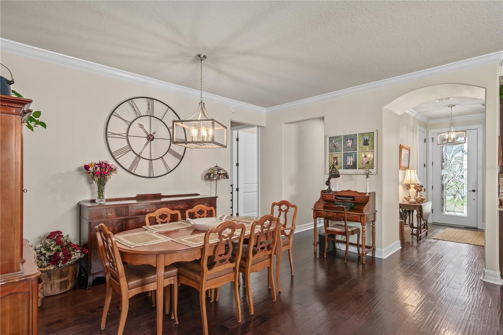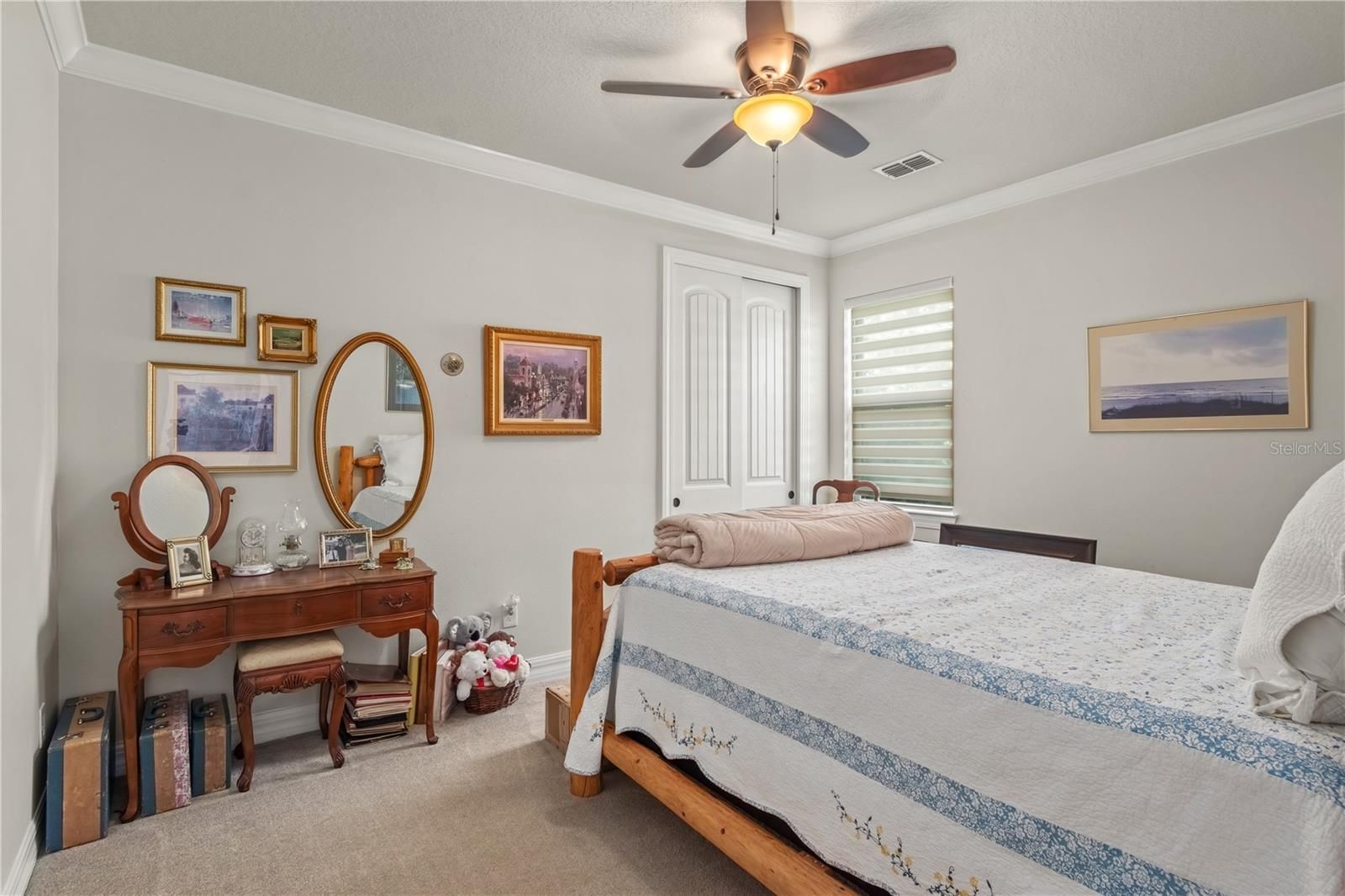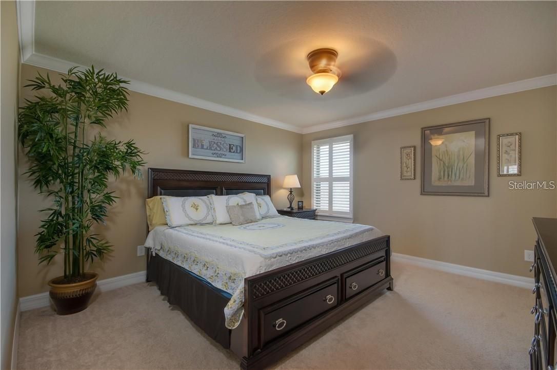 - Ceiling Fan(s), Crown Molding, Eat-in Kitchen, High Ceilings, In-Wall Pest Control, Open Floorplan, Main Level Primary, Split Bedrooms, Stone Counters, Walk-In Closet(s), Window Treatments