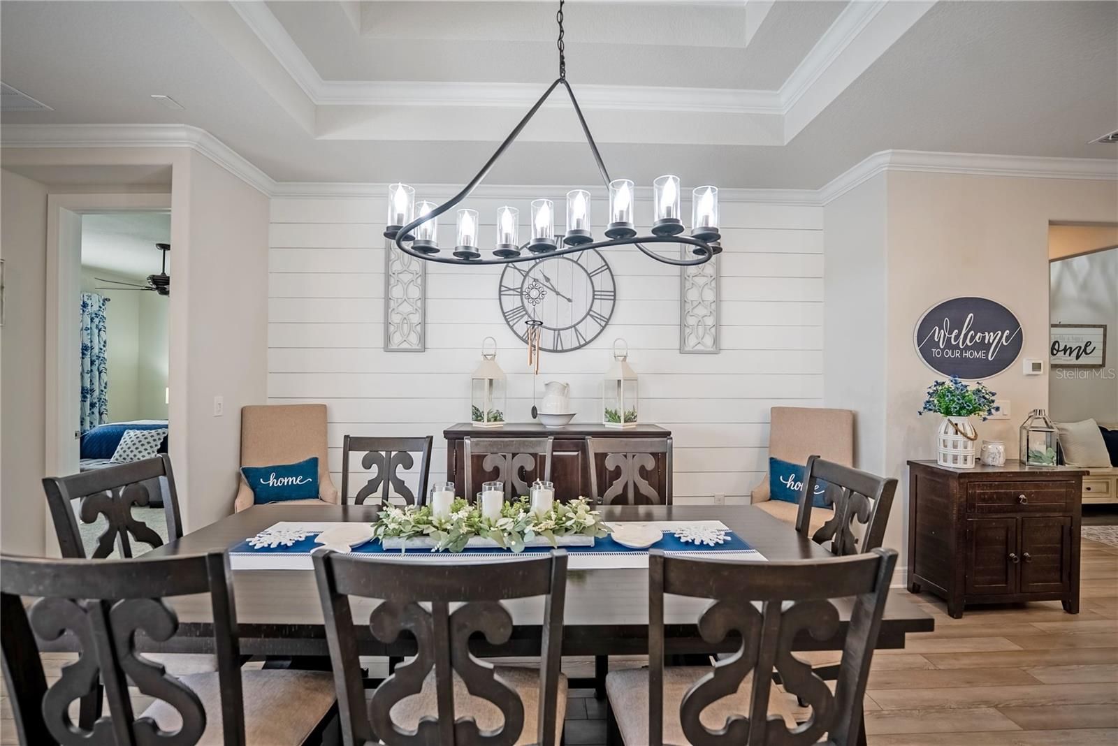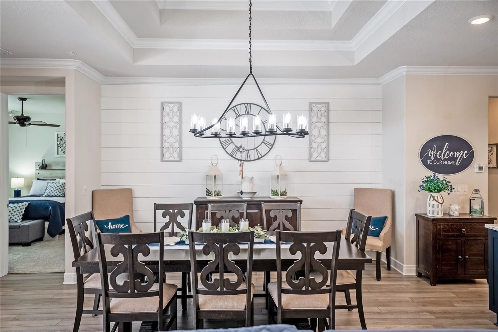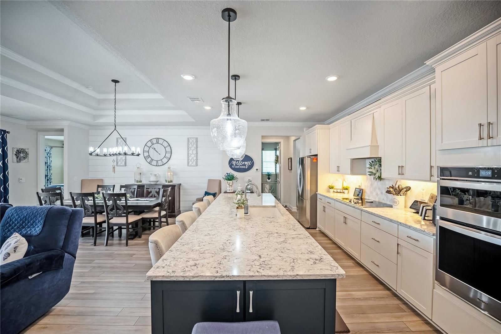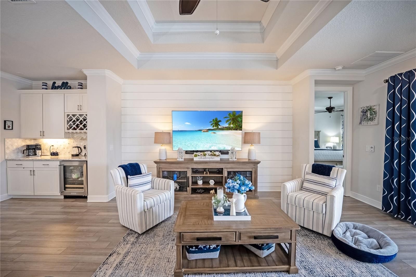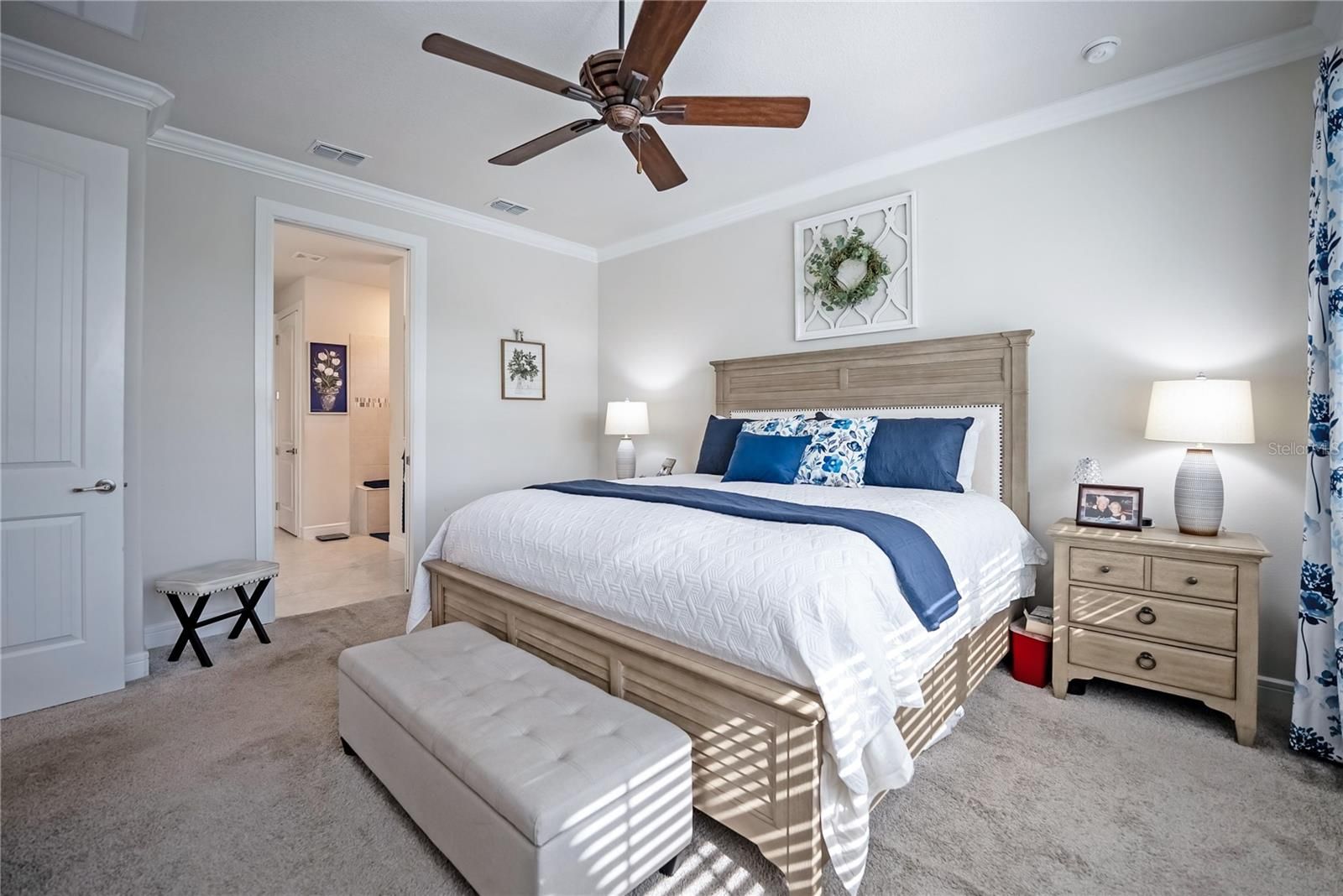 - Ceiling Fan(s), Crown Molding, Dry Bar, Eat-in Kitchen, High Ceilings, Kitchen/Family Room Combo, Living/Dining Room, Open Floorplan, Main Level Primary, Stone Counters, Thermostat, Tray Ceiling(s), Walk-In Closet(s)