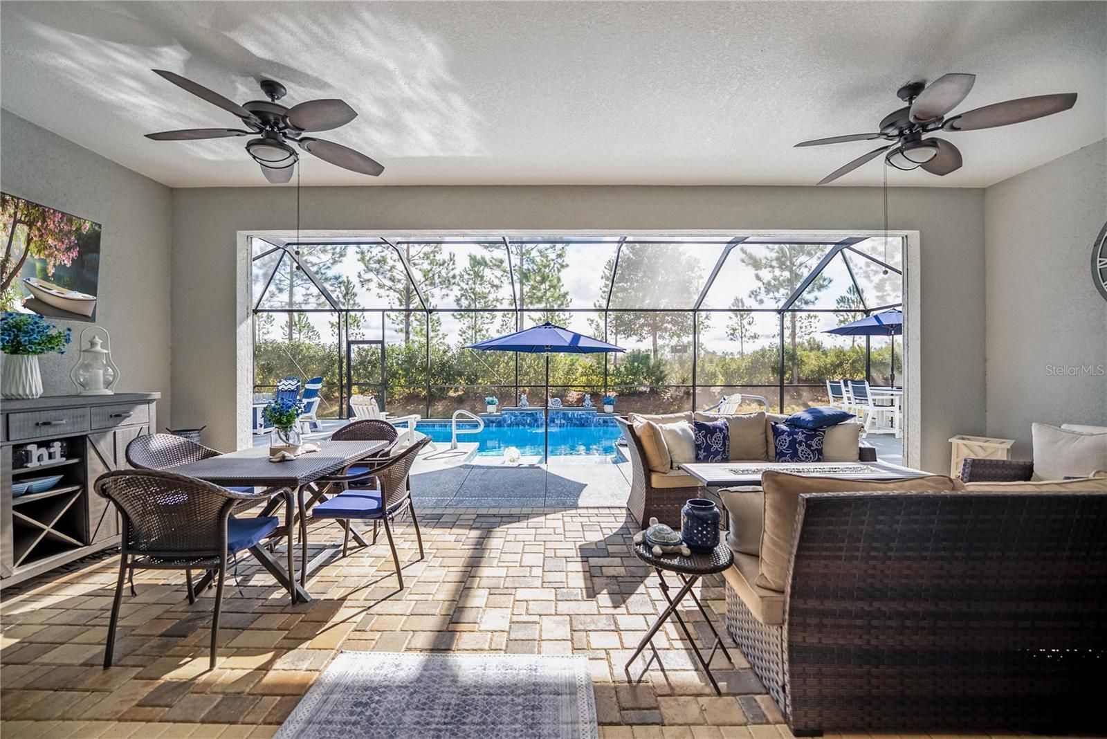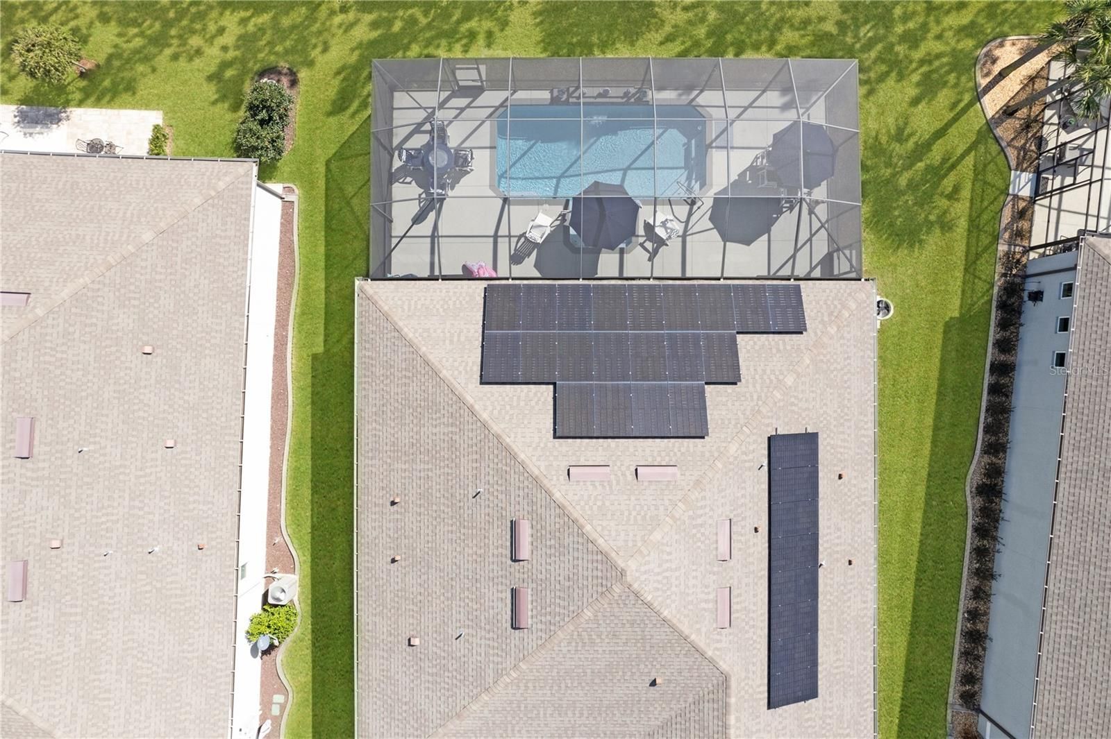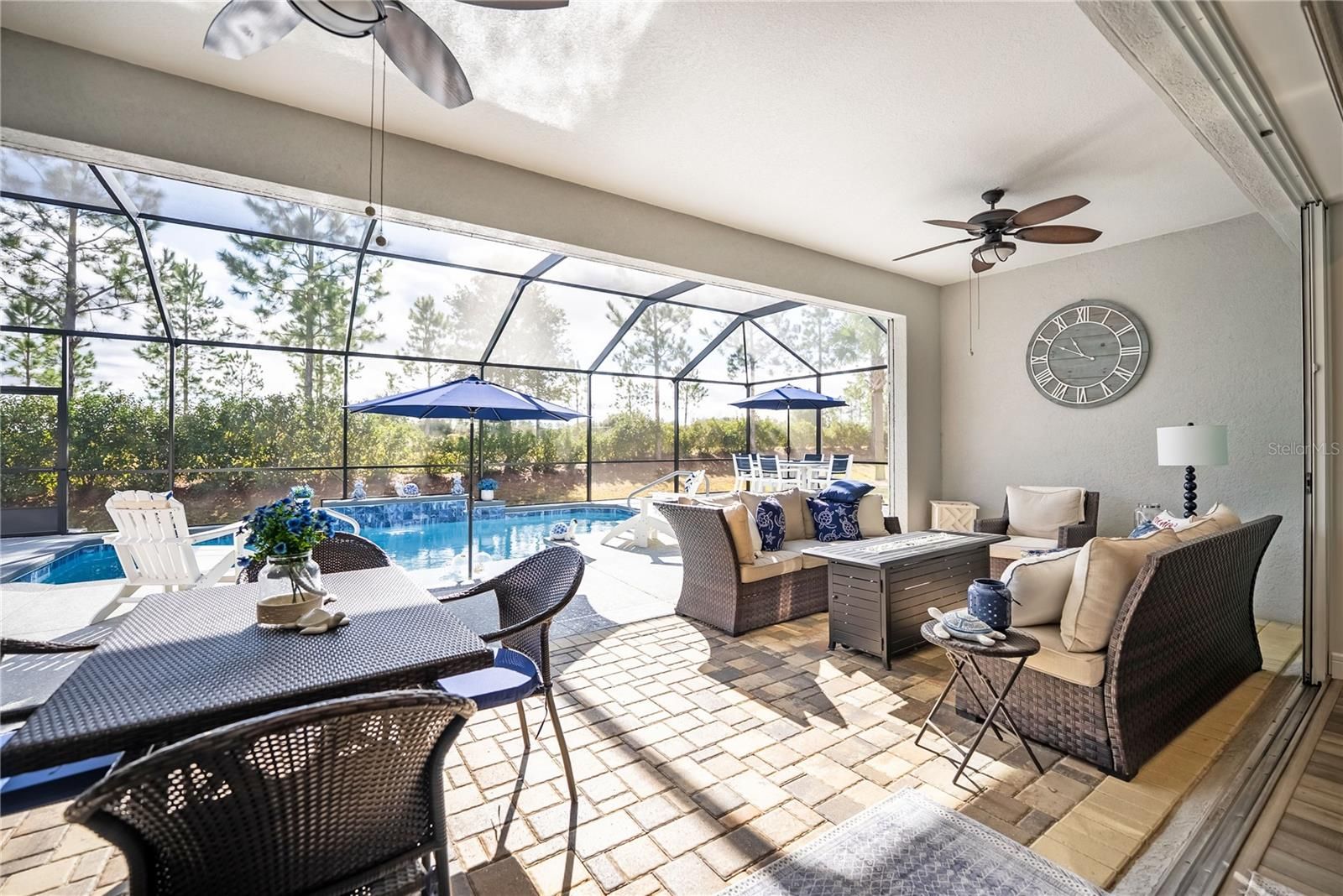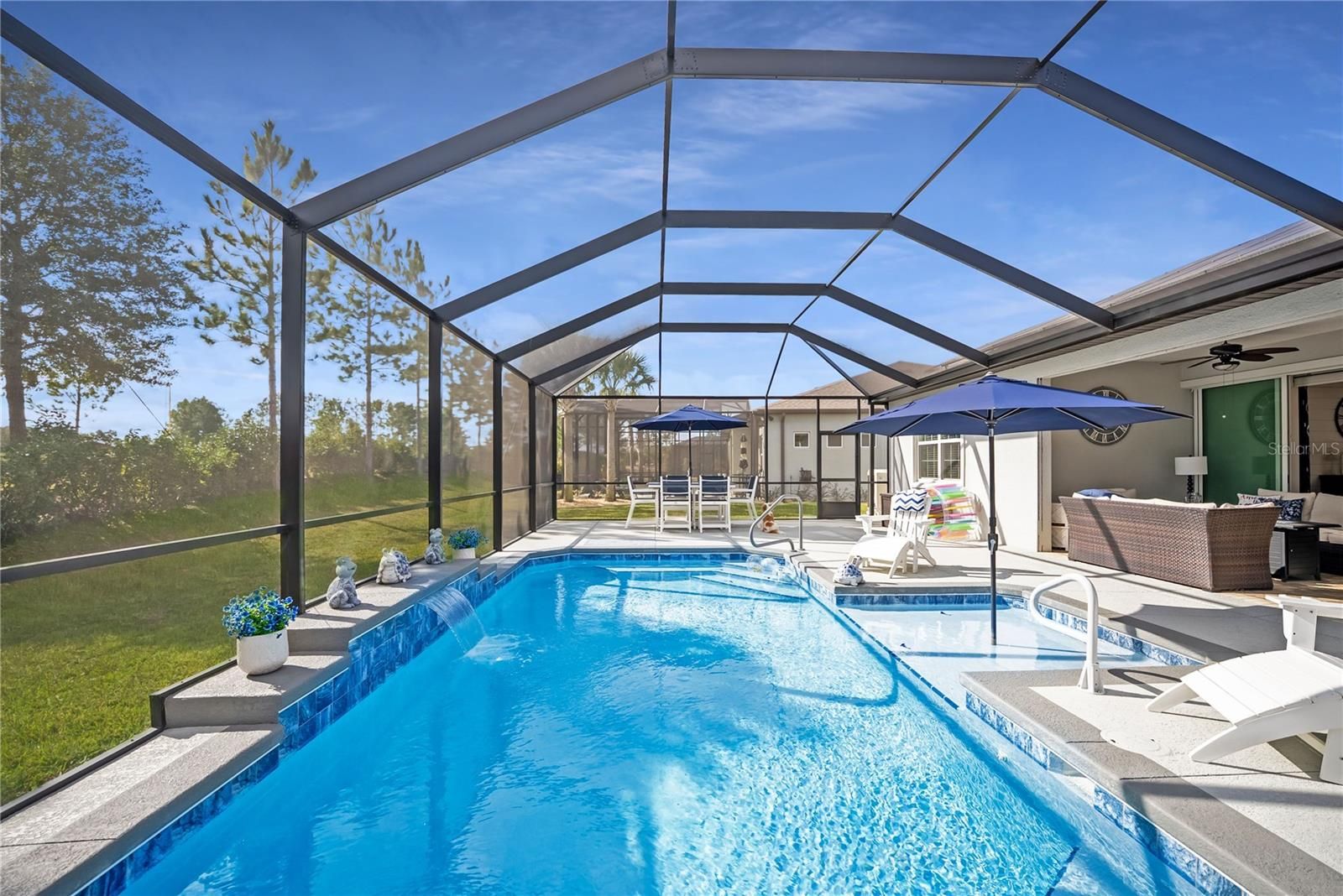 ASSUMABLE $340,000 LOAN AT 2.38%! This beautifully appointed Stardom model in Del Webb Stone Creek showcases thoughtful design, high-end finishes, and exceptional indoor-outdoor living—perfectly suited for enjoying your retirement in the resort-style lifestyle this community is known for. As you arrive, the upgraded stone elevation, paver driveway and walkway, and front screened porch create inviting curb appeal. Step through the elegant 8' glass-inset front door into a bright, welcoming foyer accented by rounded drywall corners, crown molding, and upgraded Cheyenne 8' doors throughout. Immediately to your left, you’ll find the enclosed flex room, finished with luxury vinyl flooring, making it an ideal space for a home office, den, or hobby room. Just beyond the flex room is the conveniently located half bathroom, perfect for guests. As you continue forward, the home opens beautifully into the main living area, where the dry bar, gourmet kitchen, living room, and dining area come together in a spacious, open-concept design. The living areas are enhanced with custom shiplap accent walls, adding texture and architectural interest, along with stylish pendant lighting that elevates the space and creates a warm, inviting ambiance. The gourmet kitchen is a true showstopper, featuring double-color cabinetry with 42" upgraded cabinets, crown molding, soft-close doors, pull-outs, and sleek quartz countertops. A vented hood, stainless steel built-in appliances, and thoughtfully placed pendant lighting complete this stunning and functional centerpiece of the home. The living room is flooded with natural light and flows effortlessly to the outdoor oasis through sliding glass doors that pocket completely, creating a wide opening for seamless indoor-outdoor Florida living. Step outside to the spectacular pool with a birdcage enclosure, perfect for relaxing or entertaining year-round. Both bedrooms are designed as private ensuite retreats. The primary suite features a spa-inspired bathroom with a tile recessed walk-in shower and refined finishes, while the secondary ensuite offers a tub and tiled shower, ideal for guests. Additional upgrades include a laundry room with cabinets and a utility sink, an extended 3-car garage, a hybrid water heater, a water softener, and 28 solar panels, combining luxury, efficiency, and comfort.