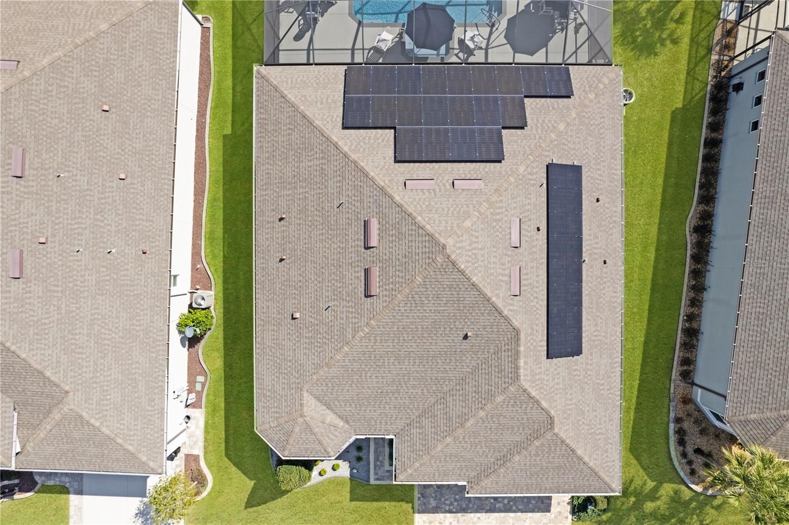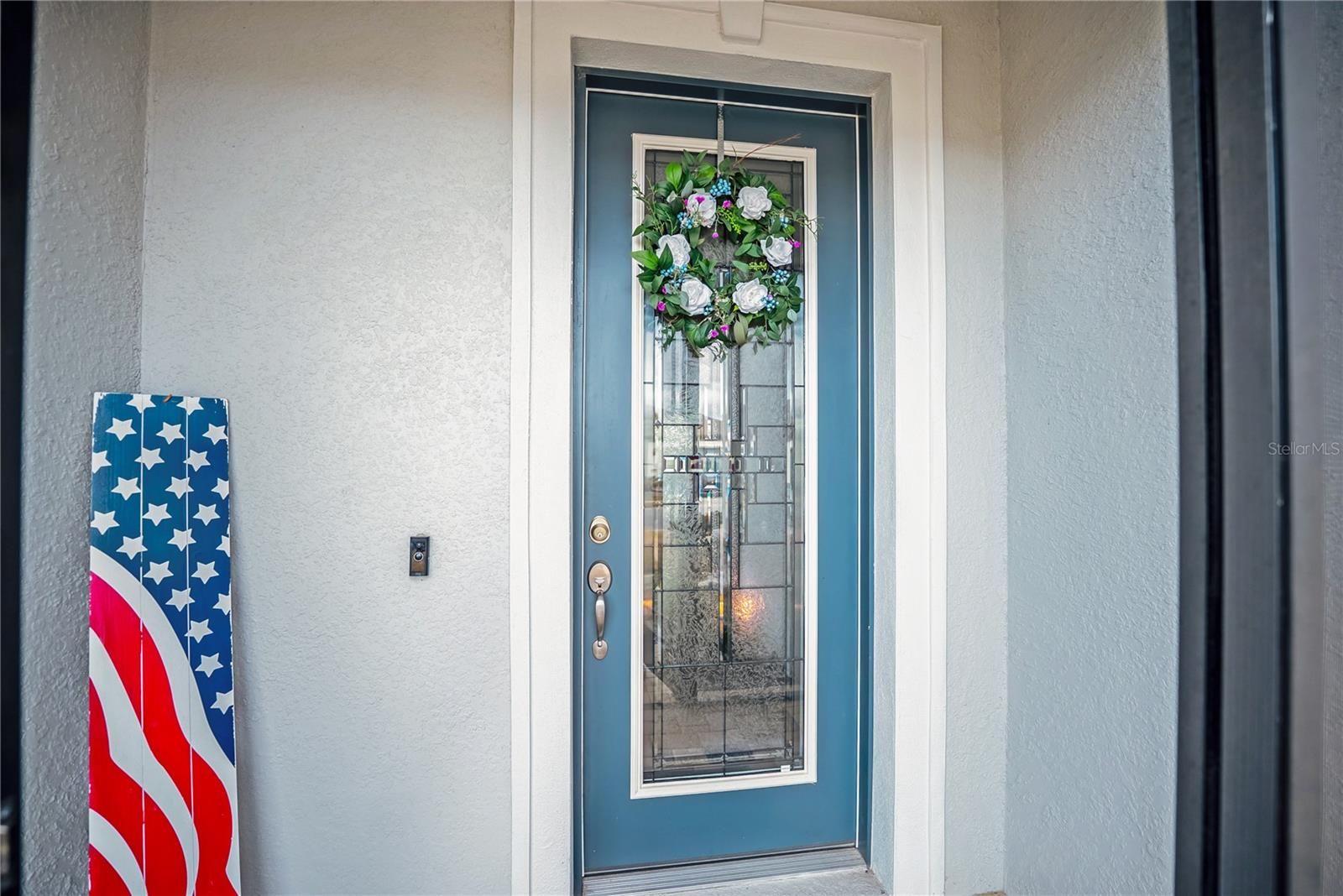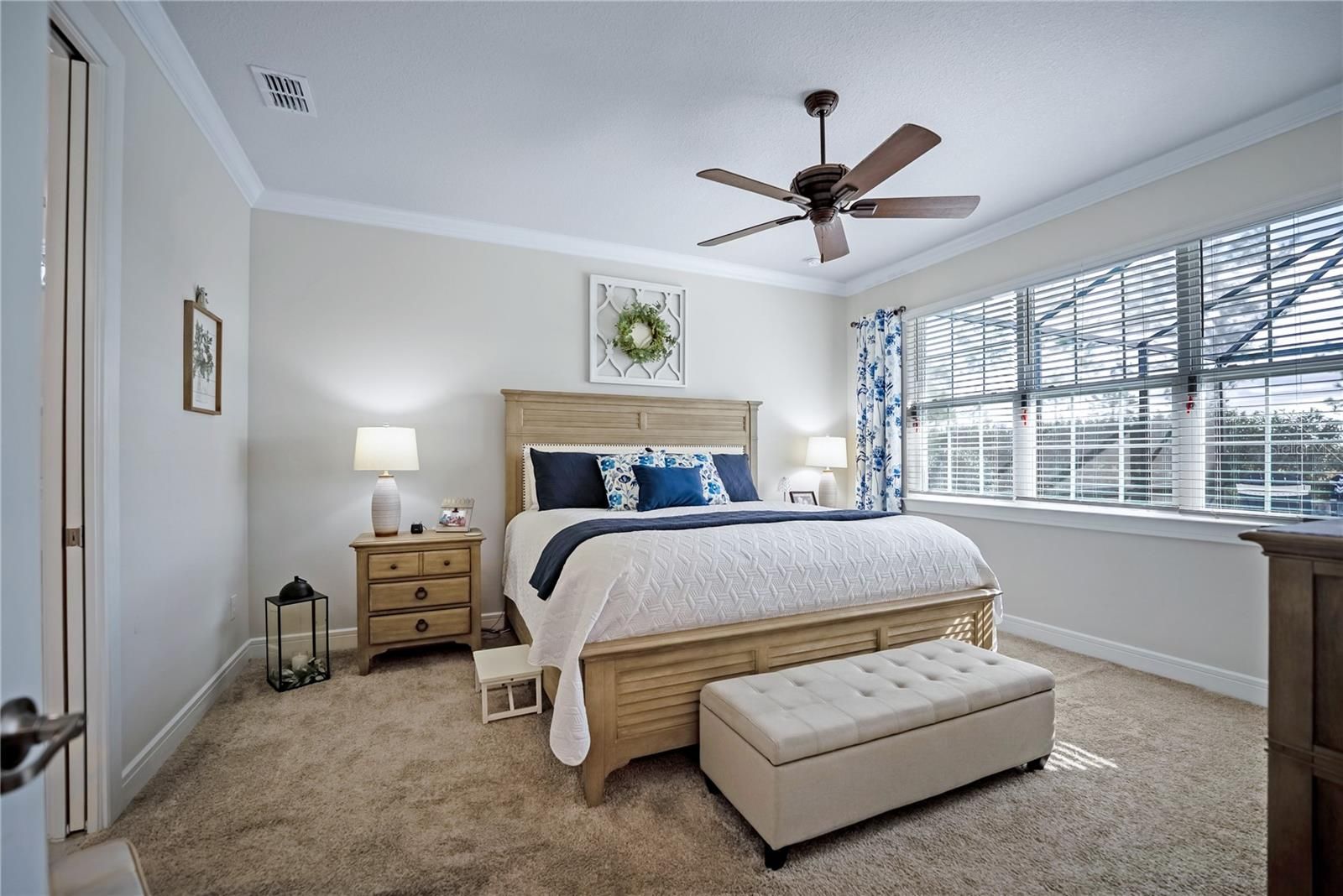 ASSUMABLE $340,000 LOAN AT 2.38%! This beautifully appointed Stardom model in Del Webb Stone Creek showcases thoughtful design, high-end finishes, and exceptional indoor-outdoor living—perfectly suited for enjoying your retirement in the resort-style lifestyle this community is known for. As you arrive, the upgraded stone elevation, paver driveway and walkway, and front screened porch create inviting curb appeal. Step through the elegant 8' glass-inset front door into a bright, welcoming foyer accented by rounded drywall corners, crown molding, and upgraded Cheyenne 8' doors throughout. Immediately to your left, you’ll find the enclosed flex room, finished with luxury vinyl flooring, making it an ideal space for a home office, den, or hobby room. Just beyond the flex room is the conveniently located half bathroom, perfect for guests. As you continue forward, the home opens beautifully into the main living area, where the dry bar, gourmet kitchen, living room, and dining area come together in a spacious, open-concept design. The living areas are enhanced with custom shiplap accent walls, adding texture and architectural interest, along with stylish pendant lighting that elevates the space and creates a warm, inviting ambiance. The gourmet kitchen is a true showstopper, featuring double-color cabinetry with 42" upgraded cabinets, crown molding, soft-close doors, pull-outs, and sleek quartz countertops. A vented hood, stainless steel built-in appliances, and thoughtfully placed pendant lighting complete this stunning and functional centerpiece of the home. The living room is flooded with natural light and flows effortlessly to the outdoor oasis through sliding glass doors that pocket completely, creating a wide opening for seamless indoor-outdoor Florida living. Step outside to the spectacular pool with a birdcage enclosure, perfect for relaxing or entertaining year-round. Both bedrooms are designed as private ensuite retreats. The primary suite features a spa-inspired bathroom with a tile recessed walk-in shower and refined finishes, while the secondary ensuite offers a tub and tiled shower, ideal for guests. Additional upgrades include a laundry room with cabinets and a utility sink, an extended 3-car garage, a hybrid water heater, a water softener, and 28 solar panels, combining luxury, efficiency, and comfort.