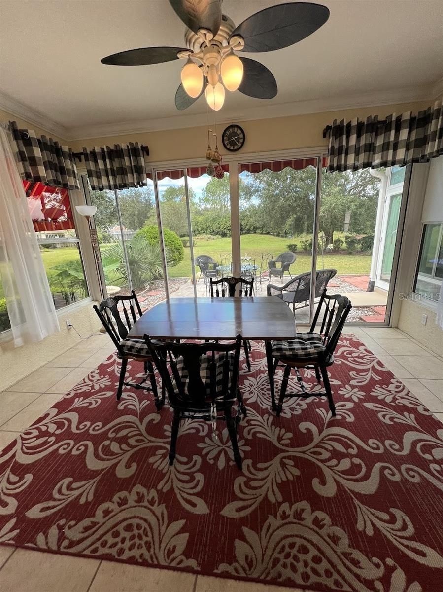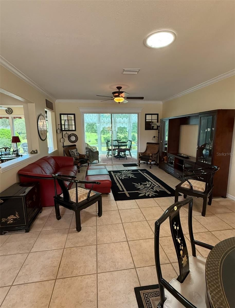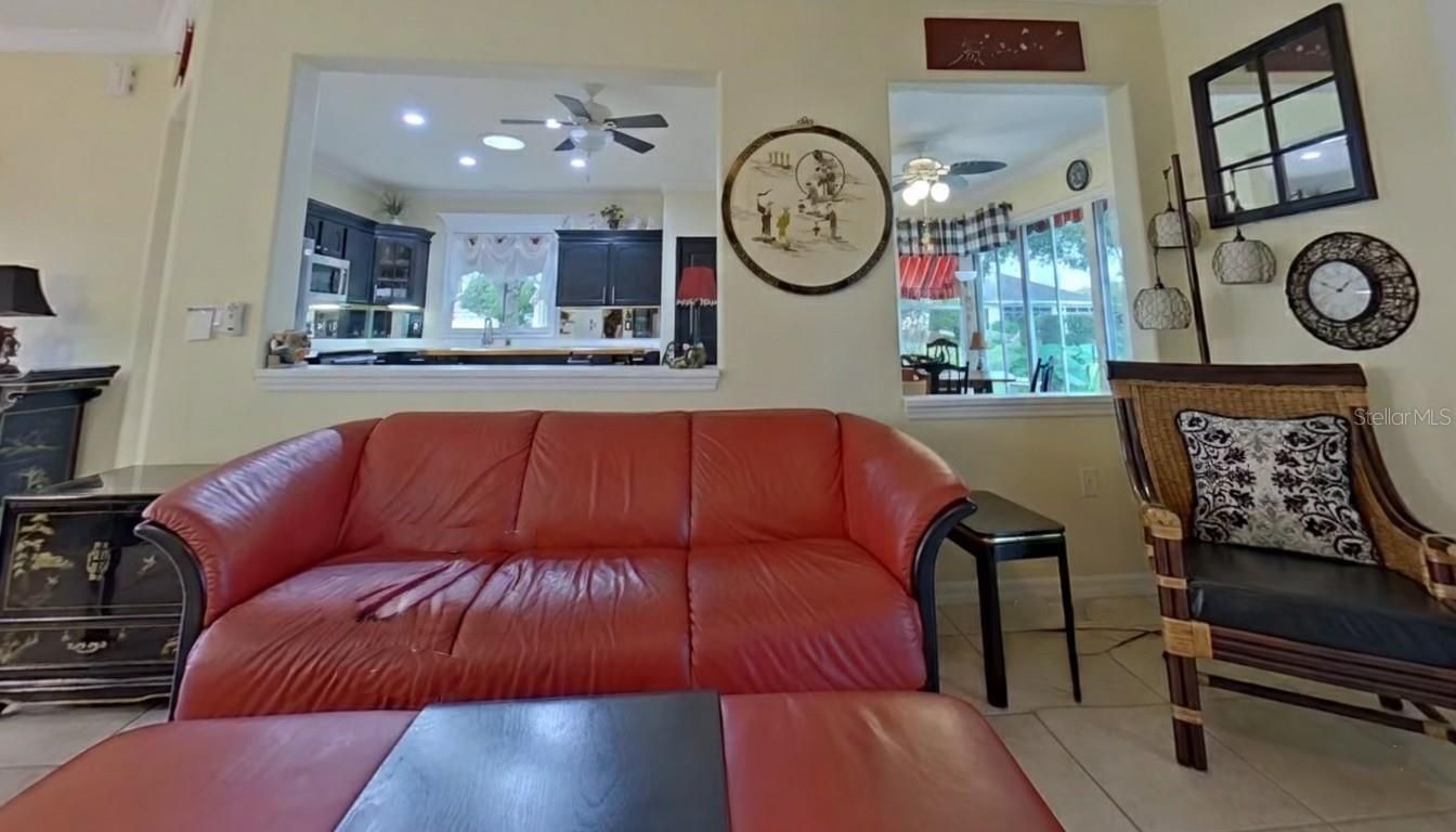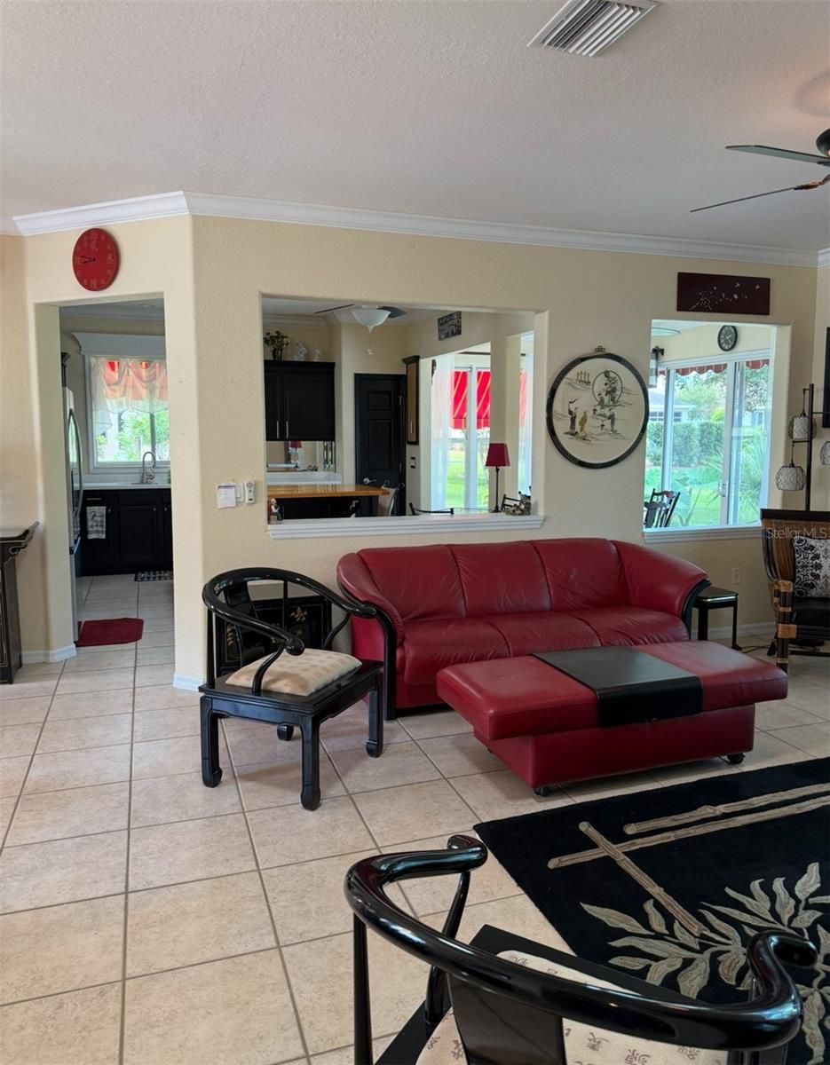 One or more photo(s) has been virtually staged. This SAN MATEO home in the gated, guarded active adult community offers 2 bedrooms and 2 baths, a two-car garage, and an open floor plan. Crown molding runs throughout the home. The living room features tile flooring, a ceiling fan, and sliding doors to the sunroom, which was added in 2016 and includes a portable AC with views of lush green space. The kitchen is bright and functional, with crown molding, a ceiling fan, a solar tube added in 2017, a custom island, stainless steel appliances including a new refrigerator, and ample bar seating. The primary bathroom features crown molding, dual vanities at varying heights, a solar tube, safety grab bars, and abundant mirrors. The secondary bath includes a ceiling fan, medicine cabinet, and shower/tub combination. The second bedroom offers a Murphy bed, built-in mirrored closet, crown molding, ceiling fan, and natural light. The backyard is private with pavers highlighting the sunroom addition and a retractable awning for shade. The front porch and entryway provide a welcoming space for outdoor seating. Roof replaced in 2023.