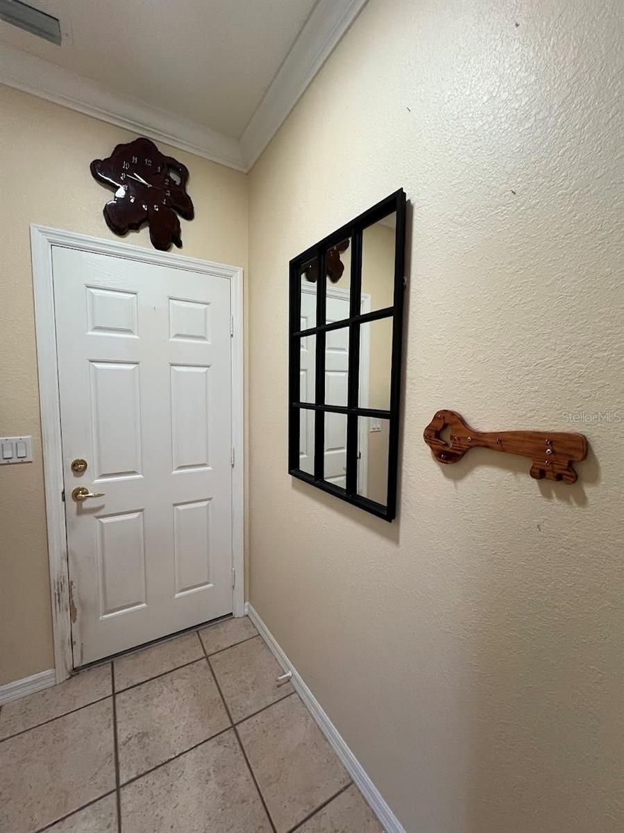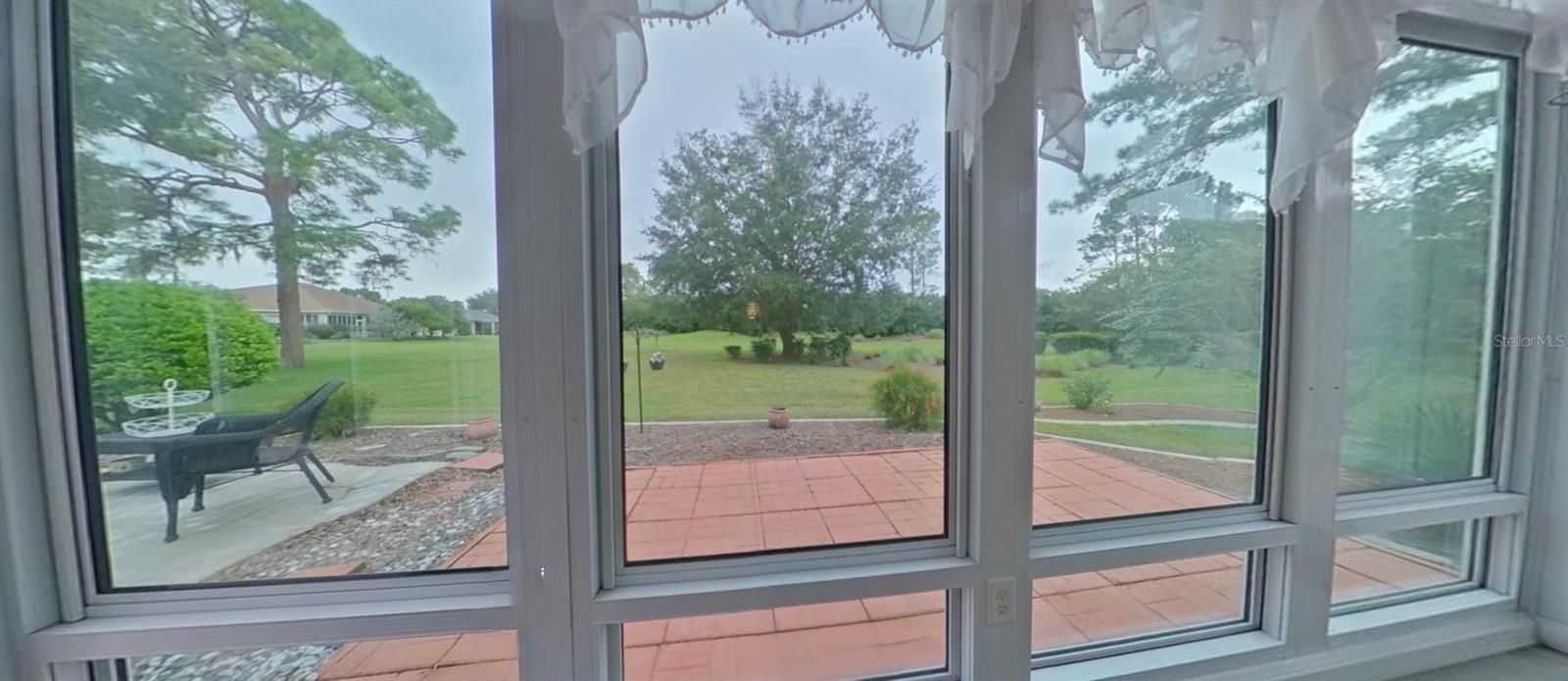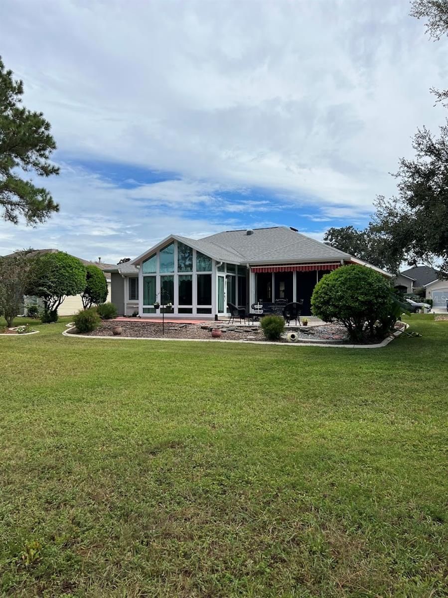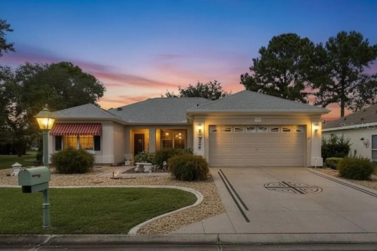 One or more photo(s) has been virtually staged. This SAN MATEO home in the gated, guarded active adult community offers 2 bedrooms and 2 baths, a two-car garage, and an open floor plan. Crown molding runs throughout the home. The living room features tile flooring, a ceiling fan, and sliding doors to the sunroom, which was added in 2016 and includes a portable AC with views of lush green space. The kitchen is bright and functional, with crown molding, a ceiling fan, a solar tube added in 2017, a custom island, stainless steel appliances including a new refrigerator, and ample bar seating. The primary bathroom features crown molding, dual vanities at varying heights, a solar tube, safety grab bars, and abundant mirrors. The secondary bath includes a ceiling fan, medicine cabinet, and shower/tub combination. The second bedroom offers a Murphy bed, built-in mirrored closet, crown molding, ceiling fan, and natural light. The backyard is private with pavers highlighting the sunroom addition and a retractable awning for shade. The front porch and entryway provide a welcoming space for outdoor seating. Roof replaced in 2023.