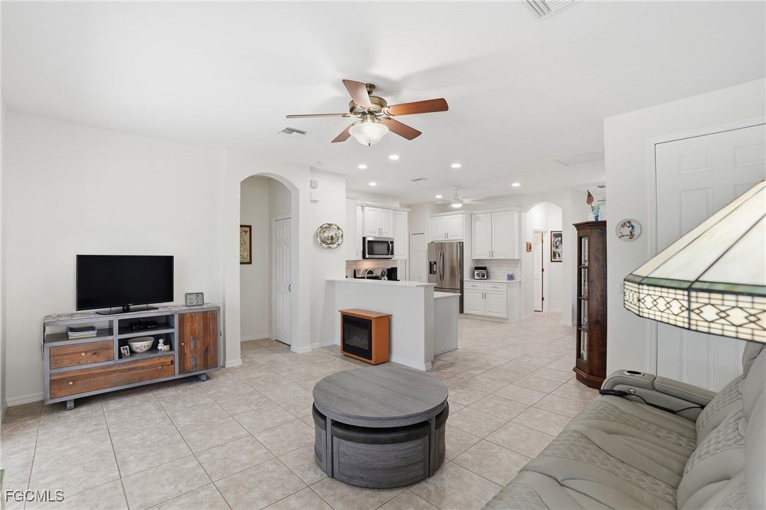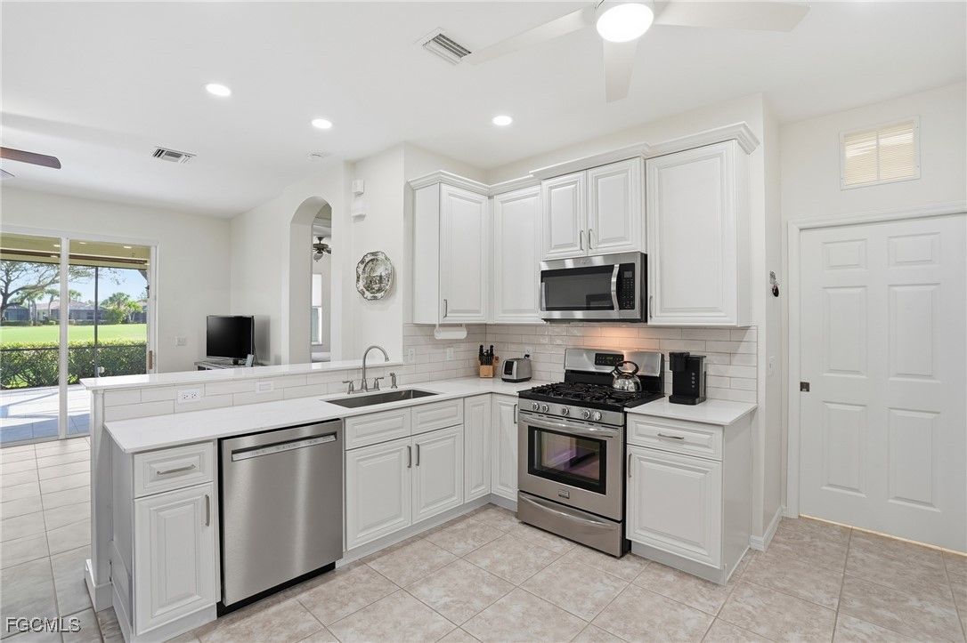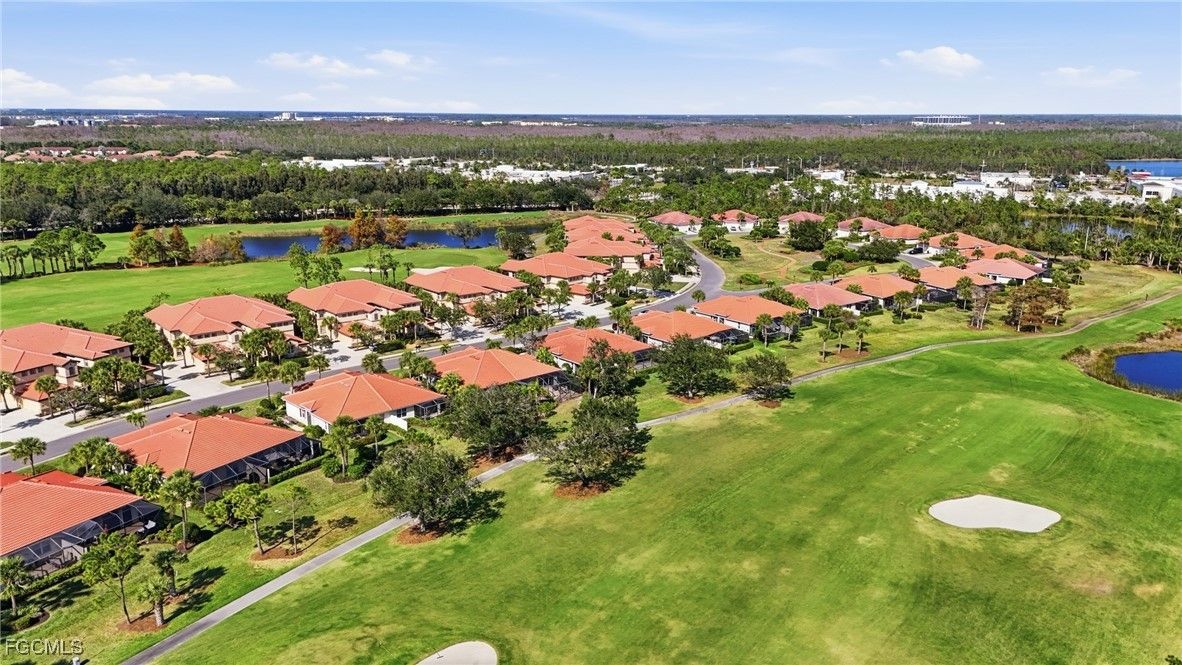 Nestled within Fort Myers’ premier 55+ community of Pelican Preserve, this beautifully updated 2-bedroom, 2-bath, 2-car garage villa offers an exceptional combination of space, comfort, and peace of mind. Located in the desirable Triveso neighborhood, this duplex-style home sits directly on the golf course fairway, delivering serene views and an open, airy backdrop that enhances the home’s already generous layout. Designed with an inviting open-concept floor plan, the kitchen seamlessly connects to both the living and dining areas, making the space ideal for entertaining or everyday living. The bright white kitchen features 42” cabinetry, solid-surface countertops, a gas stove, and stainless steel appliances, offering excellent storage and counter space while keeping the heart of the home light, open, and functional. The split-bedroom layout provides privacy for guests, while the spacious primary suite overlooks the fairway and includes a private, updated bath with a new walk-in shower, rain shower head, and rimless glass door. The home has been freshly painted and includes impact doors and windows, natural gas, a NEW ROOF, and a whole-home generator, delivering comfort and confidence year-round. Additional highlights include an indoor laundry room and an extra-long garage with a dedicated office area and abundant storage, complete with both upper and lower cabinetry. One of the standout features of this home is the massive screened and tiled lanai, perfectly positioned to capture sweeping golf course views and outfitted with Storm Smart drop-down shutters, creating a versatile indoor-outdoor living space you’ll enjoy in every season. Pelican Preserve is an award-winning active adult community known for its resort-style amenities, including golf, tennis, pickleball, bocce, multiple pools, spa services, on-site dining, and a vibrant social calendar. Ideally located close to shopping, dining, Southwest Florida International Airport, and the area’s world-famous beaches, this is Florida living at its finest. This home is a must-see for buyers seeking space, quality, and an unmatched lifestyle.