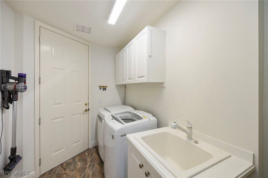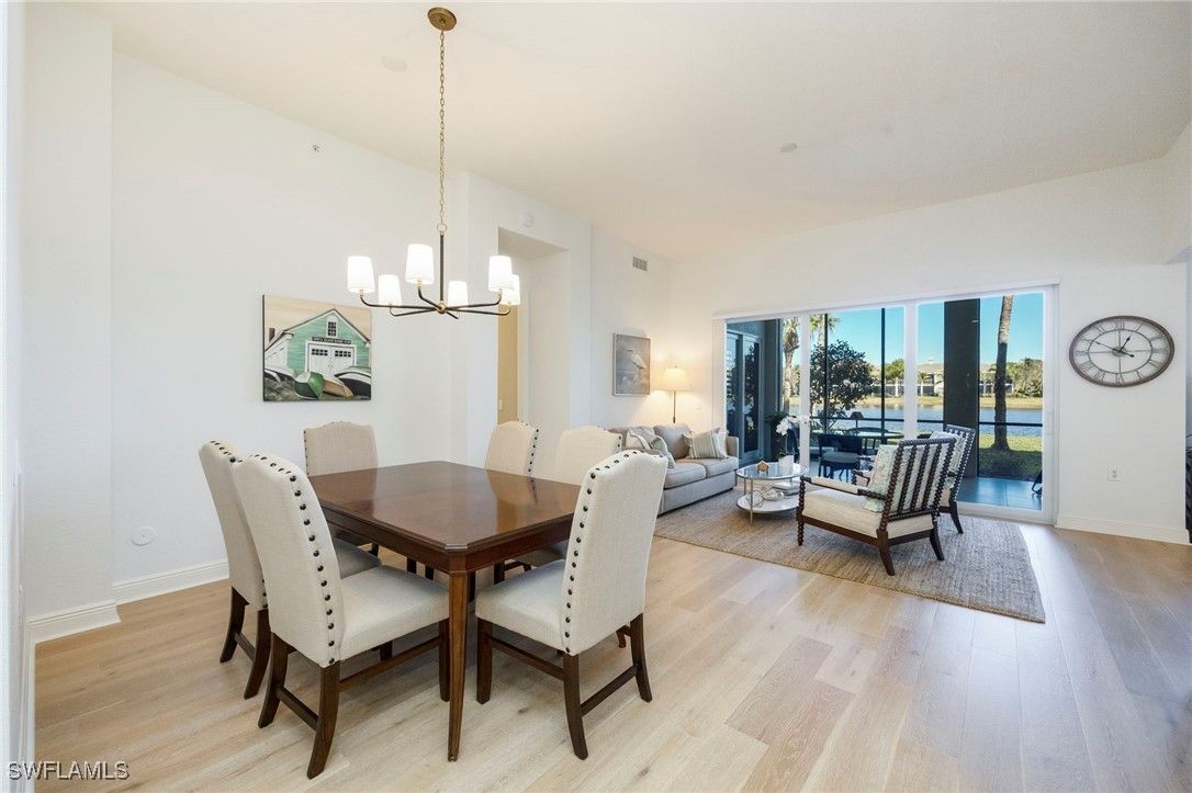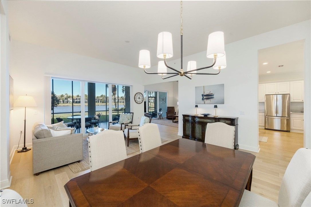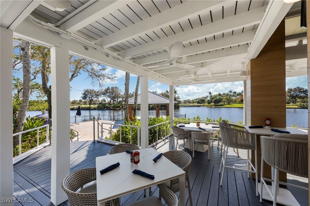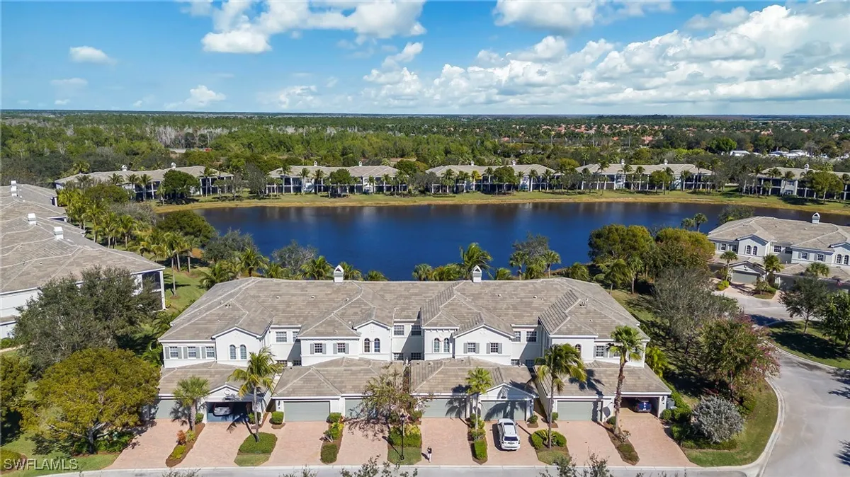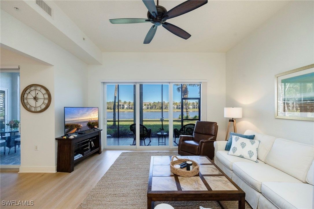 A welcoming courtyard sets the tone for this beautifully updated 3-bed/3-bath Laguna coach home where tasteful upgrades and a serene lakefront setting converge. Light quartz countertops and stainless-steel appliances anchor the updated kitchen, which opens to the living area for effortless entertaining and everyday living. Natural wood floors in the main living areas, soaring ceilings, and plantation shutters throughout create a bright, coastal ambience. The oversized screened lanai, newly tiled, extends the living space and captures stunning wide water views—ideal for morning coffee or gatherings with friends and family. Privacy and peace of mind are evident throughout: the community’s roofs have been replaced, as well as new exterior paint and fixtures and install of new hurricane-impact windows, sliders and doors provide security and energy efficiency. Additional home monitoring and safety features installed in the unit include a new MyQ video garage door opener and program and temp monitoring system on the refrigerator and ring doorbell for added security and peace of mind when away from home. This unit is literally steps from the community pool yet enjoys a quiet location. BONUS: This unit's CDD is PAID OFF! Owners in Laguna also benefit from a responsive HOA with strong reserves. Beyond the neighborhood, Fiddler’s Creek provides resort-style amenities—tennis, pickleball, bocce, state-of-the-art fitness facilities, spa services, an expansive clubhouse with both casual and fine dining, and optional memberships for championship golf, Tarpon Club beach access and marina privileges. Nestled between Marco Island and downtown Naples, this property offers a blend of luxury, convenience and the coastal lifestyle buyers seek.